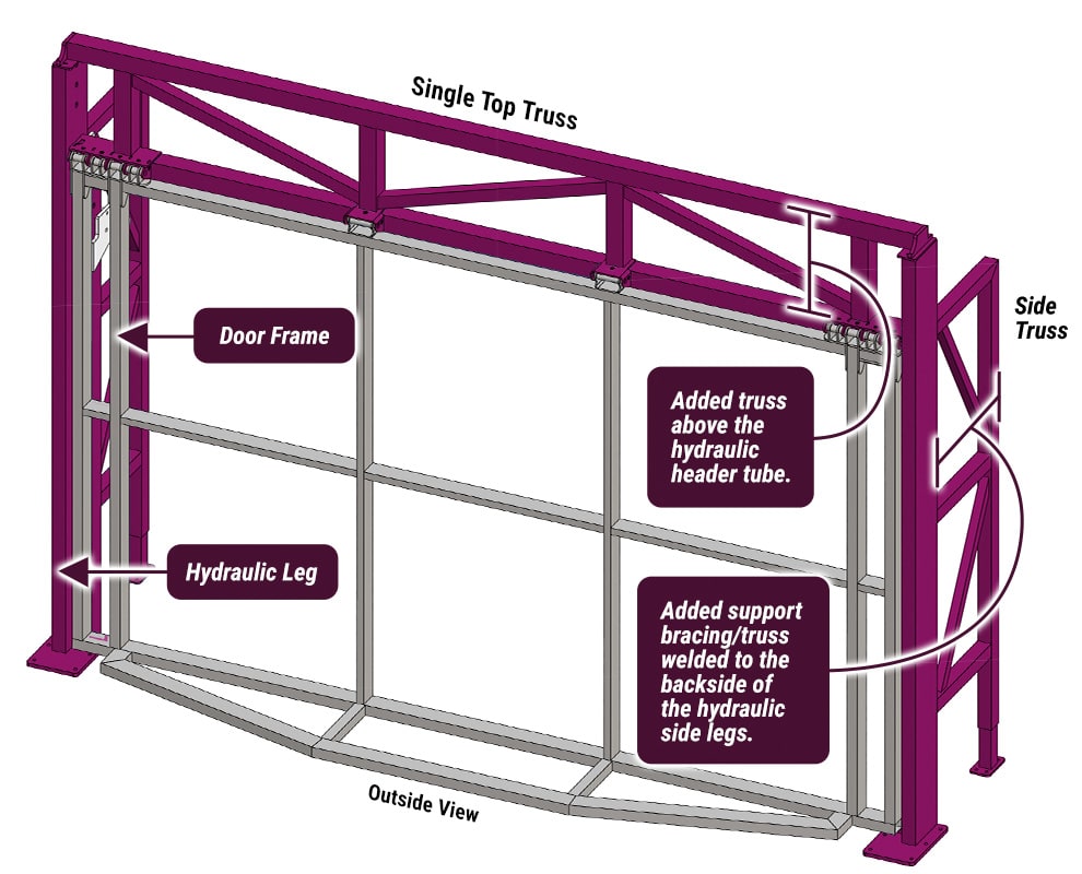 The larger the door the more building support it needs, putting substantial responsibility on your building company to properly design your building to accept a bifold or hydraulic door. Let Schweiss Doors help you with Stand-Alone framework!