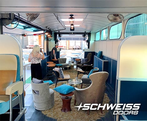 Federales vacation atmosphere features a fully retractable roof and two Schweiss bifold liftstrap 14' 3" x 14' 8" designer doors that open to their beer garden.