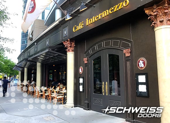 Schweiss doors was approached to replaced existing roll up doors at Cafe Intermezzo in Atlanta, GA. The old doors were failing and the top pivoting rods were broken.