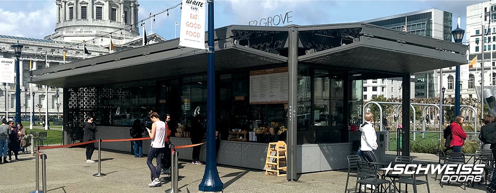 Five Lift Stap Bifold Doors were installed on a coffee and ice cream shop kiosk on the sidewalk in front of the mayors office in San Francisco.