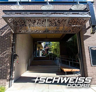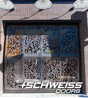 Adding to the historic look of the building are two custom-made decorative Schweiss bifold liftstrap designer doors; one of which is 11' 10" x 11' 11" and another at 11'1" x 10' 1." Instead of the conventional metal, glass or wood exterior cladding, these doors have a decorative steel exterior 12 gauge steel cladding that blends in very nicely with the exterior brick of the apartment building.