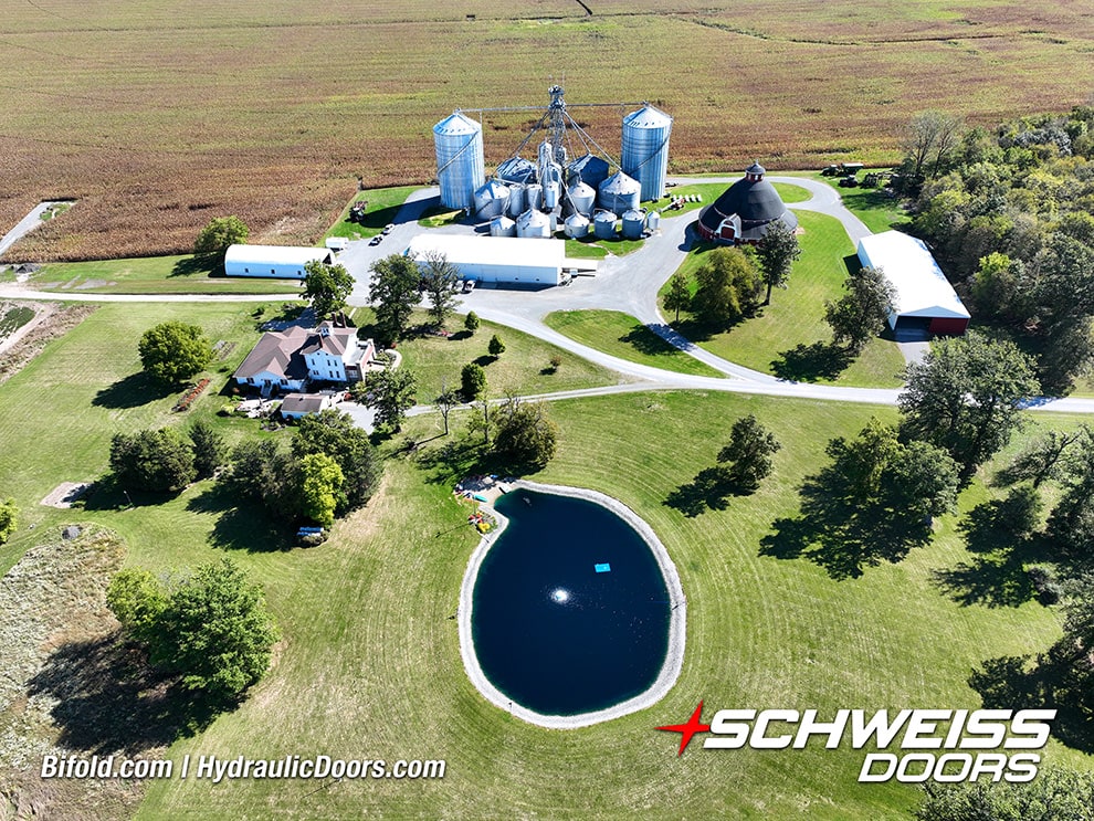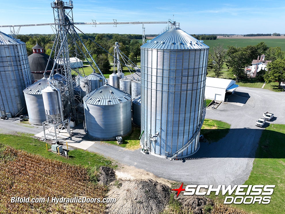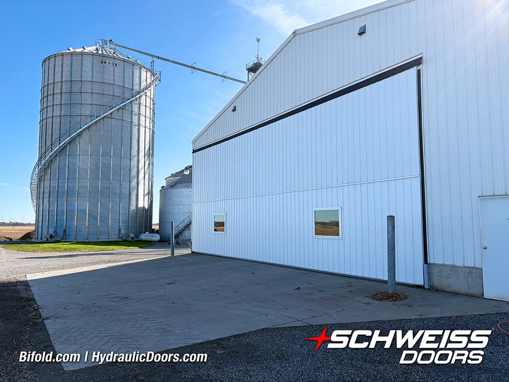 Why Choose One? Generational Seed Company Uses Both Bifold and Hydraulic Doors to Build for the FutureThe Thalmann Seed Farm property showcases some essential differences between bifold and hydraulic doors - as they own one of each from Schweiss. They utilize their 40ft x 20ft Schweiss bifold on the North side of the building where they get more snow. The door is equipped with a bottom-drive liftstrap system, 6 liftstraps, automatic strap latches and a complete weather seal kit. The 50ft x 20ft Schweiss hydraulic door is utilized on the South side of the building where they plow snow more frequently. The door features four windows. |