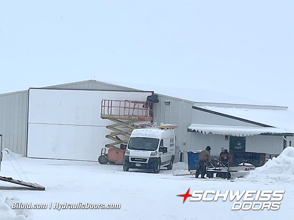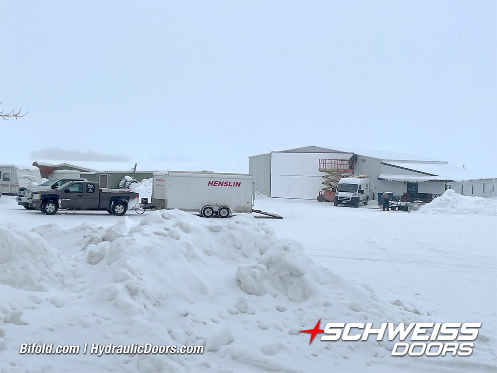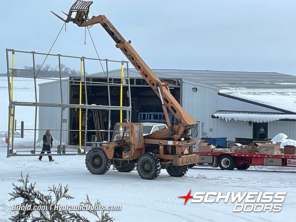 Through the cold and snow, the installation crew from Schweiss Doors installed the 29 foot wide bifold door on the large shop building belonging to Nathan Cole.