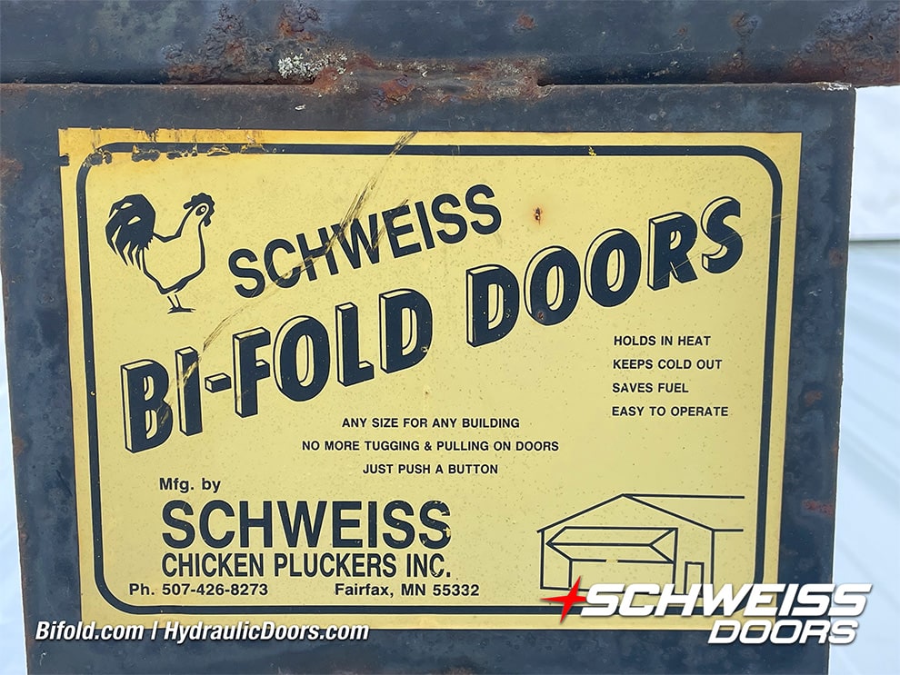 The Schweiss decal was still in good condition on Nathan Cole's old bifold door. Schweiss got its start by making and marketing chicken pluckers, but soon its bifold doors took over.