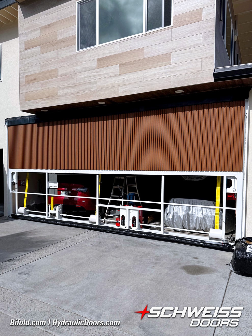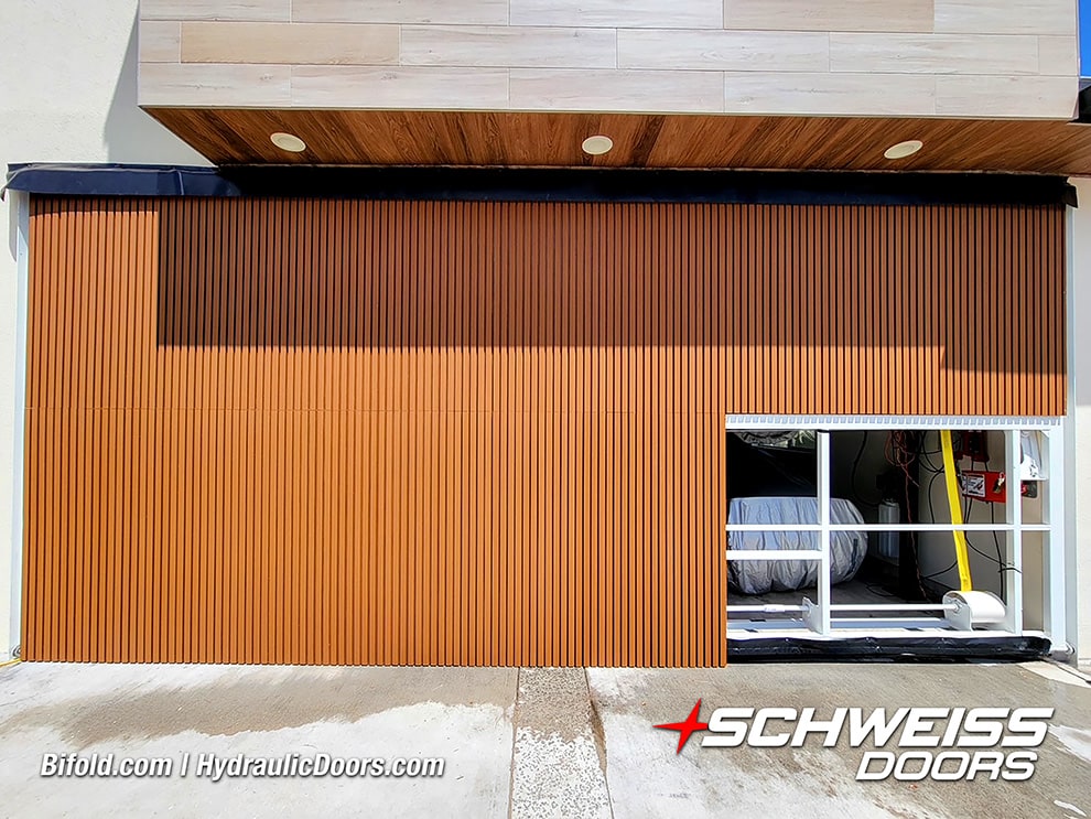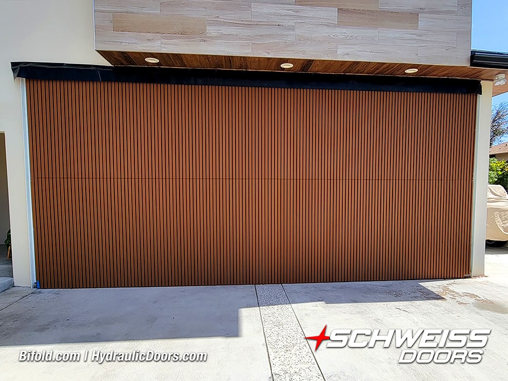 This 30 ft x 8.9 ft Schweiss hydraulic door in Brentwood, California was cladded with beautiful FEQ Burmese teak wood known for its lovely golden brown color. The 2.5 in. thick teak cladding on the outside and a high-end 3/8 in. birch plywood and cedar liner on the inside added an additional weight exceeding 1,050 lbs., requiring a strong source of power to lift it - the powerful Schweiss hydraulic cylinders and Red Power pump easily lift and lower the door quickly, quietly and safely. The door also included photo eye sensors and remote openers. The customer couldn't be happier! |