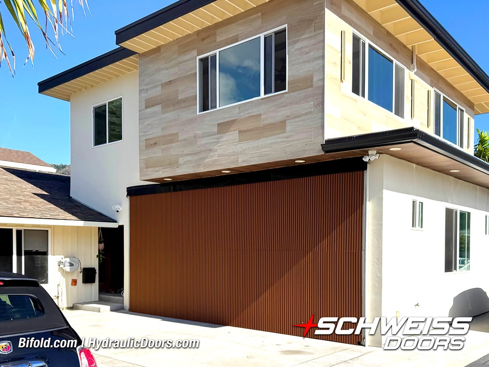 Alex Eskin of Honolulu, Hawaii made the decision to order a Schweiss bifold door for his newly built garage for his home. Eskin really wanted the most headroom in his garage as possible including ceiling height and the clear opening for the door. This, along with his familiarity with Schweiss Doors due to being a pilot, is what eventually pushed him to get a 22ft and 5 3/4in by 8ft and 9 3/4in Schweiss bifold lift strap door. Eskin really wanted the most headroom possible so he could put a car lift in his garage to fufill his automobile hobbyist wants and needs. |