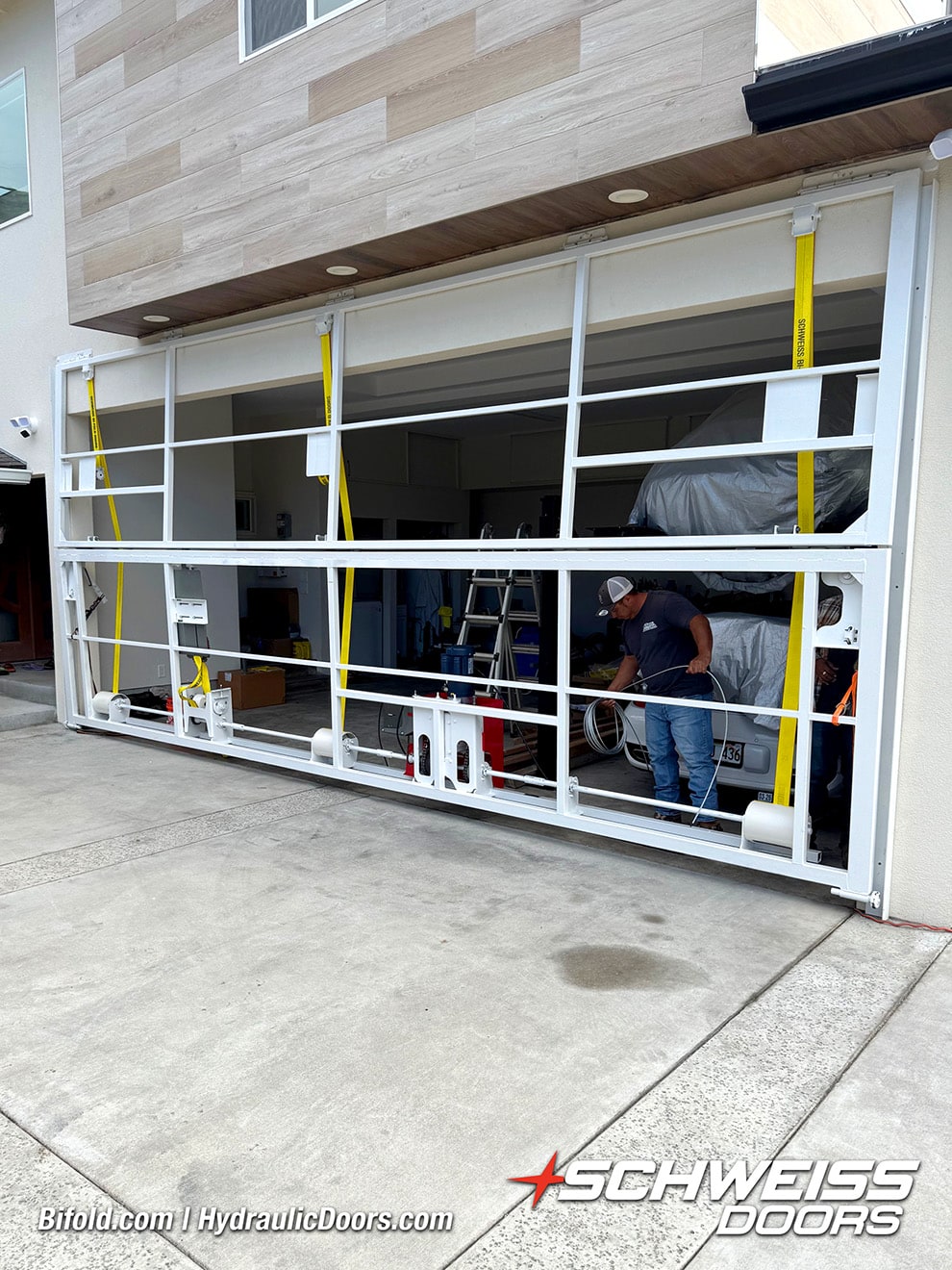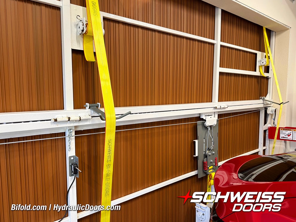 As space was at a premium, Eskin wanted to make sure he preserved every usable inch of room he had in his garage, including ceiling height and the clear opening for the door. This is the main reason why he decided to install a Schweiss Doors lift strap bifold door, one that measures a very precise 22-feet and 5 ¾-inches wide by 8-feet and 9 ¾-inches high.