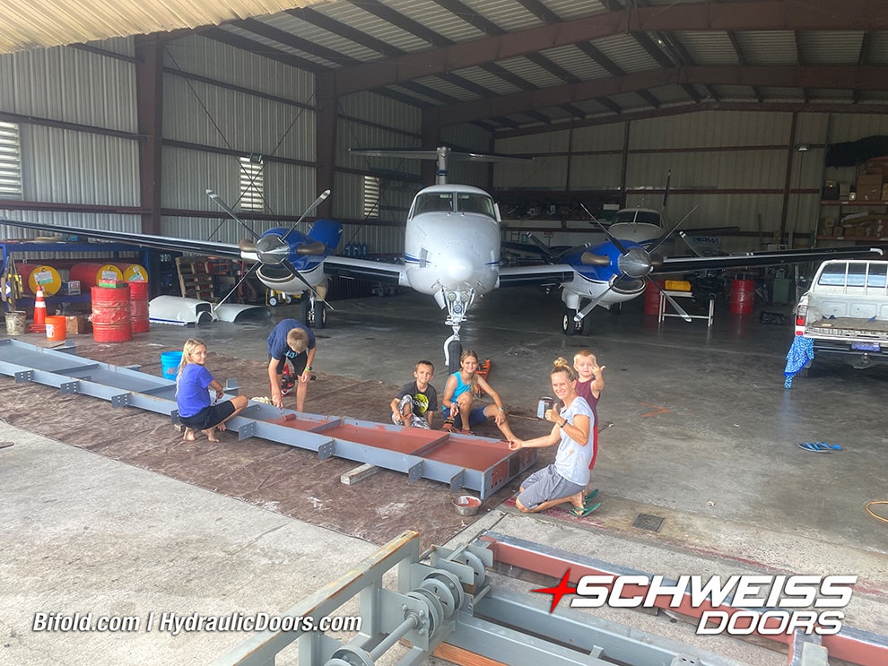 Working on a remote island can make construction projects a bit challenging. It took some ingenuity, but the team at PMA were able to get the bifold door installed on the newly extended airplane hangar.