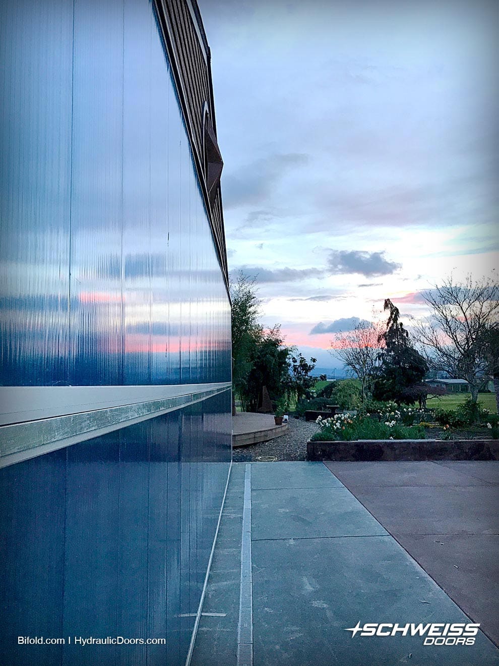 A beautiful Oregon sunset reflects off the 40mm Lexan Polycarbonate clad bifold door that was set in precisely by Weitman during the installation process.