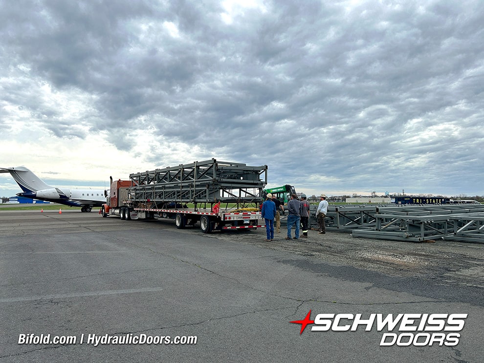 The large Schweiss bifold doors arrived at the airport on a flatbed truck. The crew from Groome Industrial were prepared with the right equipment to unload the door panels.