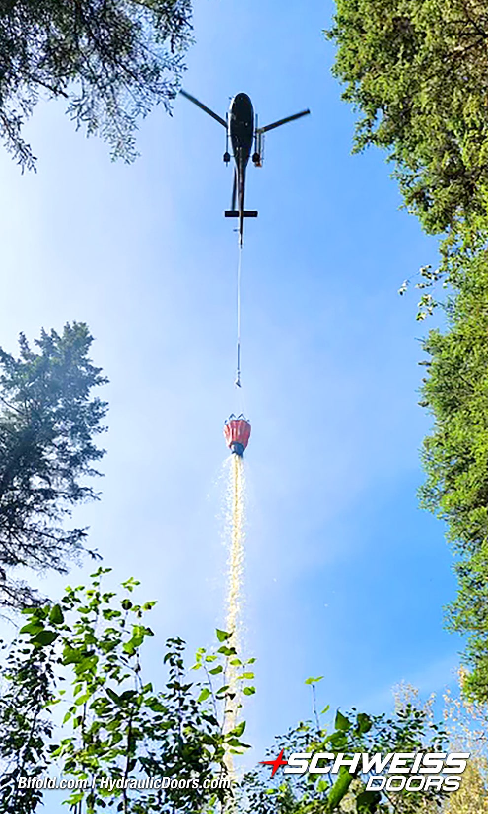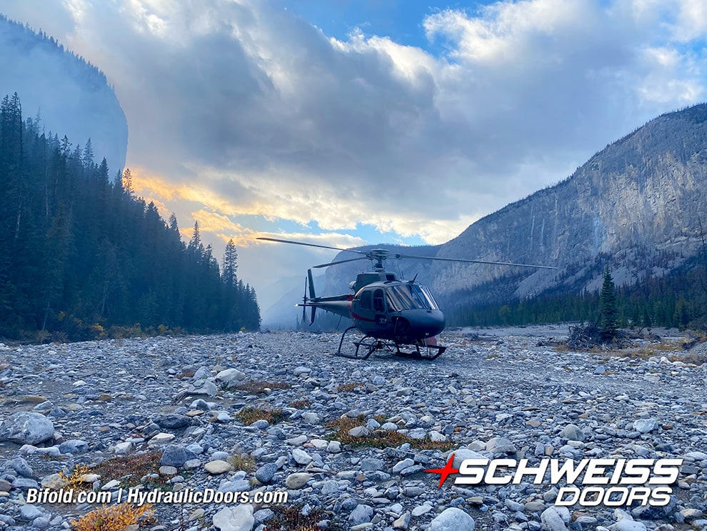 Playing an important role during this busy time, and throughout the year, is Switchback's 13,000 square foot hangar and its 60-foot by 19-foot Schweiss Doors lift strap bifold door. The hangar provides storage and maintenance space for the aircraft while the bifold door makes it easy to move the helicopters in and out quickly as duty requires.