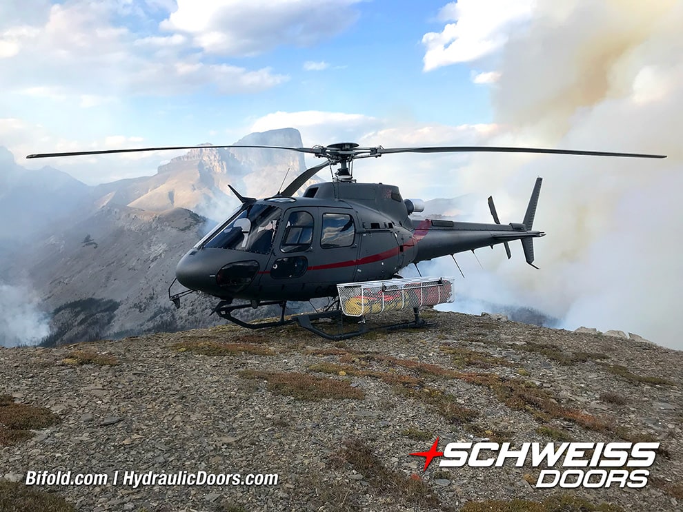 Switchback Helicopters in Calgary, Alberta ferries people and equipment during Canadian wildfire season, also hauling water buckets that hang from below the helicopter to attempt suppressing the fires. To store their helicopters, they have a 13,000 square foot hangar fitted with a 60ft by 19ft Schweiss bifold lift strap door. The door is equipped with the Schweiss automatic strap latch locking system and four windows. Switchback Helicopters knew they wanted a Schweiss door, as the Schweiss door on their old 2,000 square foot hangar never had any problems. |