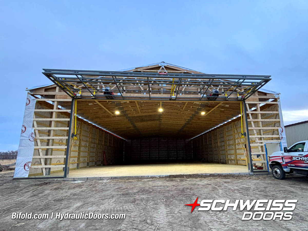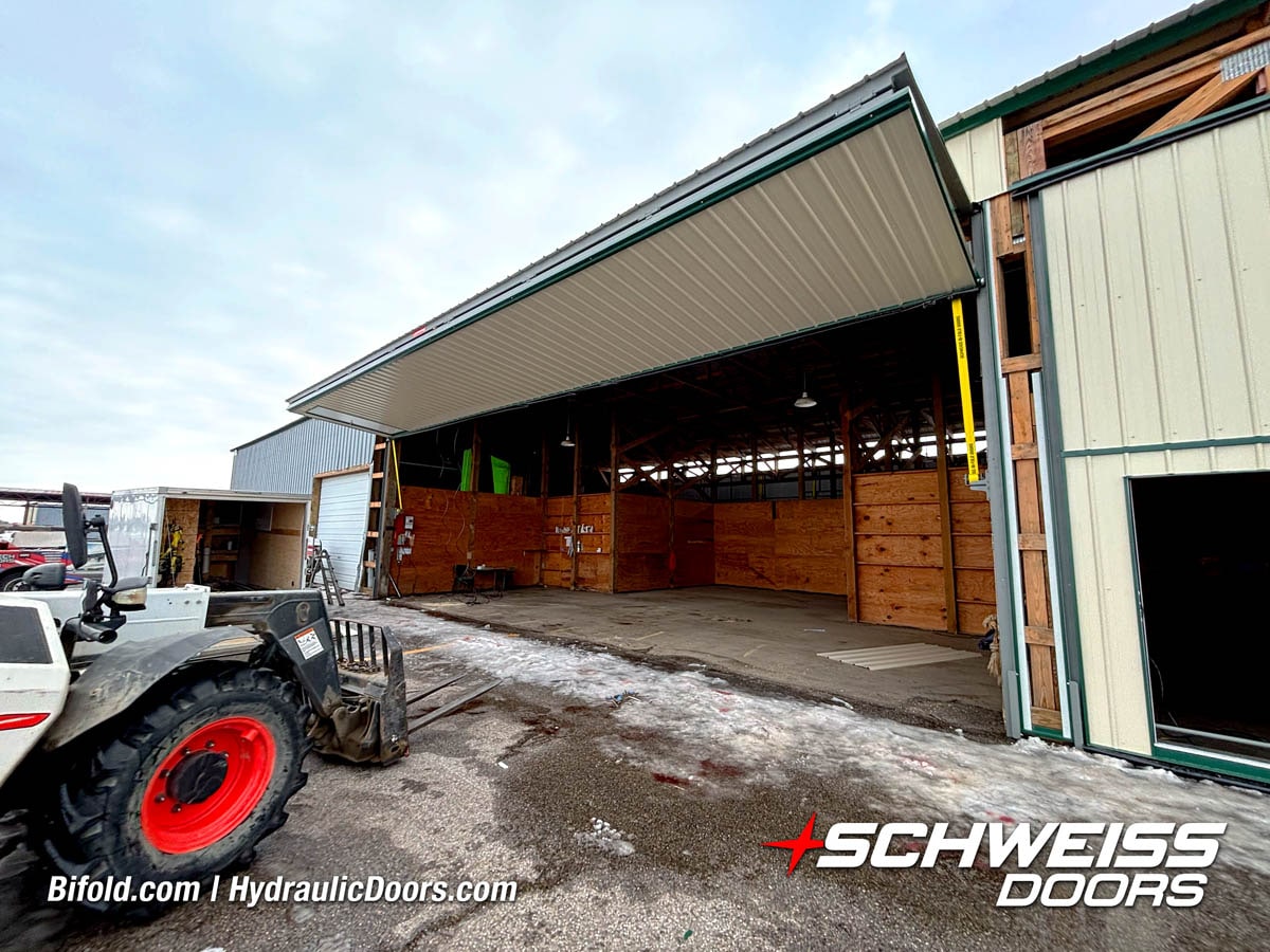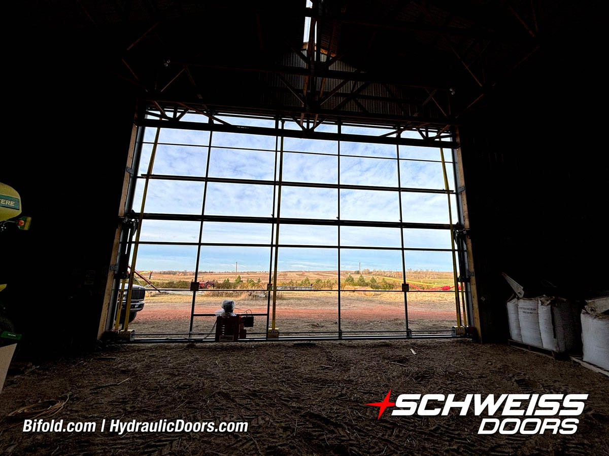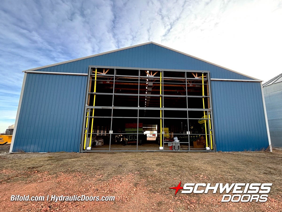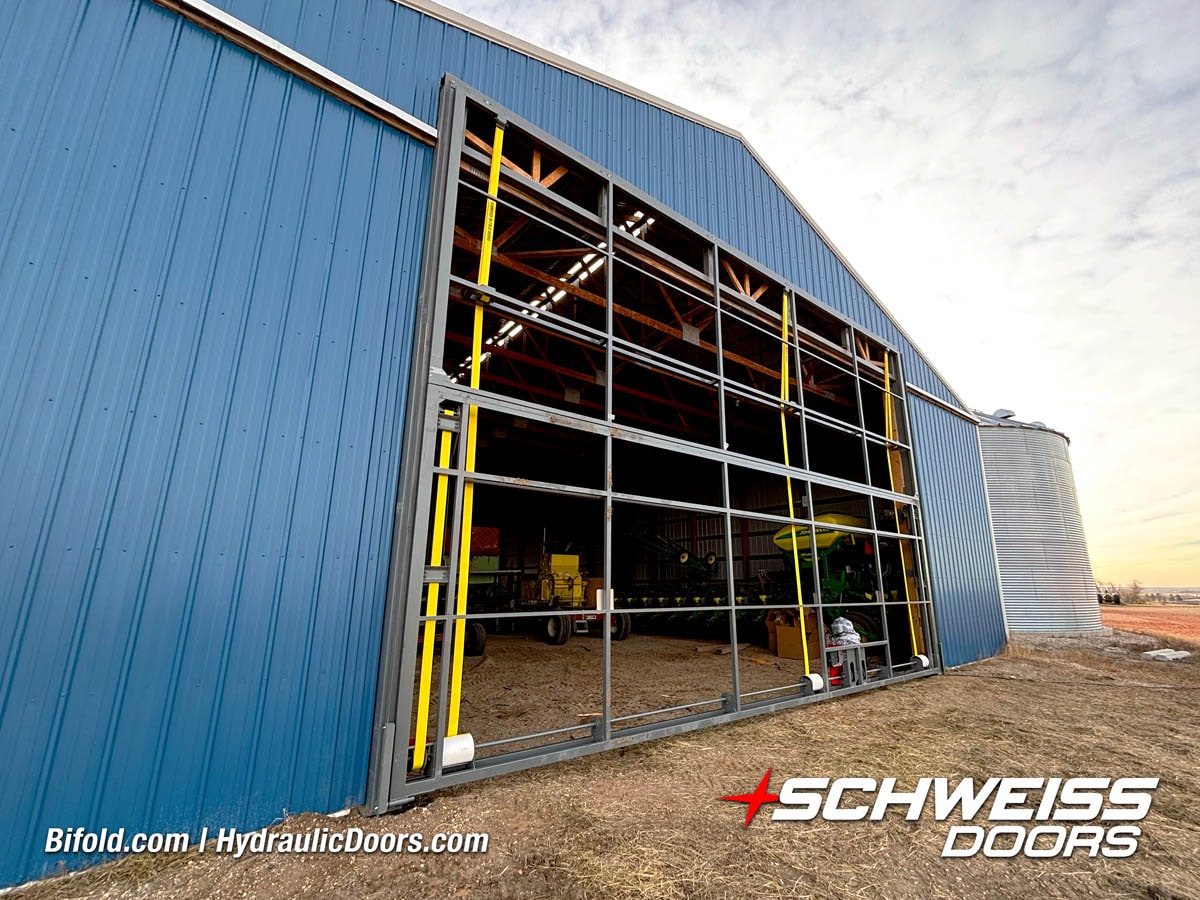 Schweiss bifold agricultural door installed on building at Devitt Farms shown closed