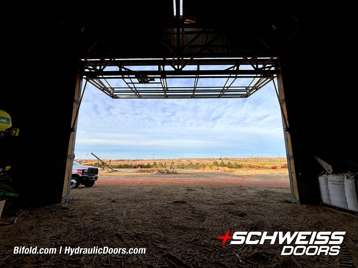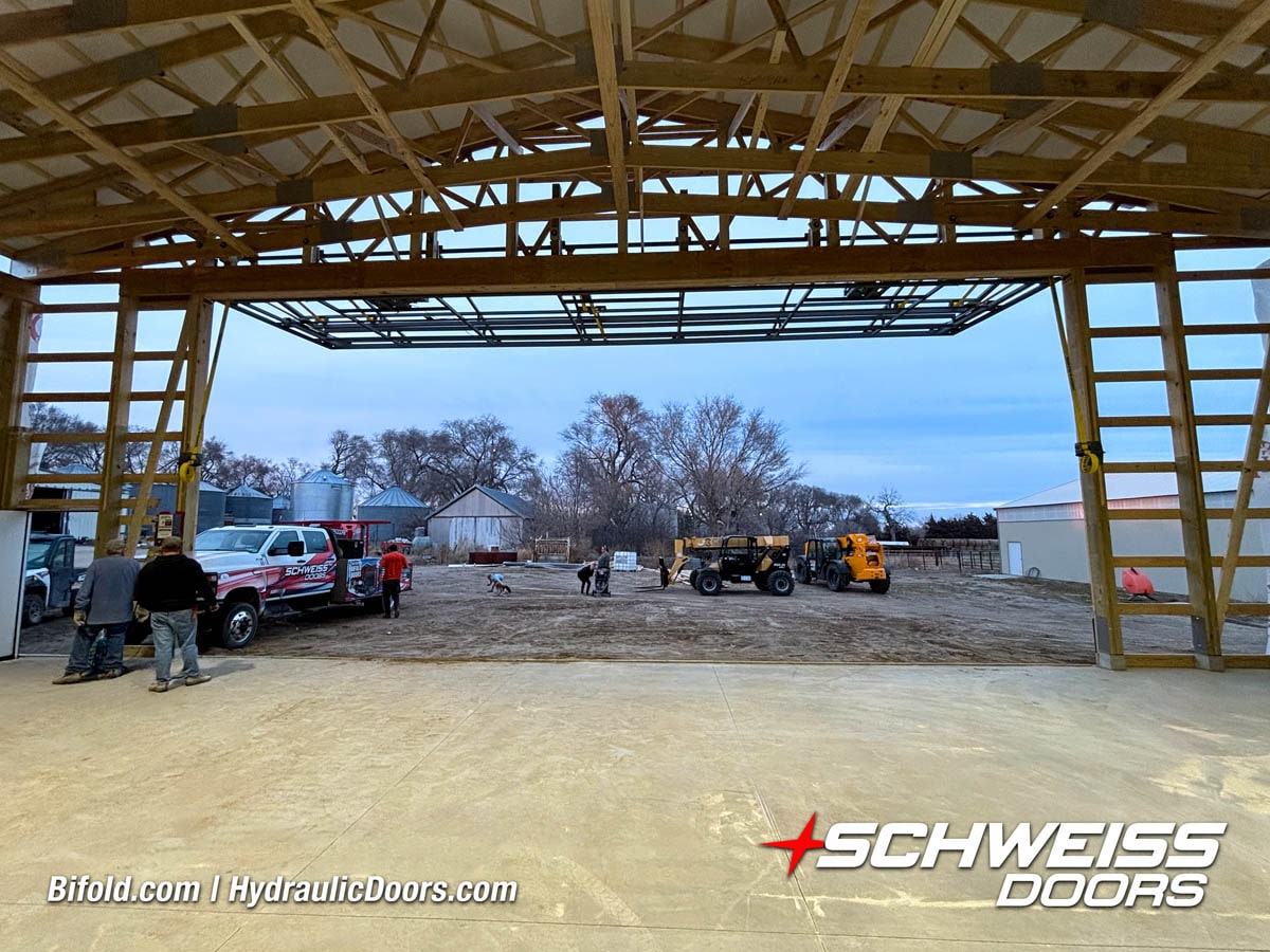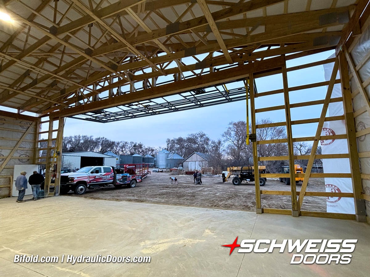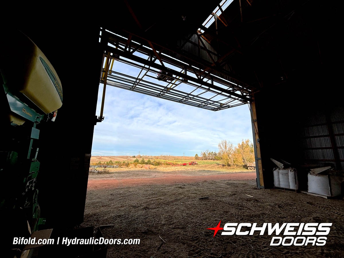 Schweiss bifold agricultural door installed on building at Devitt Farms shown closed