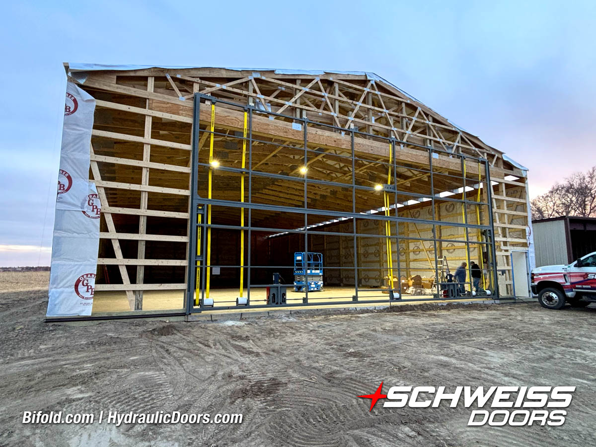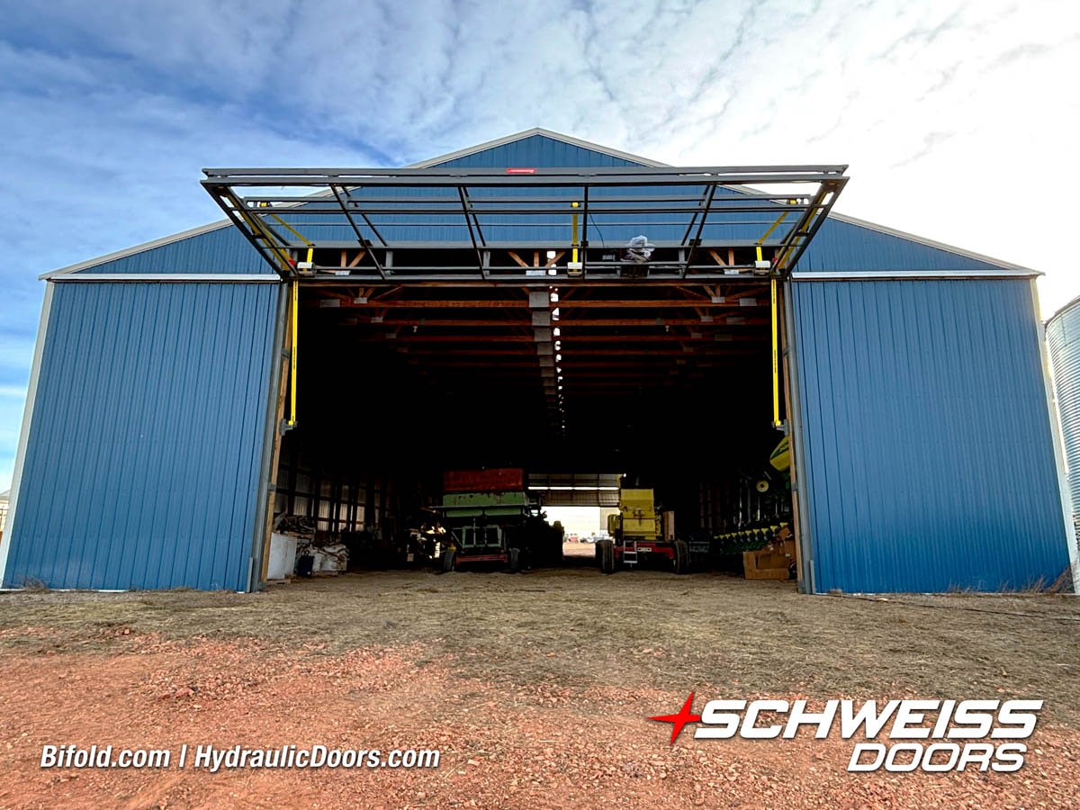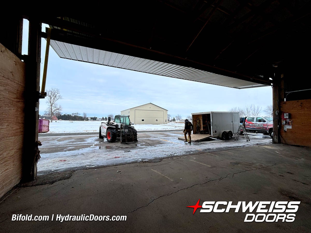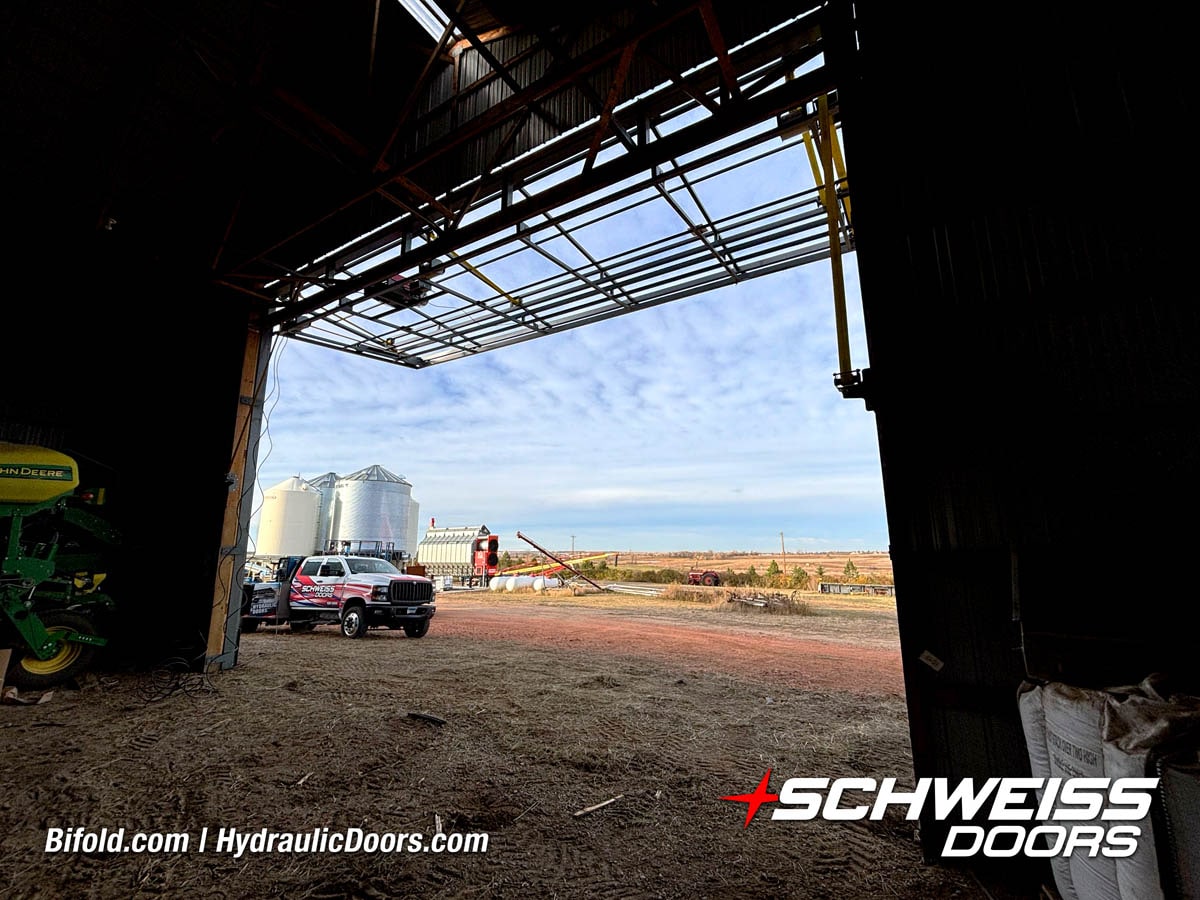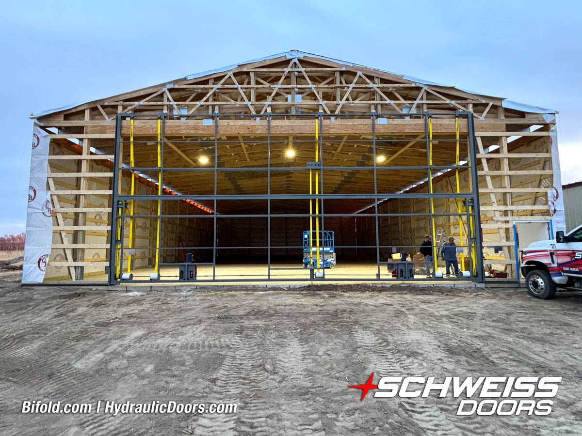 Schweiss bifold agricultural door installed on building at Devitt Farms shown closed