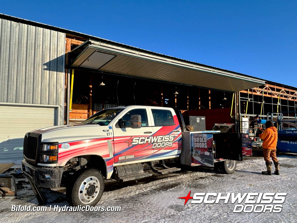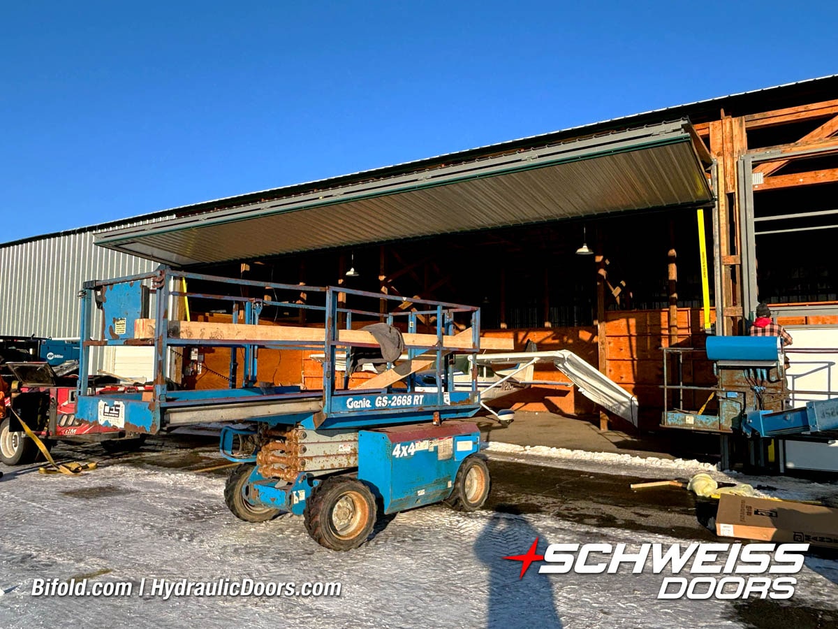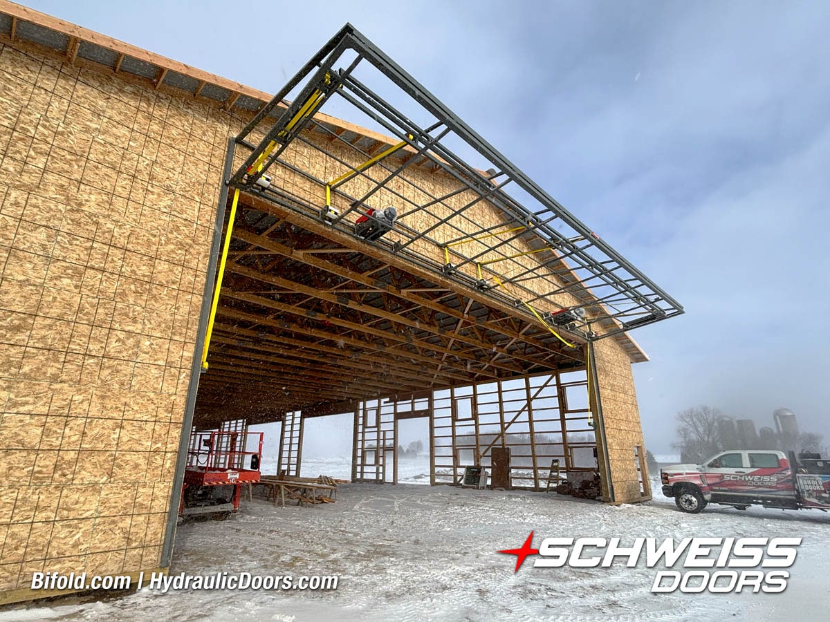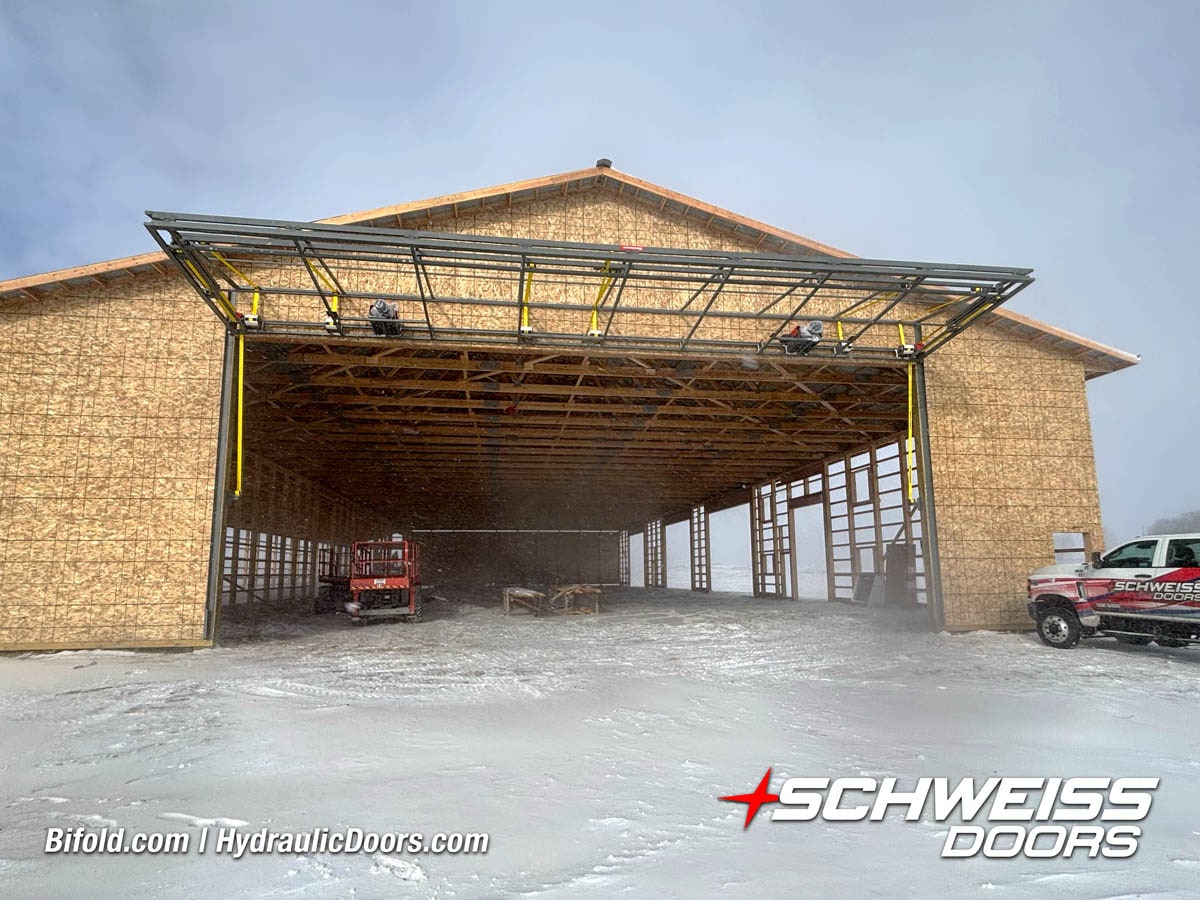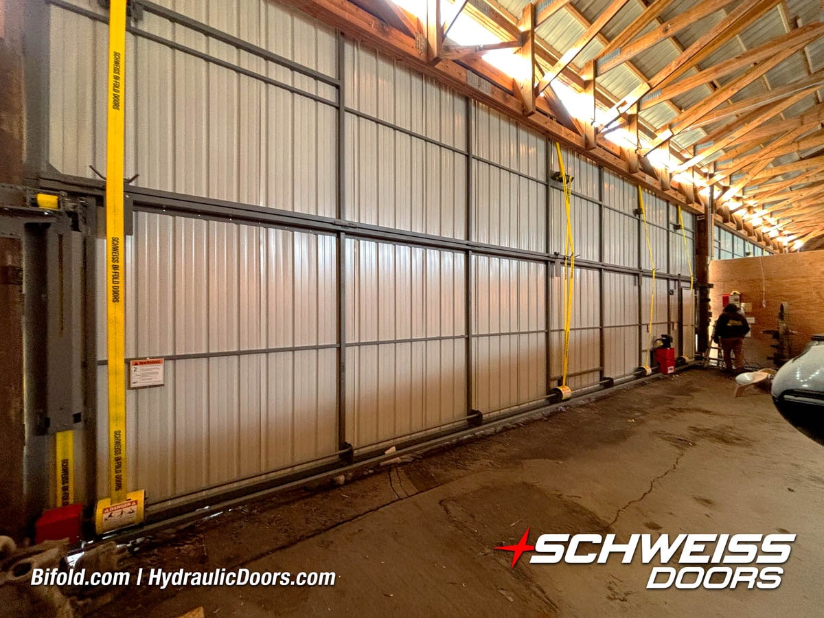 Schweiss bifold agricultural door installed on building at Devitt Farms shown closed