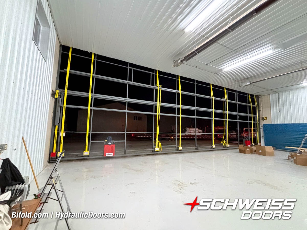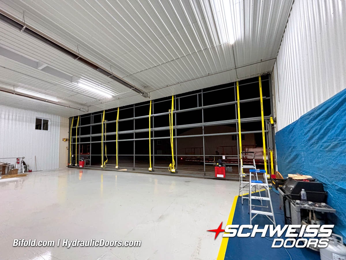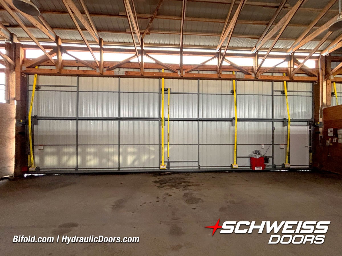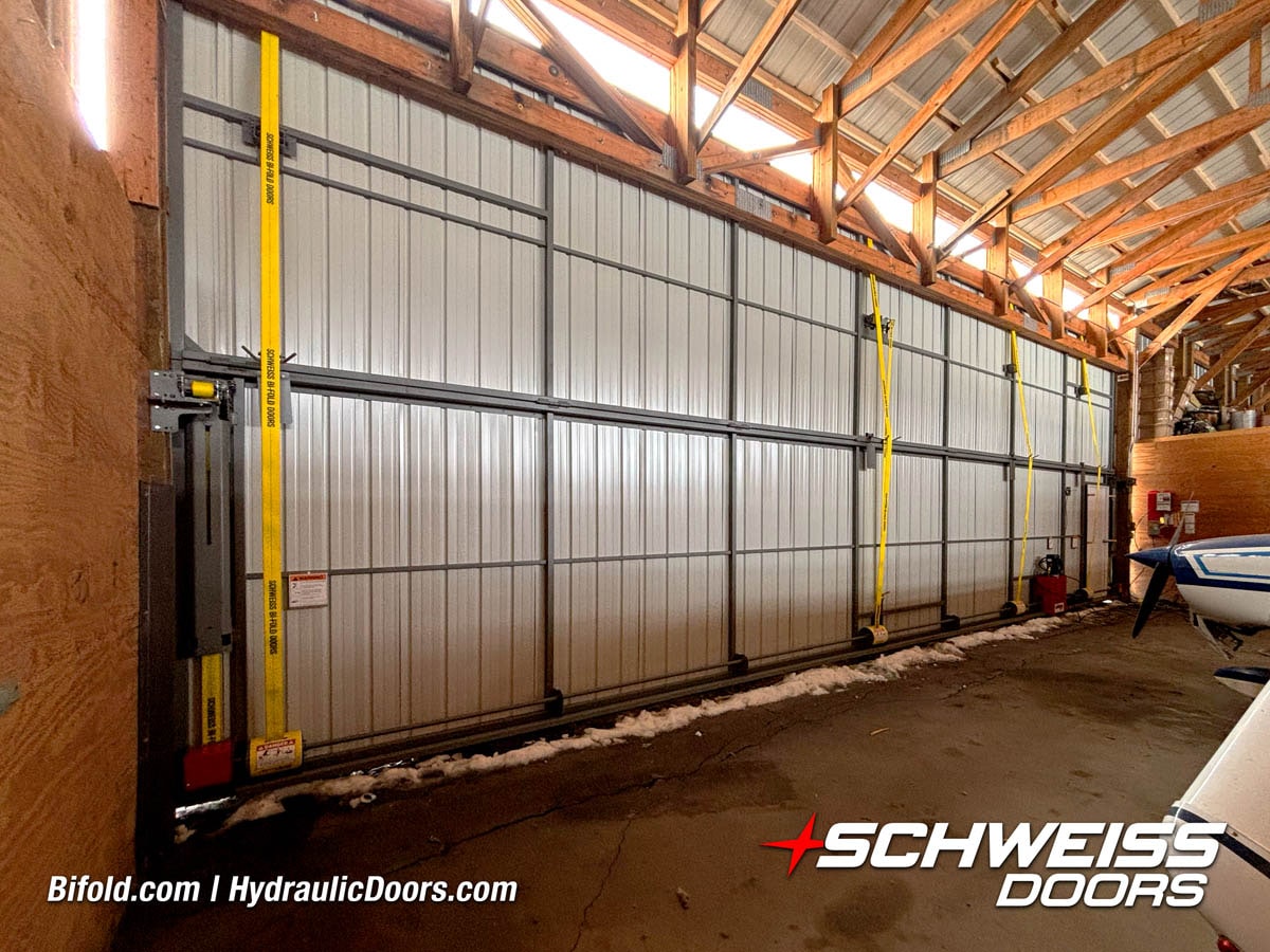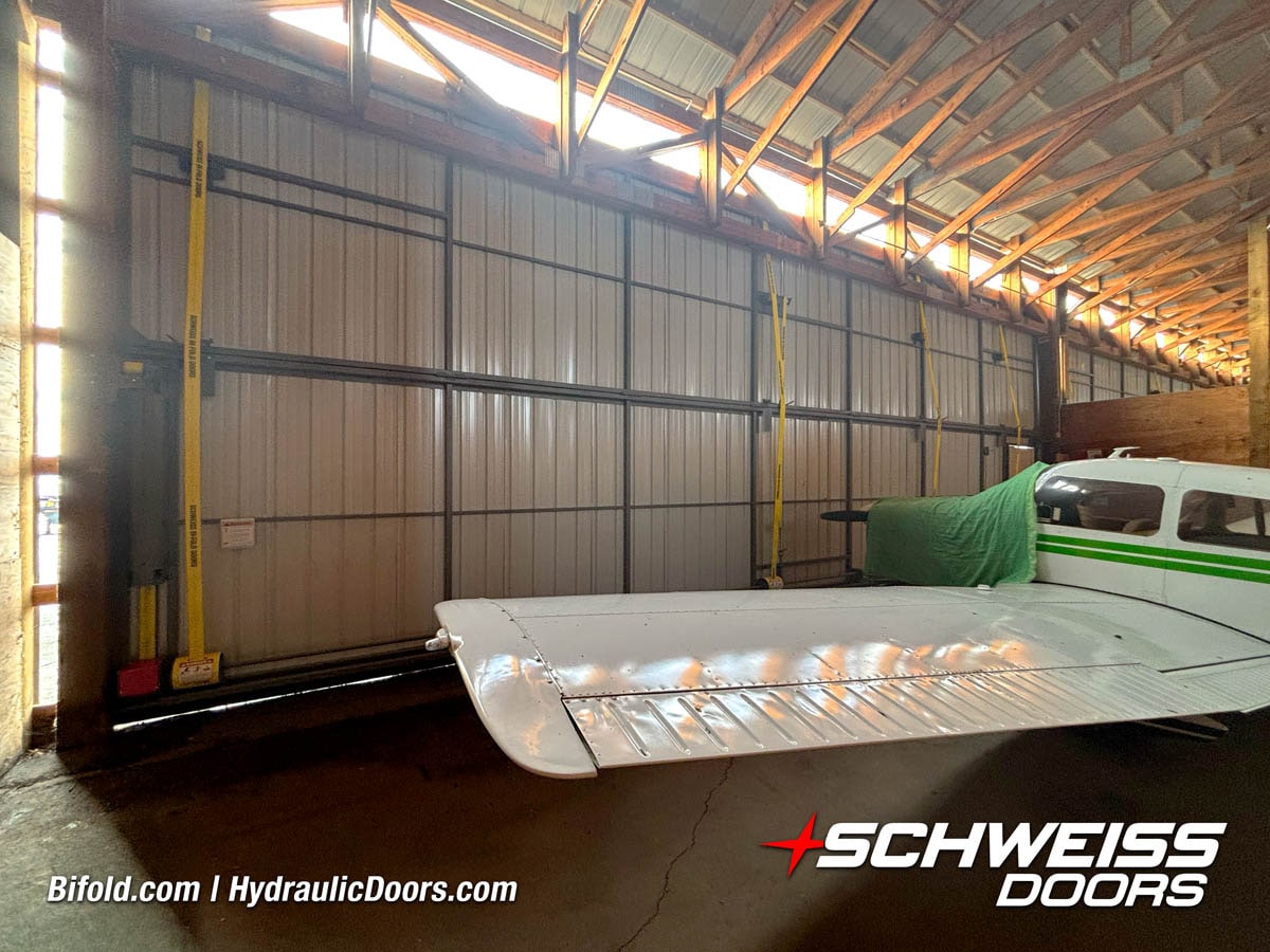 Interior view of Schweiss bifold door installed on a hangar home in Houston shown closed
