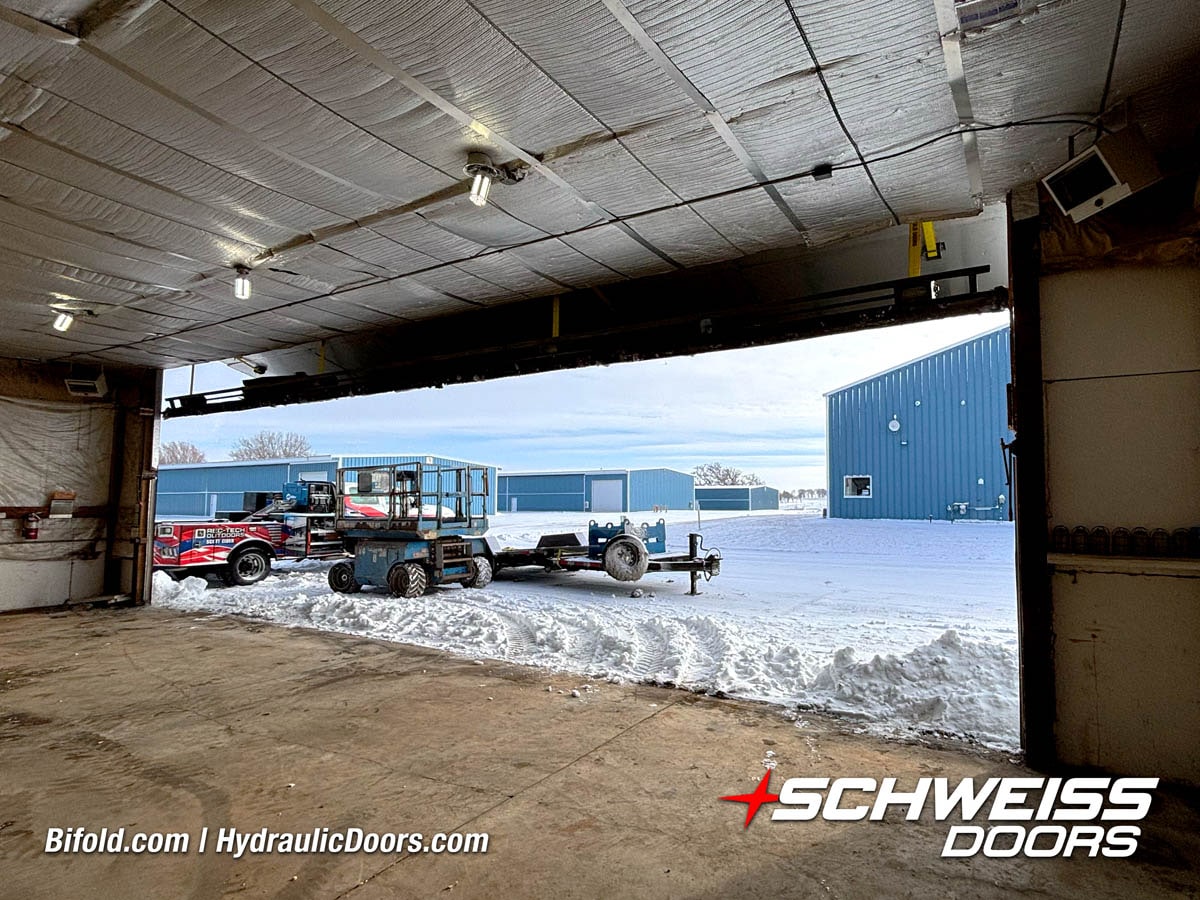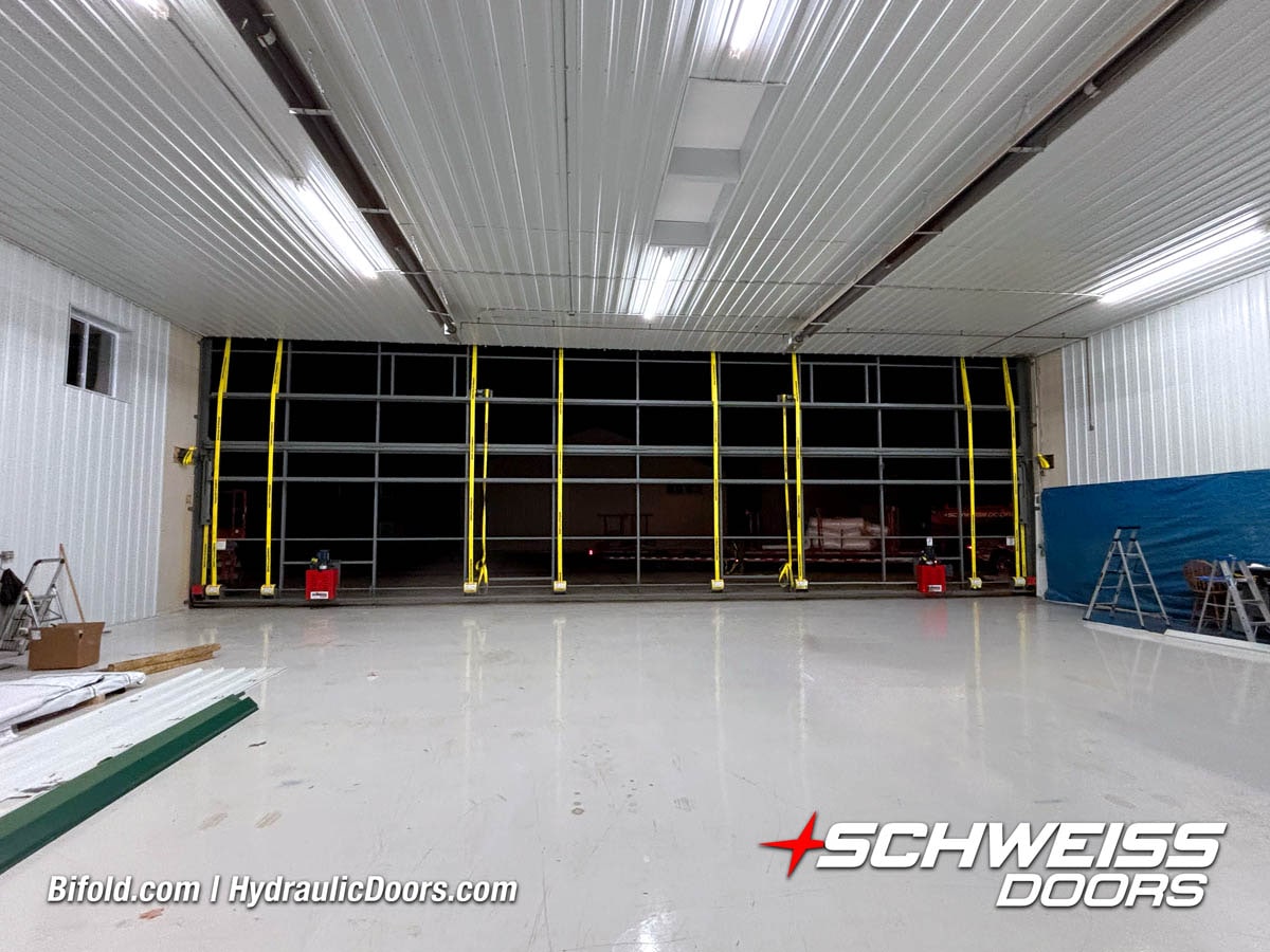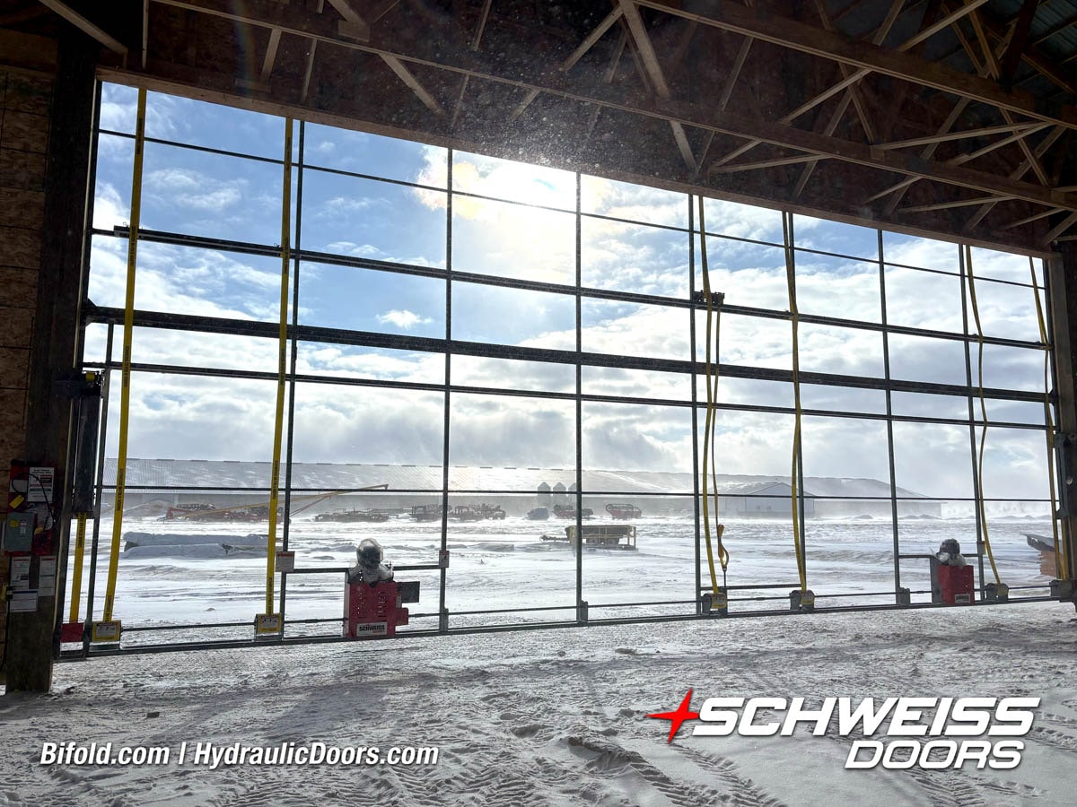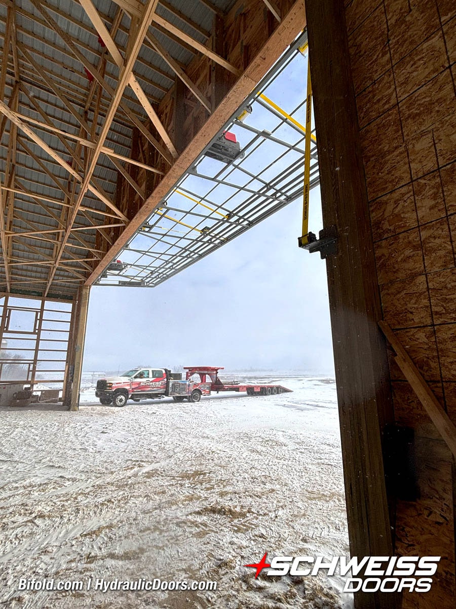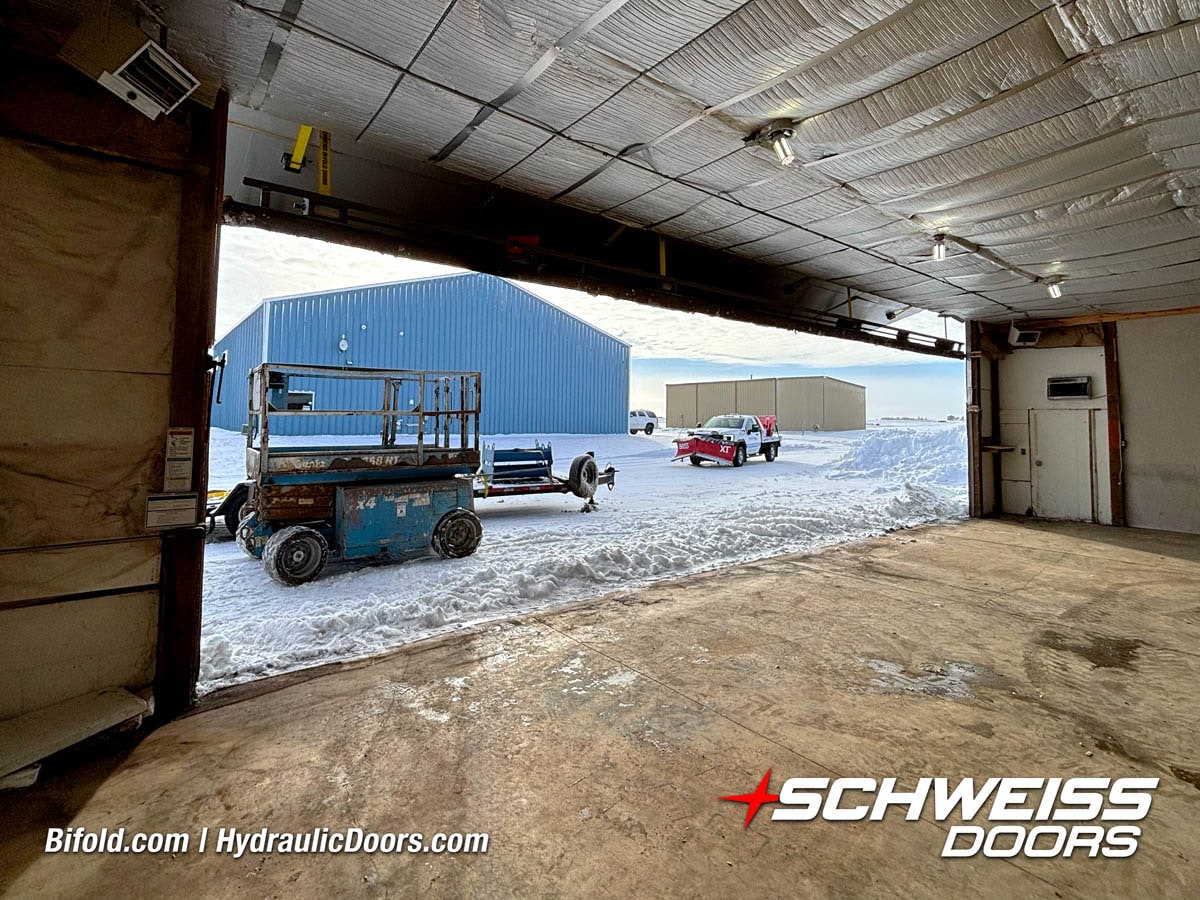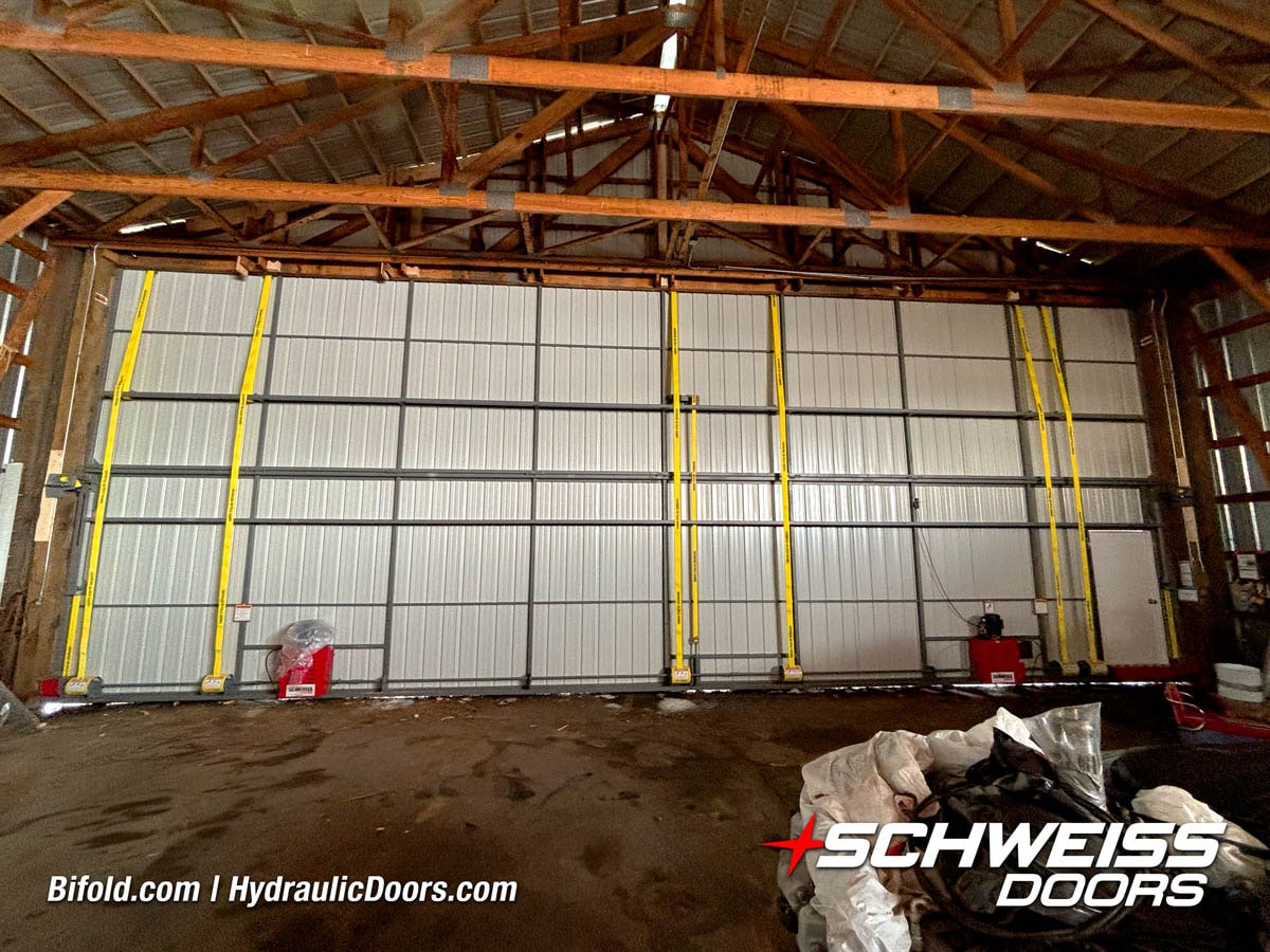 Interior view of Schweiss bifold door installed on a hangar home in Houston shown closed