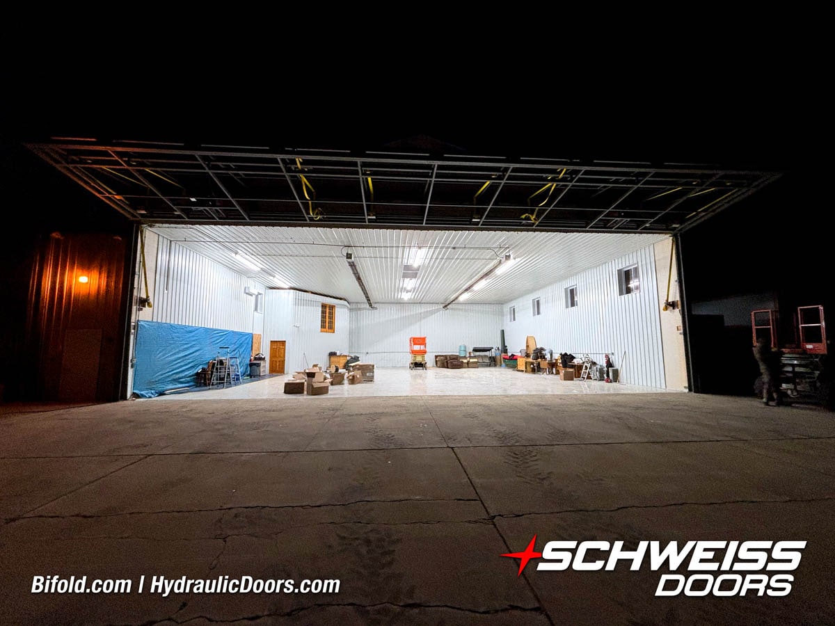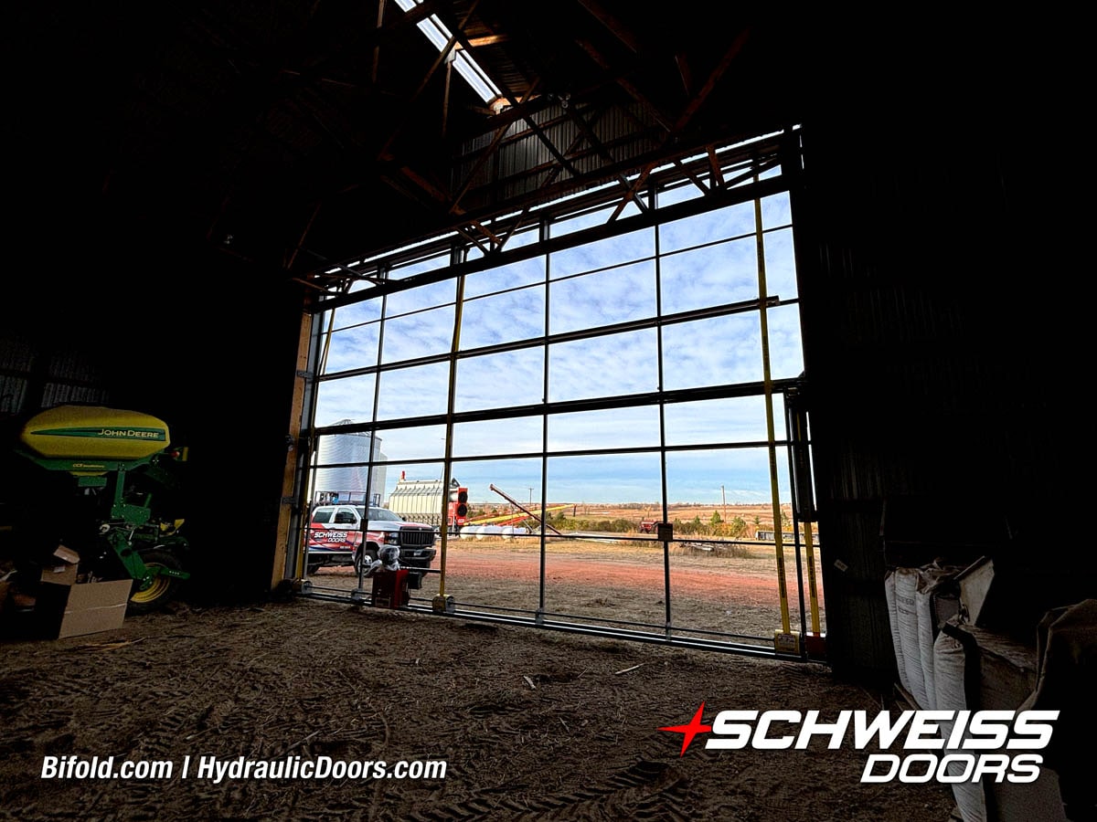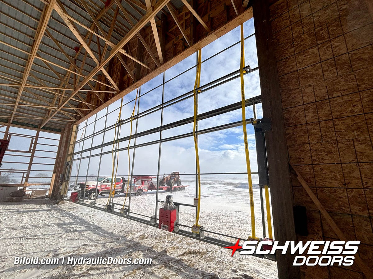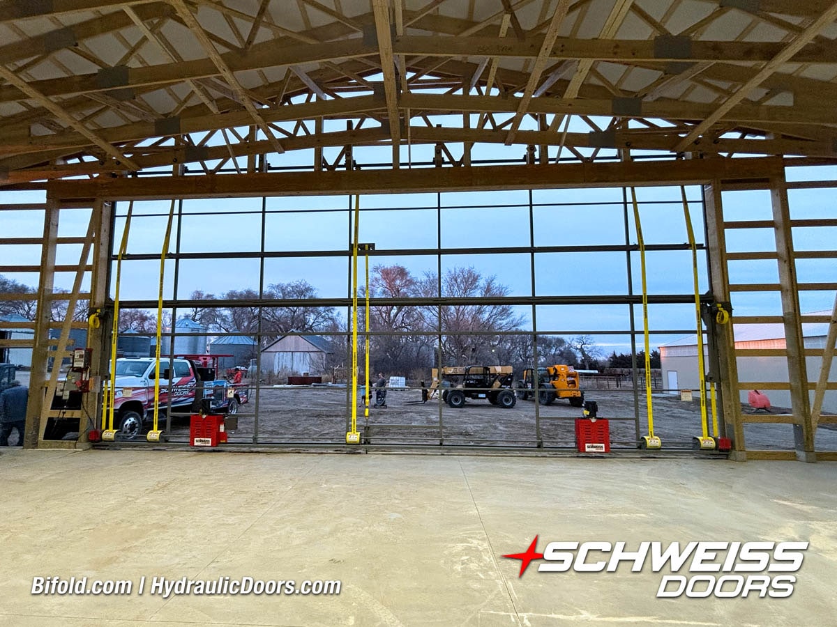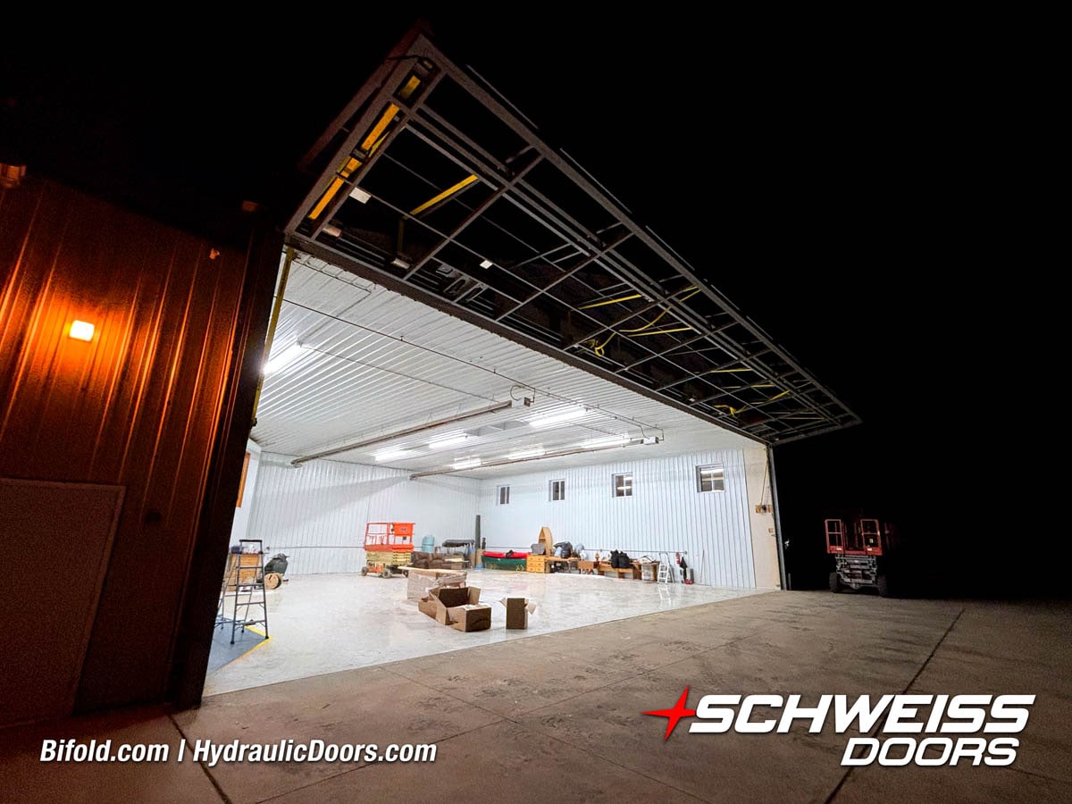 Interior view of Schweiss bifold door installed on a hangar home in Houston shown closed