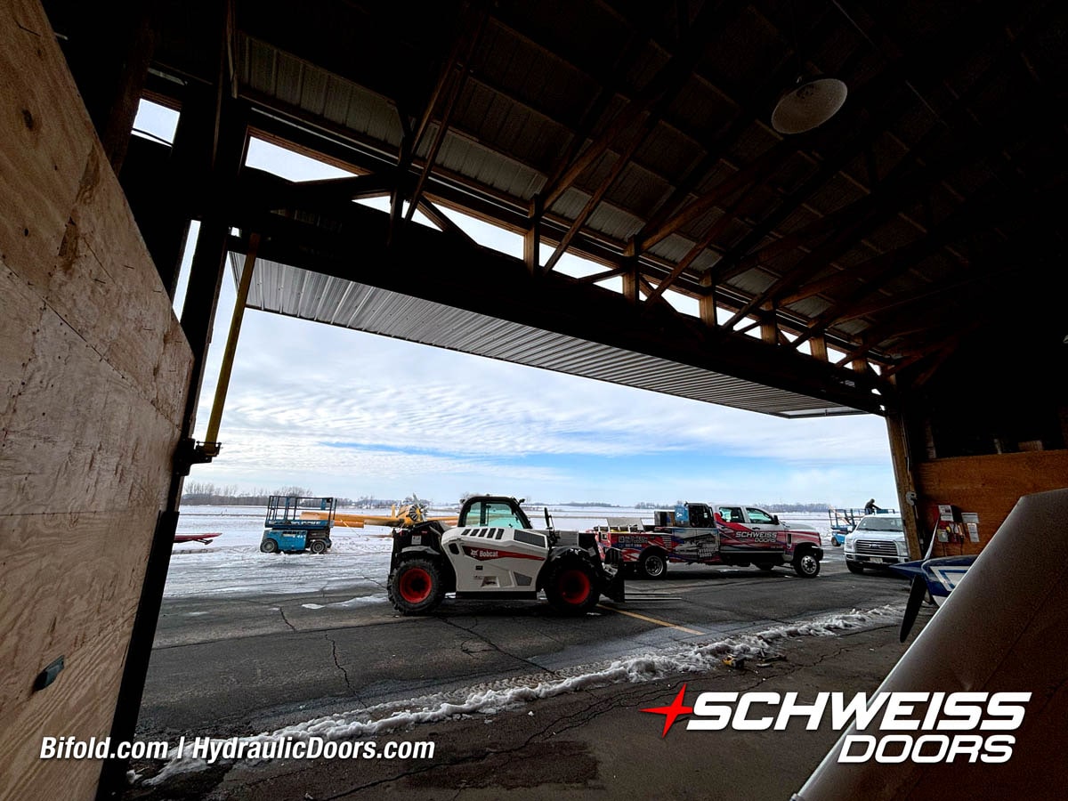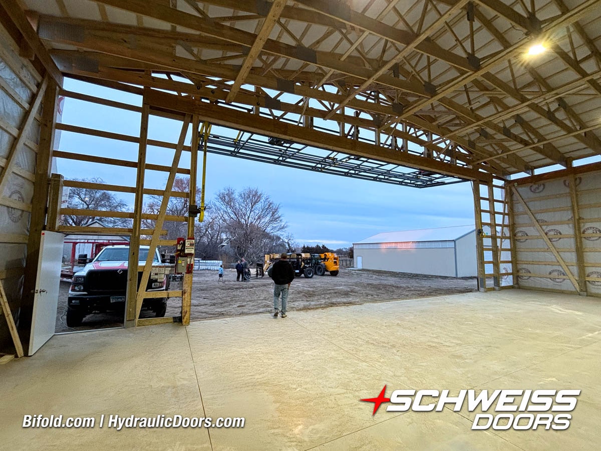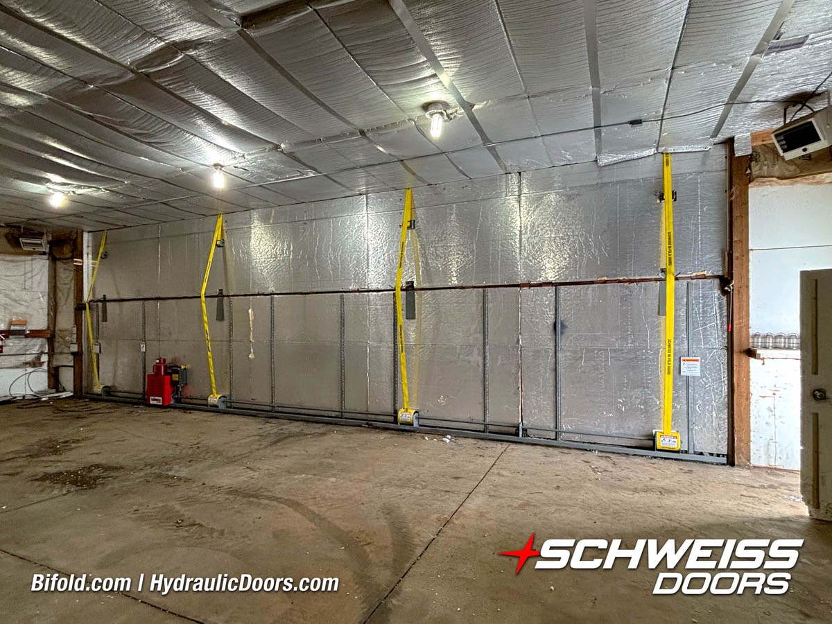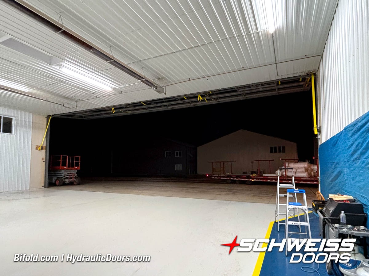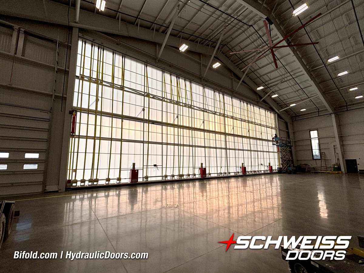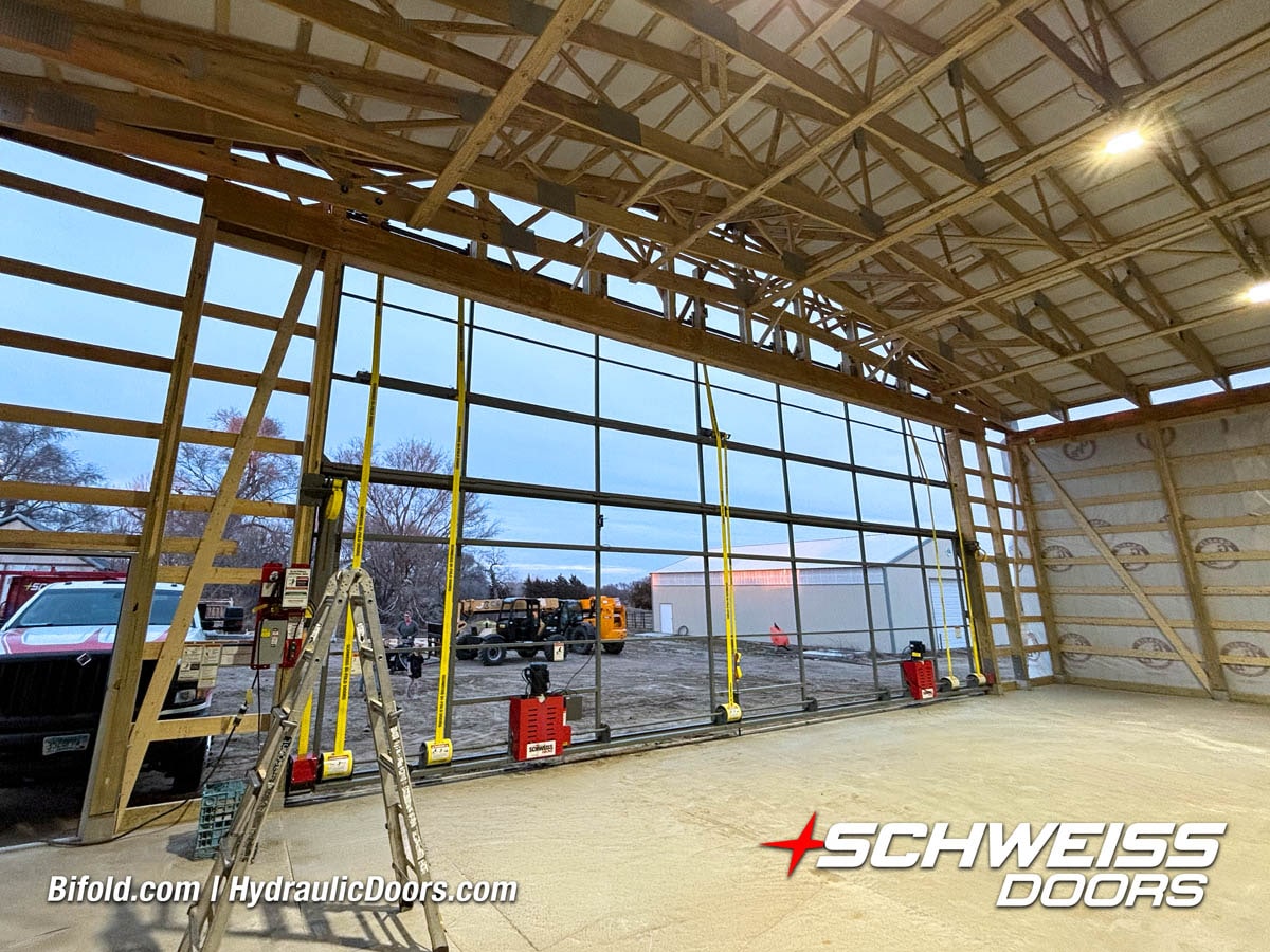 Interior view of Schweiss bifold door installed on a hangar home in Houston shown closed