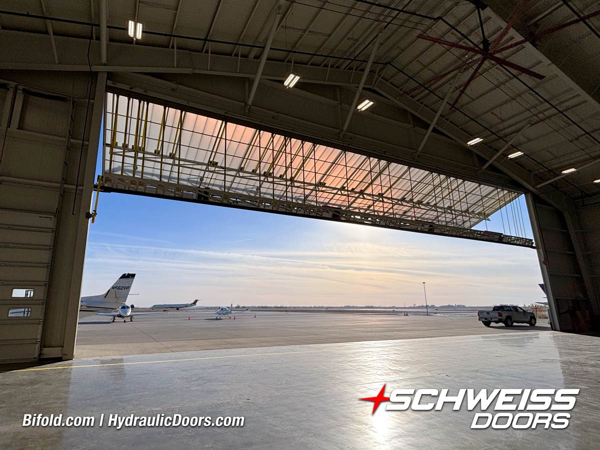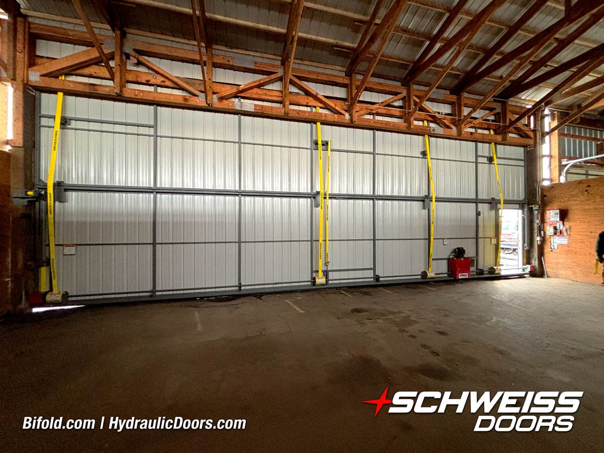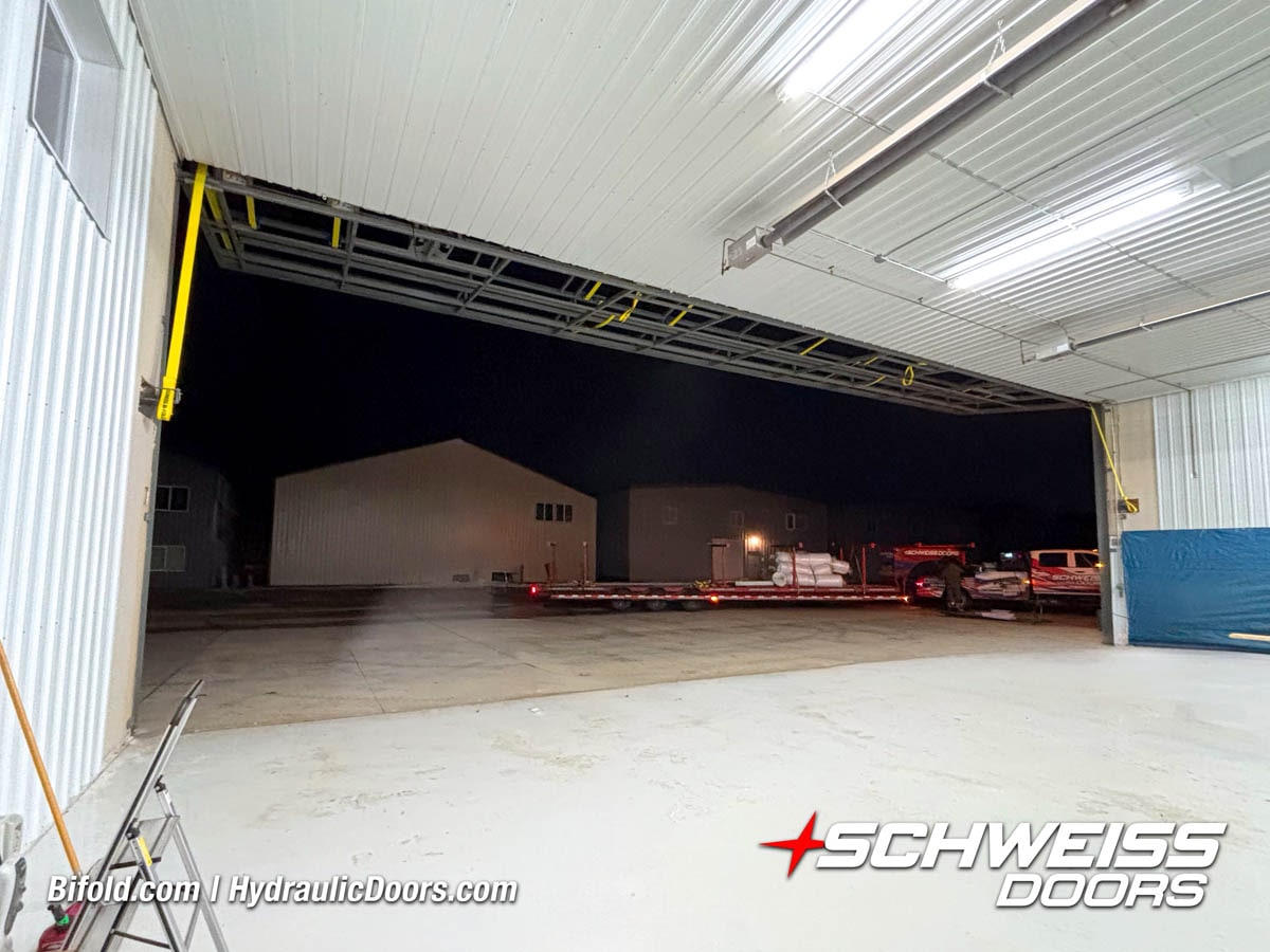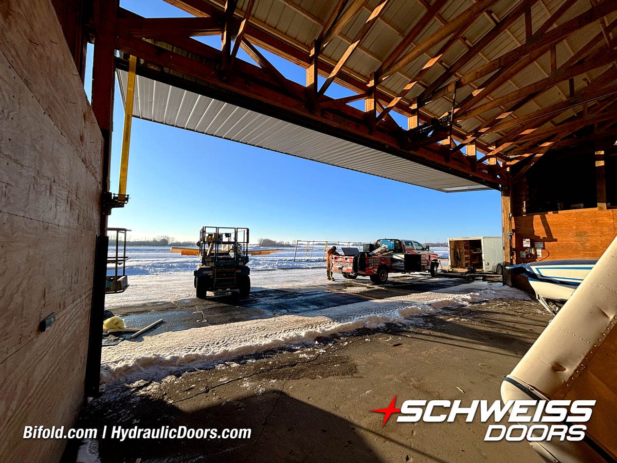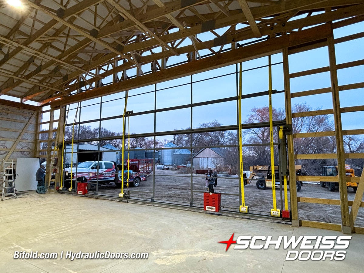 Interior view of Schweiss bifold door installed on a hangar home in Houston shown closed