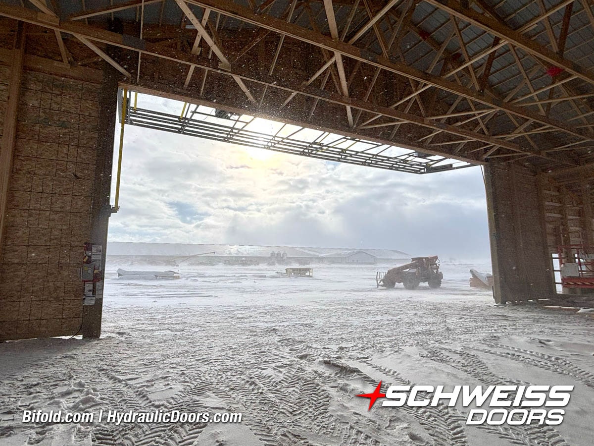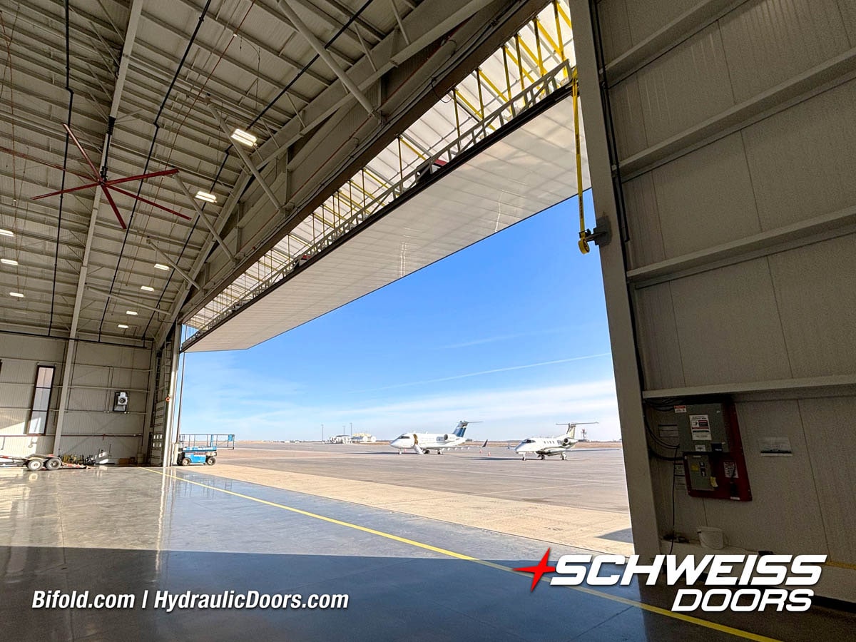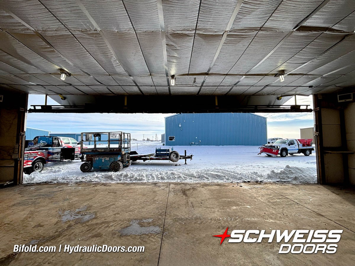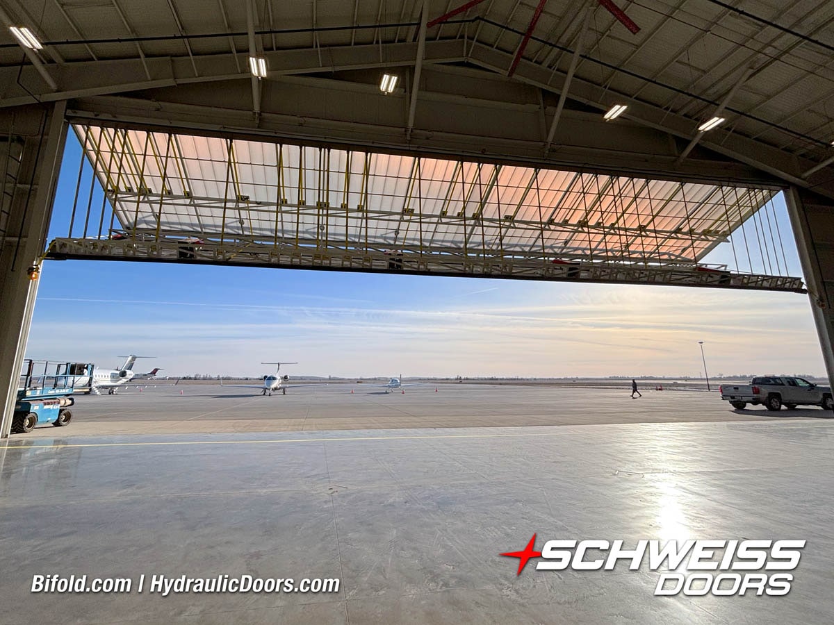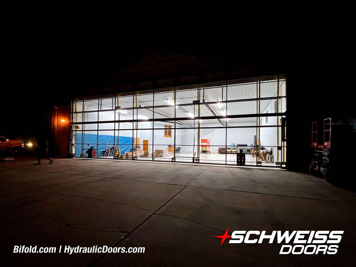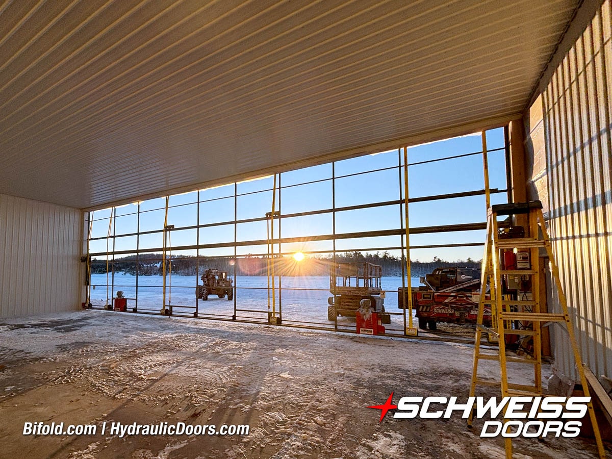 Interior view of Schweiss bifold door installed on a hangar home in Houston shown closed
