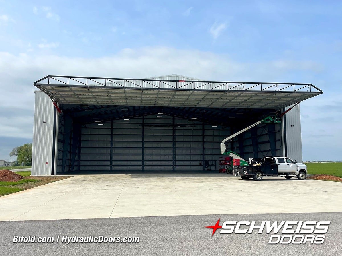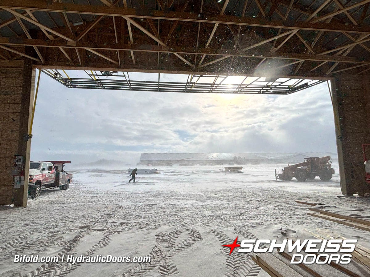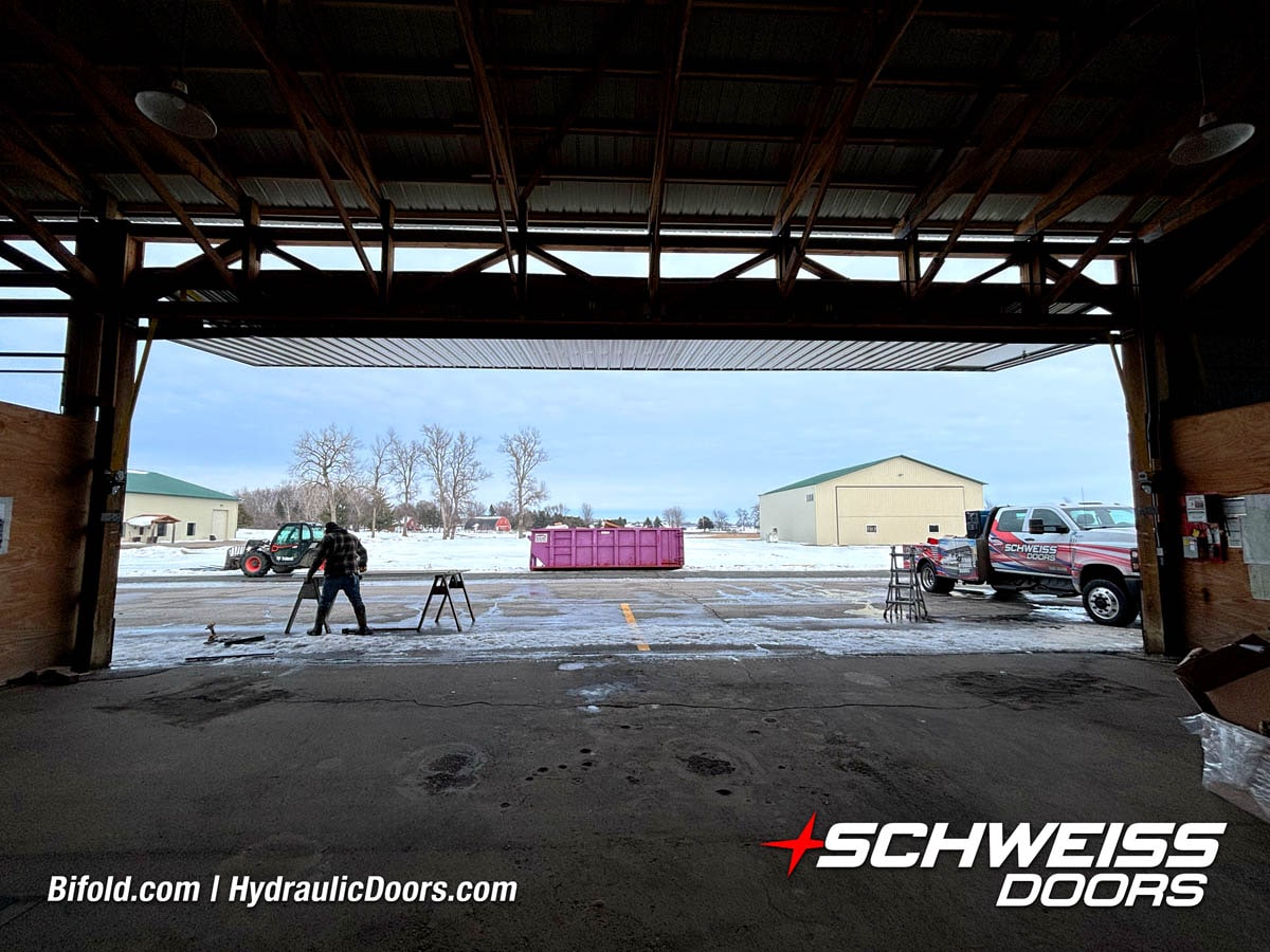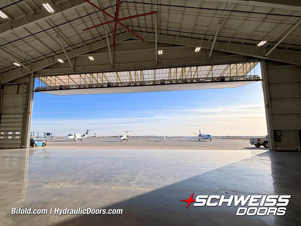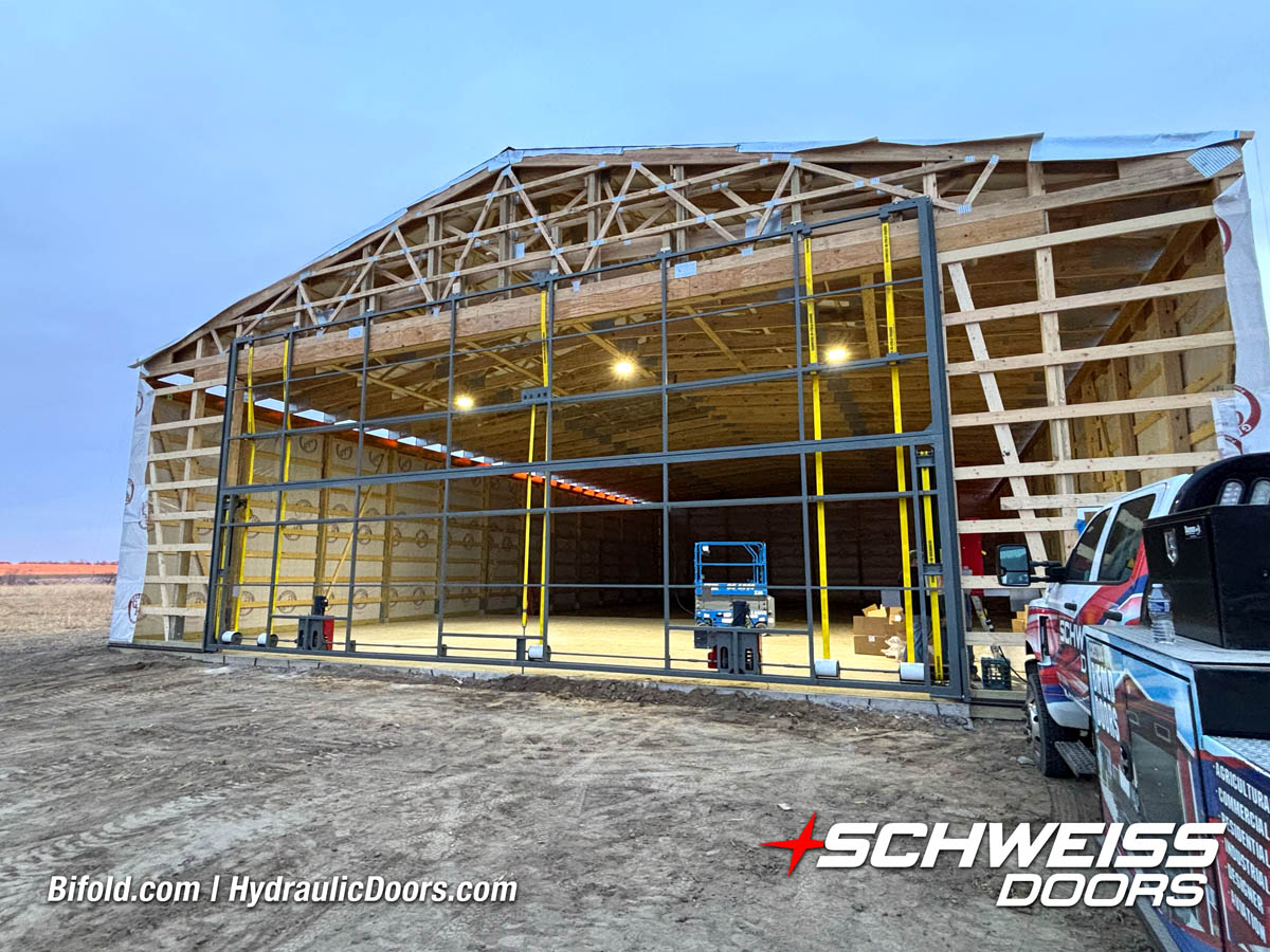 Interior view of Schweiss bifold door installed on a hangar home in Houston shown closed