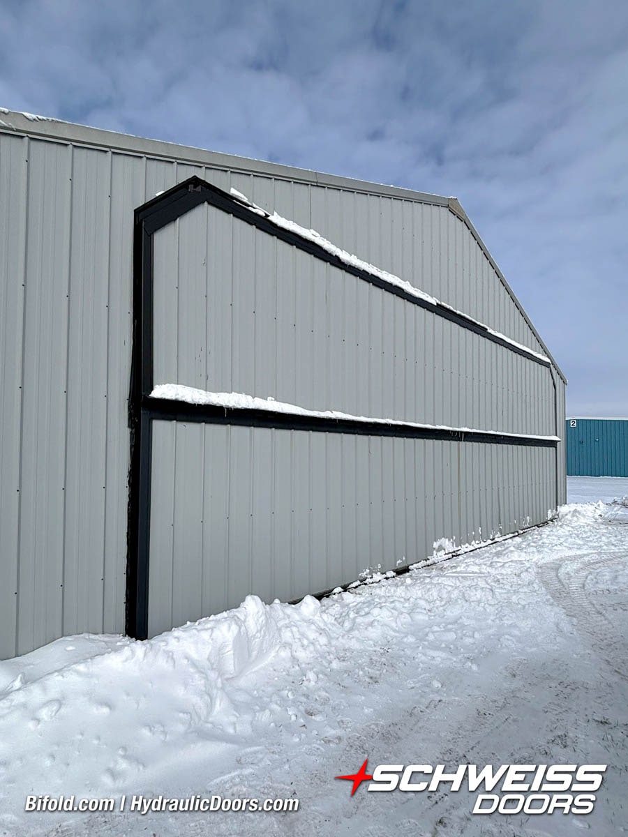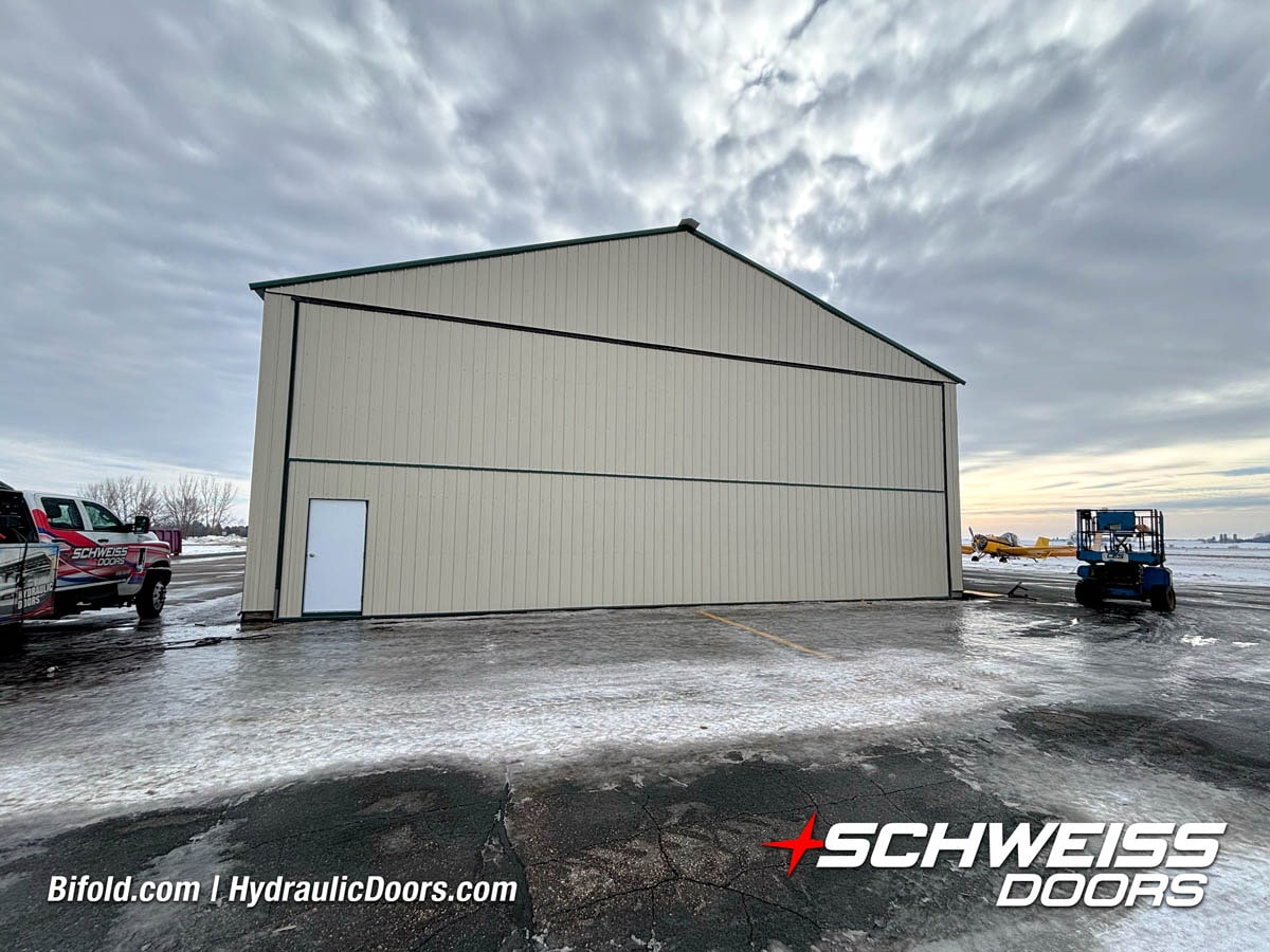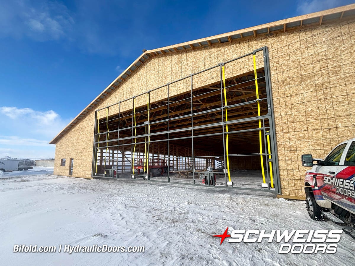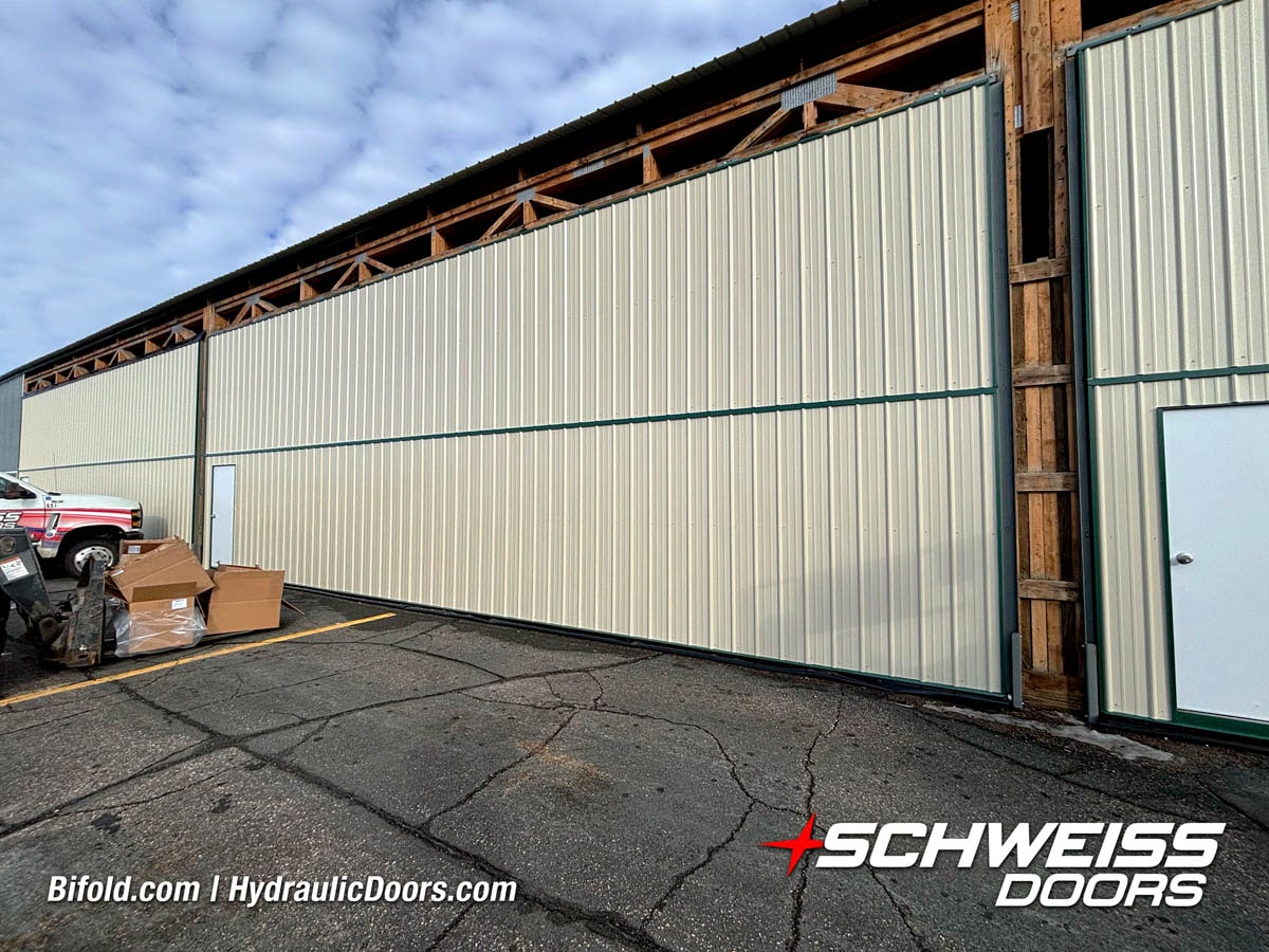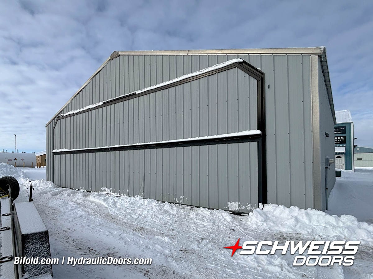Schweiss liftstrap bifold hangar home door installed on hangar home in Colorado viewed from outside