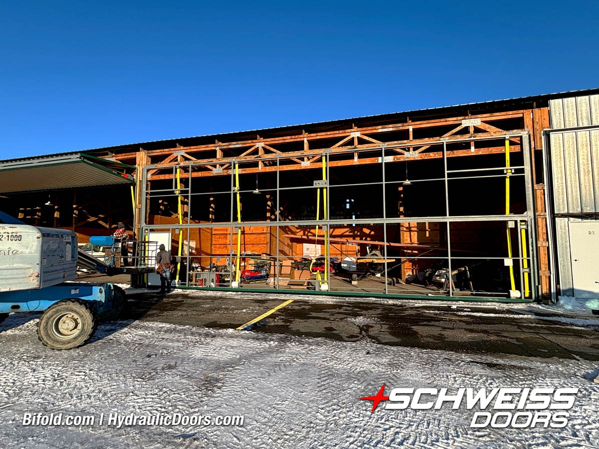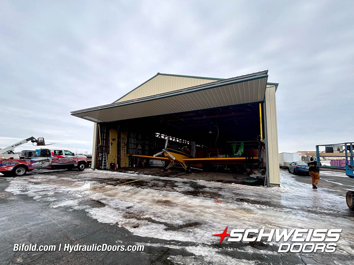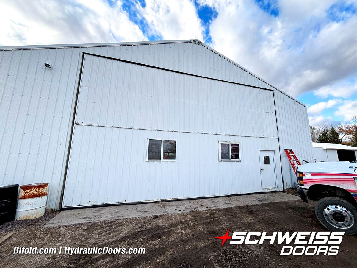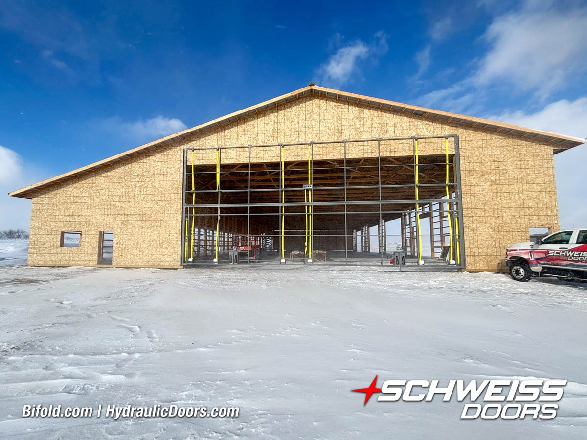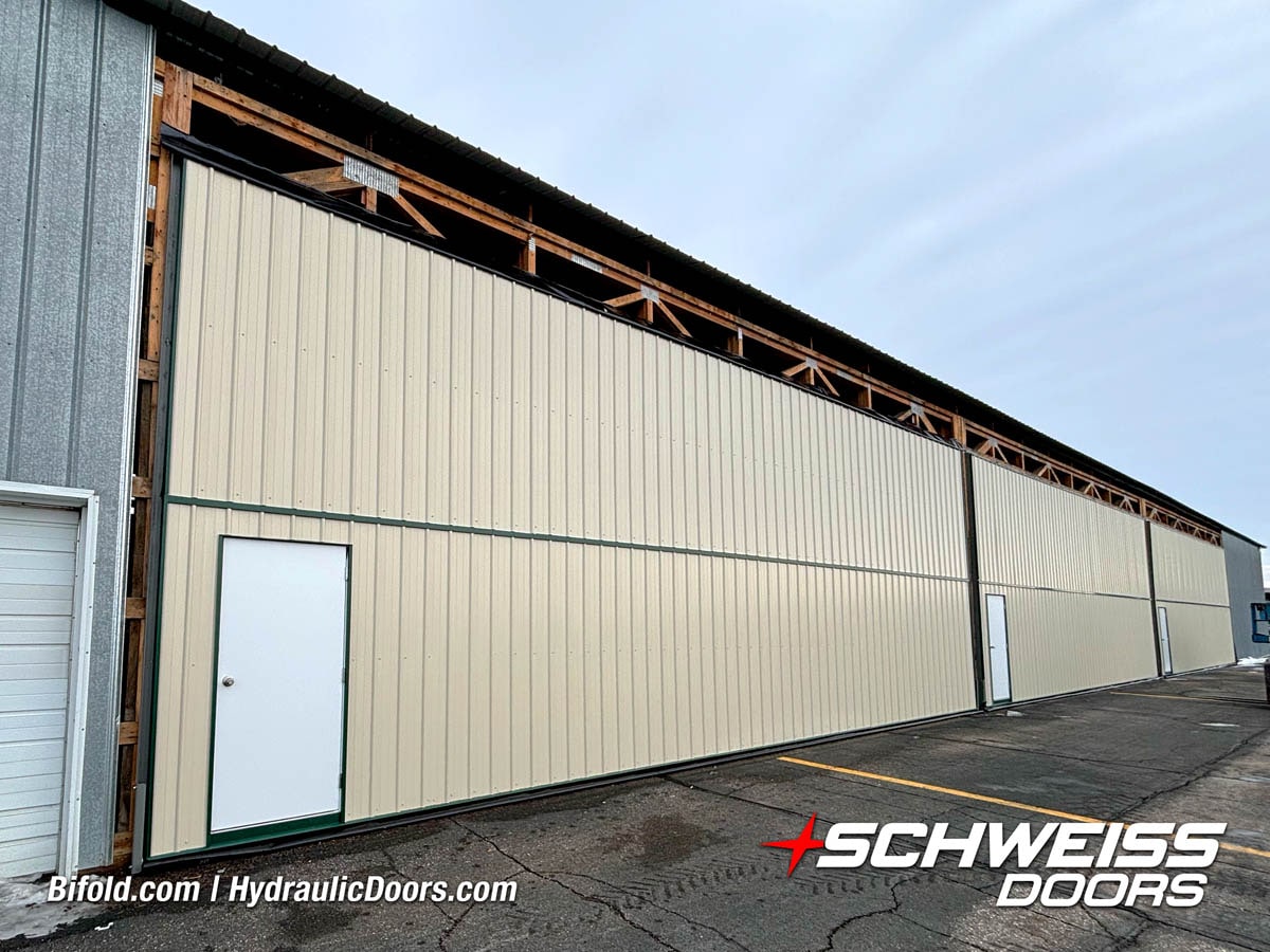 Schweiss liftstrap bifold hangar home door installed on hangar home in Colorado viewed from outside