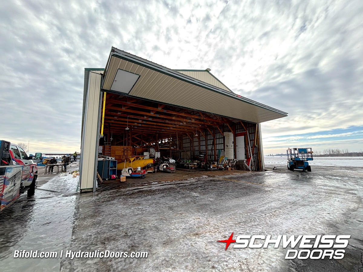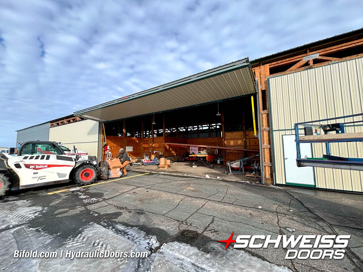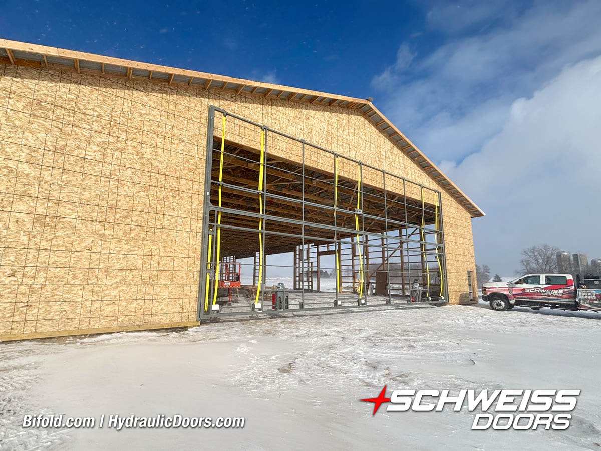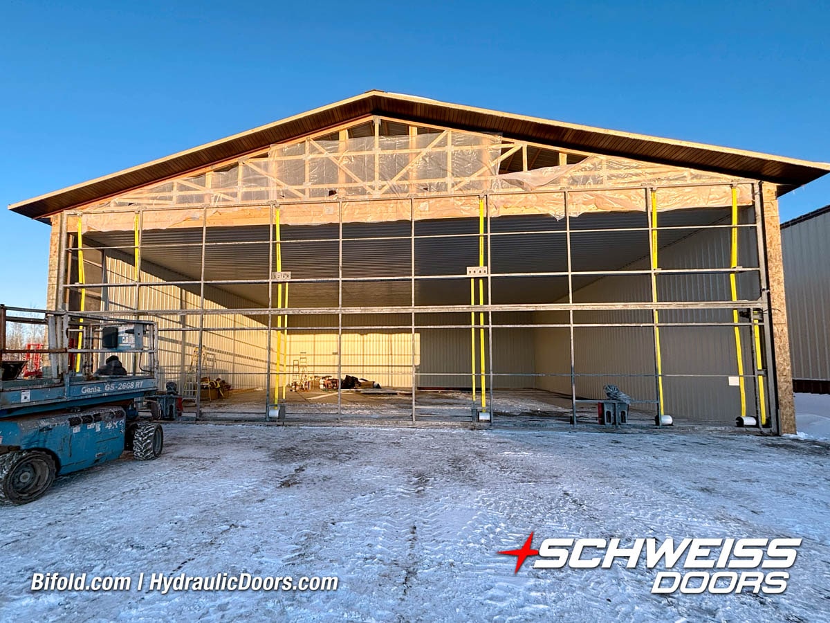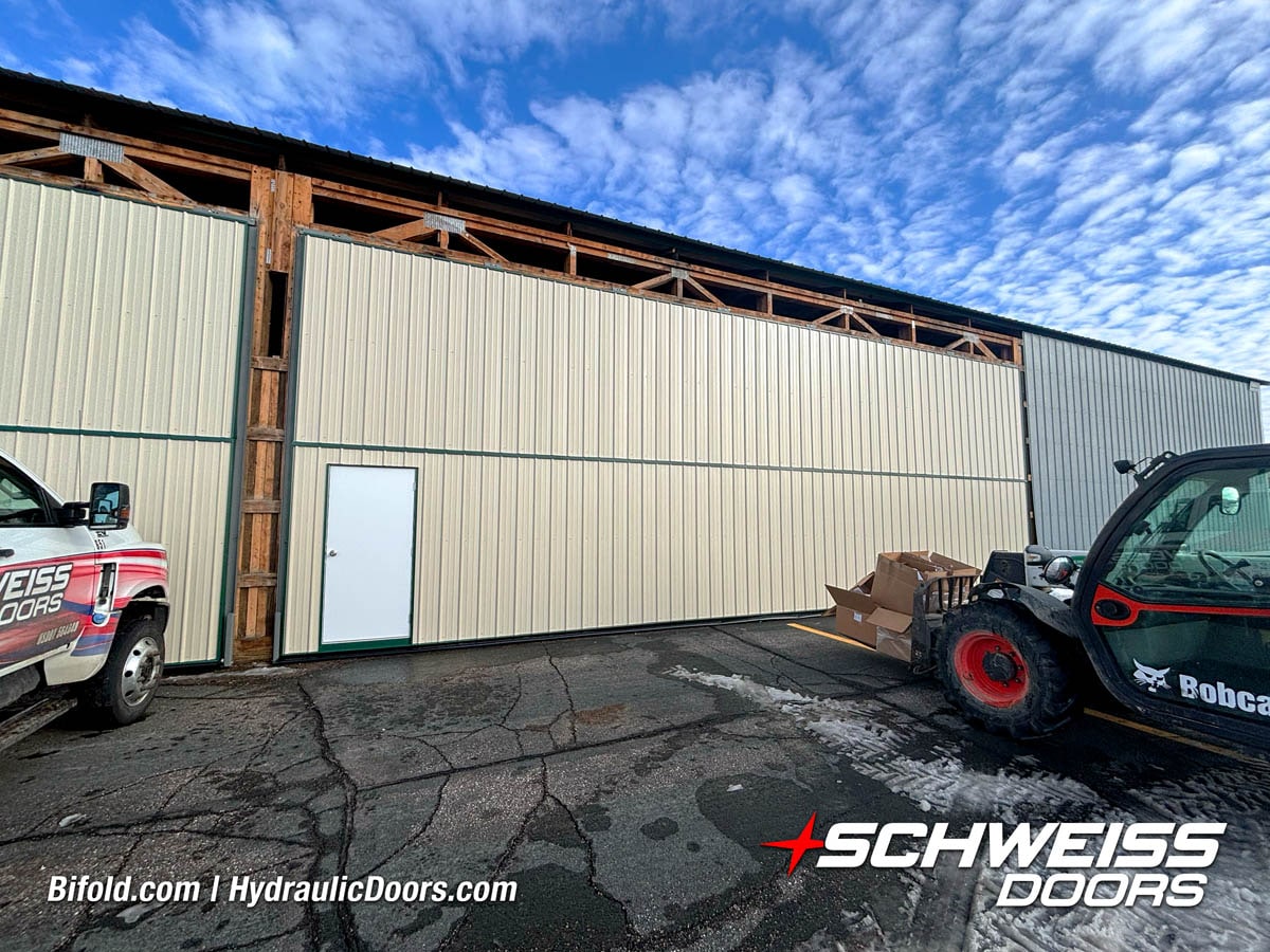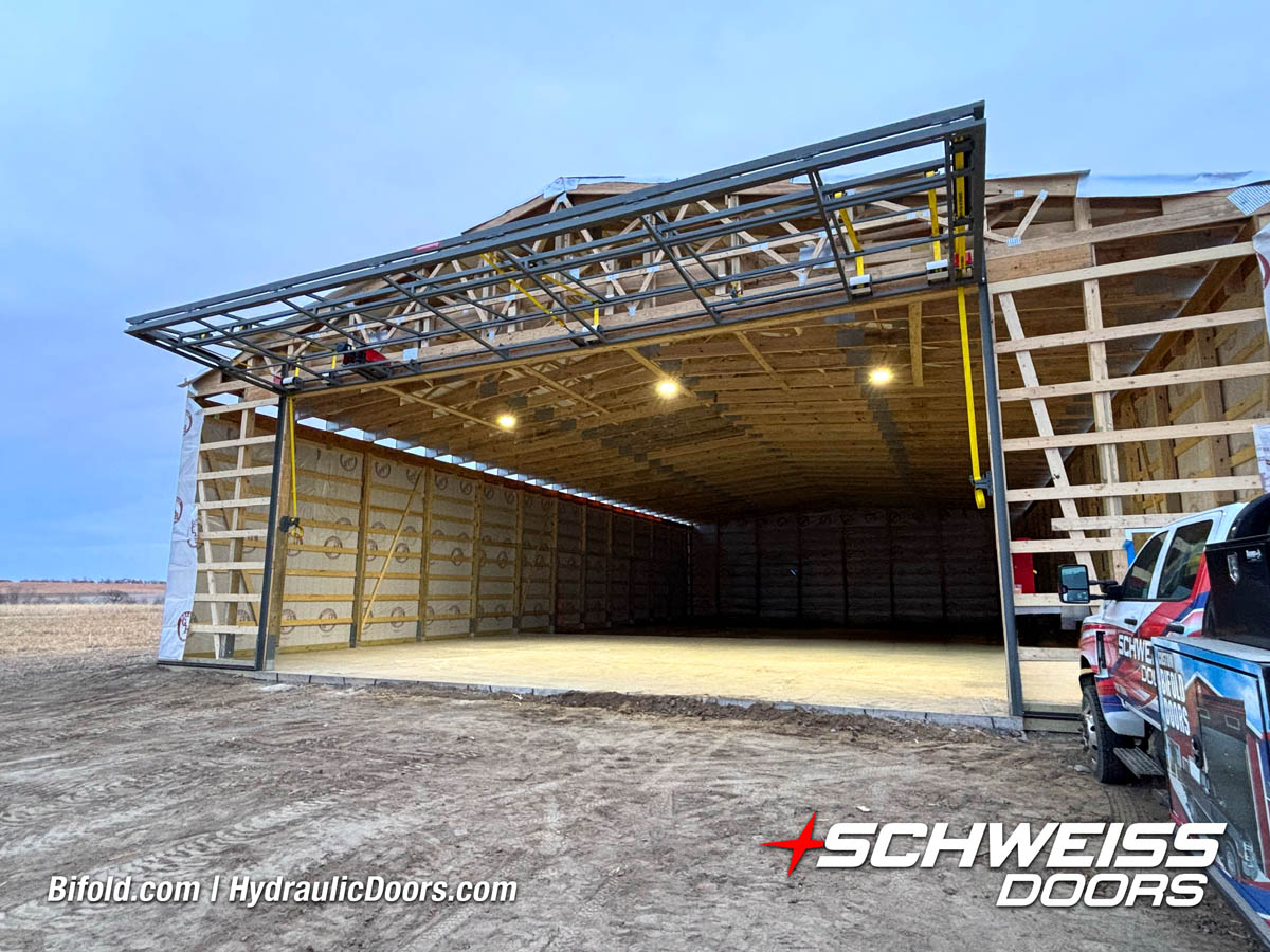 Schweiss liftstrap bifold hangar home door installed on hangar home in Colorado viewed from outside