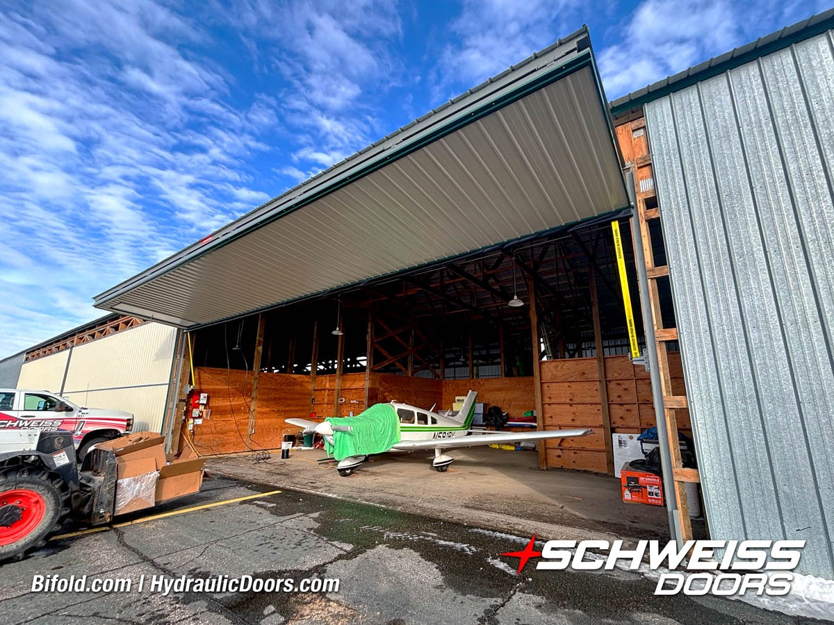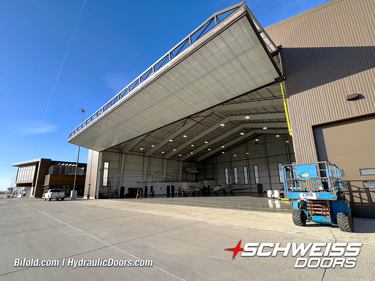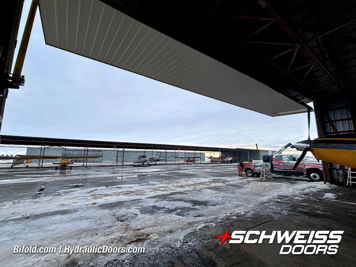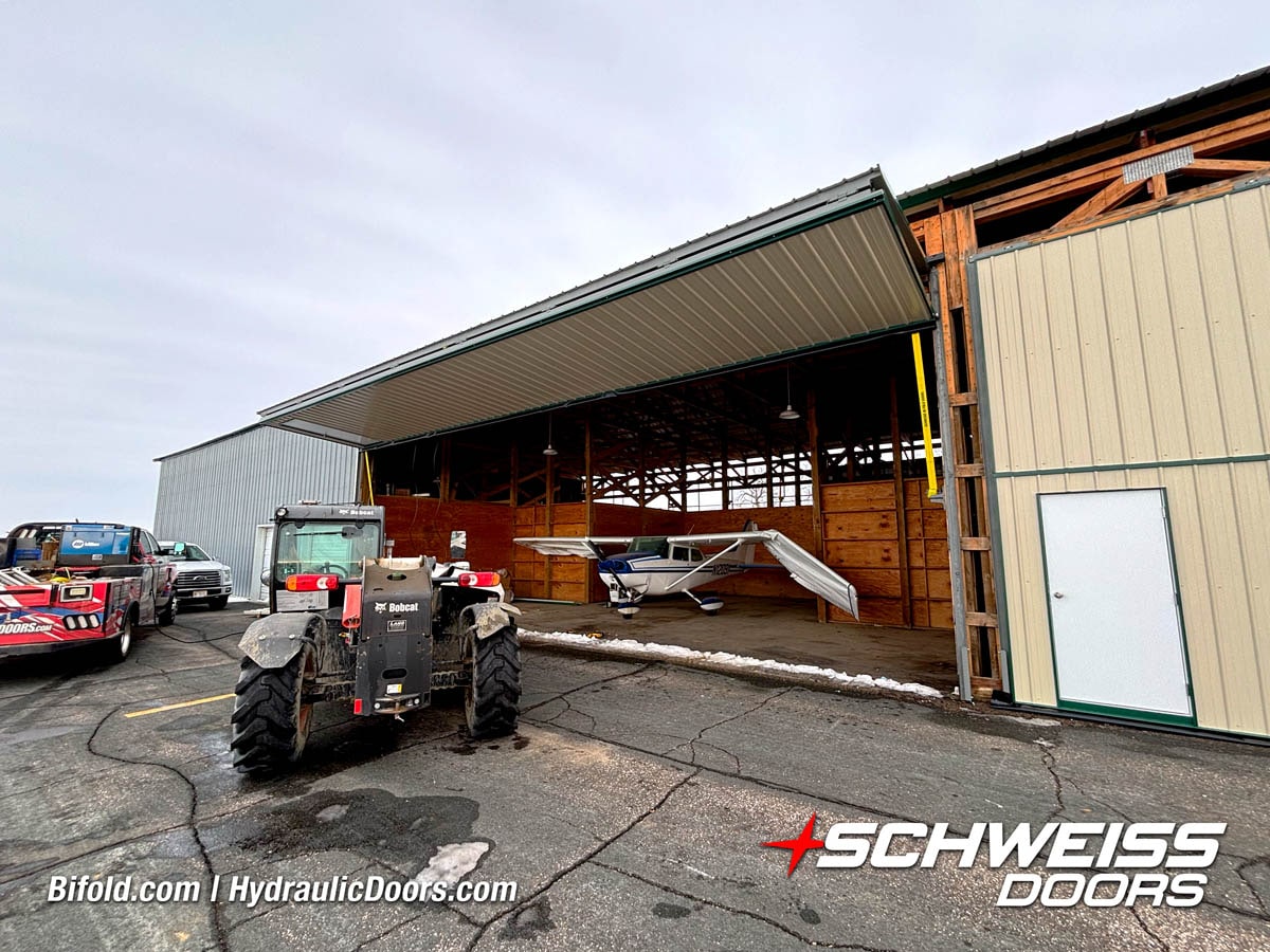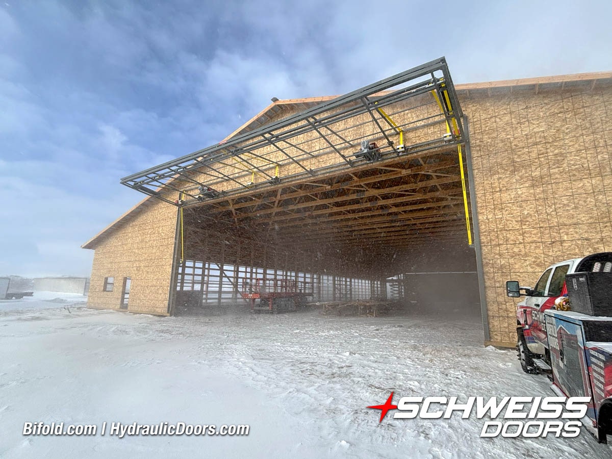 Schweiss liftstrap bifold hangar home door installed on hangar home in Colorado viewed from outside