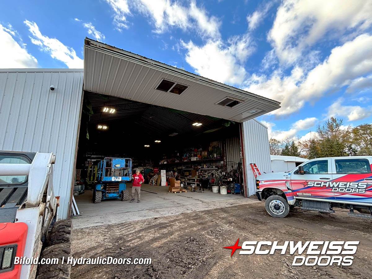 Schweiss residential hydraulic door installed on luxury car garage shown open