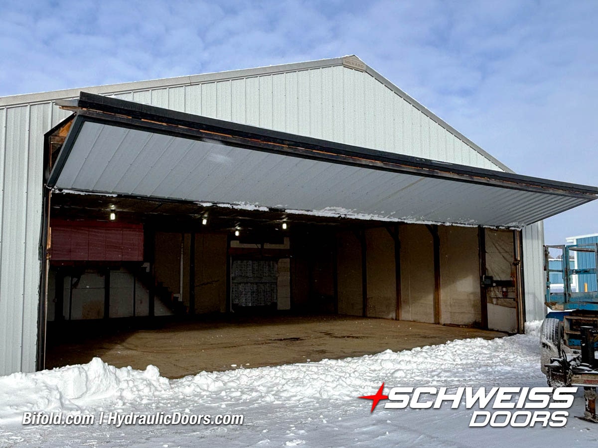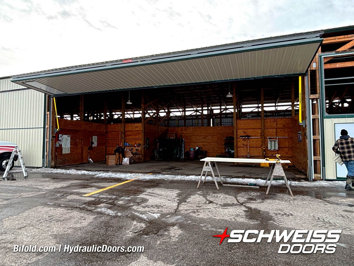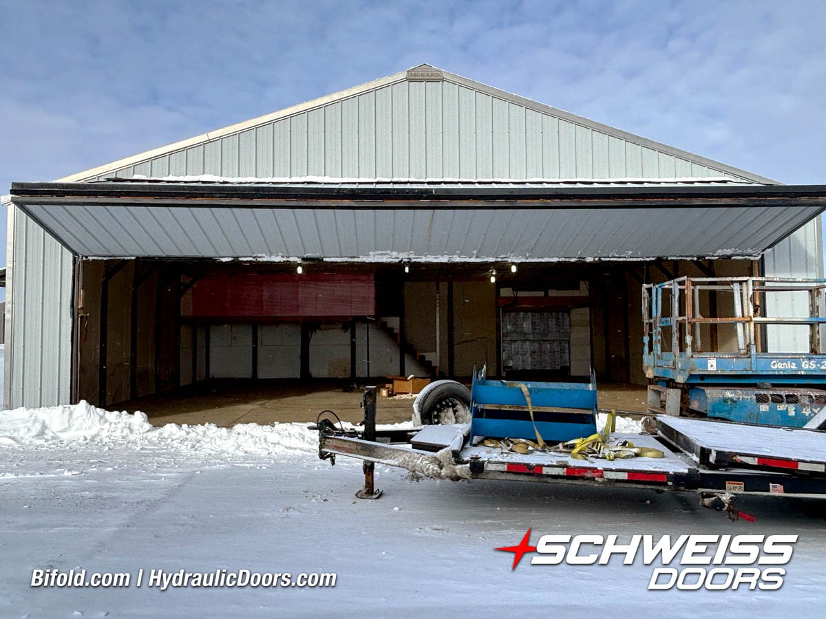 Schweiss industrial fold up door installed on Fermilab building shown open