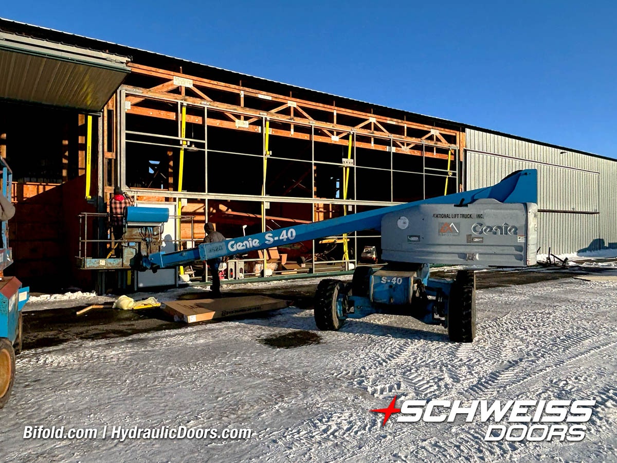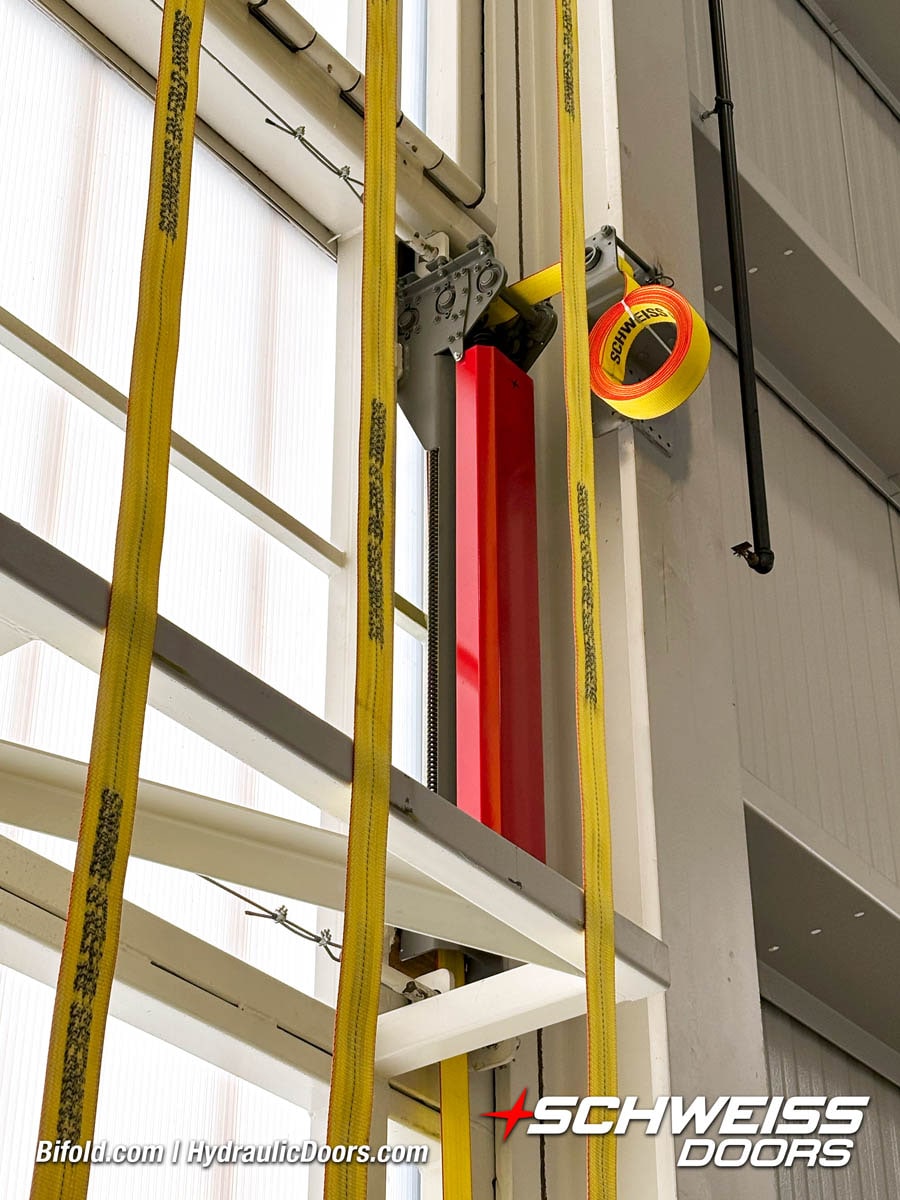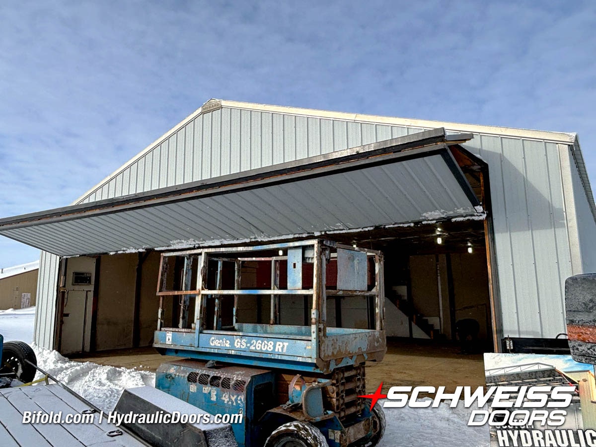 Schweiss industrial fold up door installed on Fermilab building shown open
