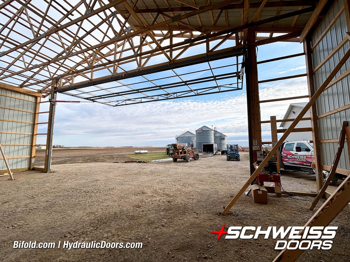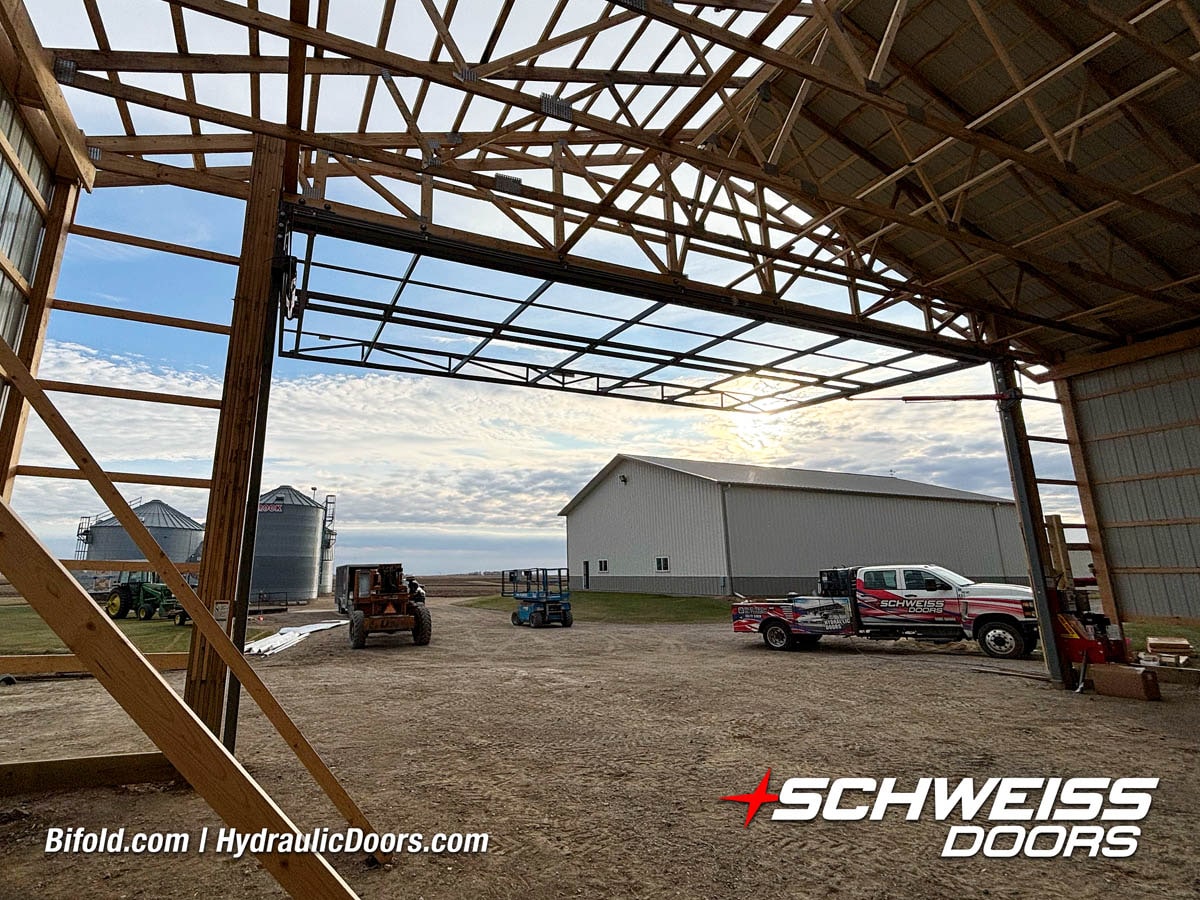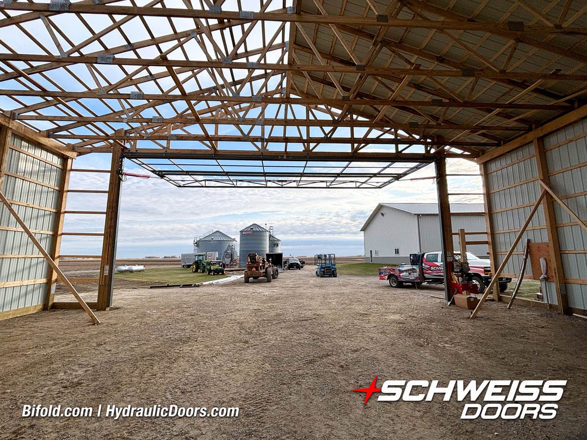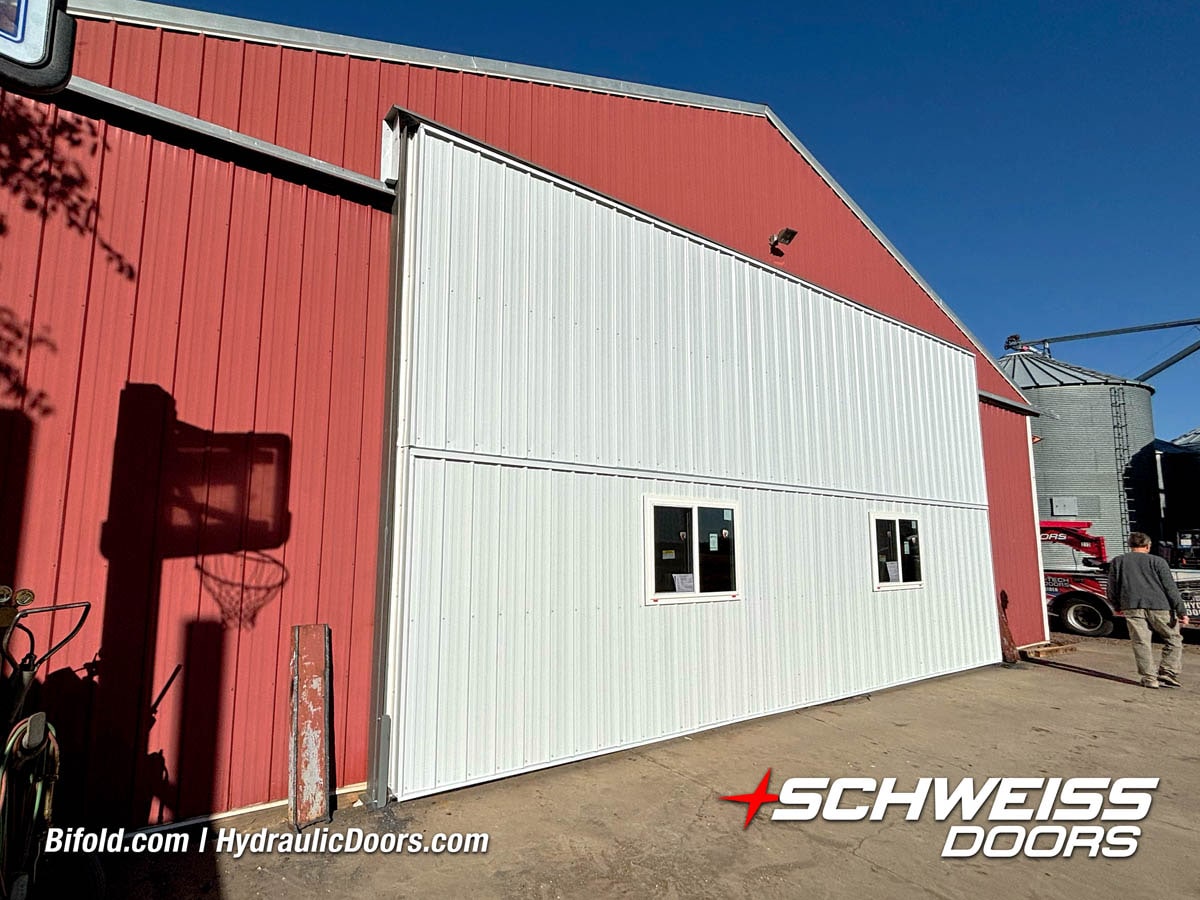 Schweiss bifold agricultural door installed on building at Devitt Farms shown closed