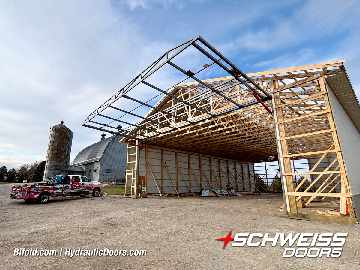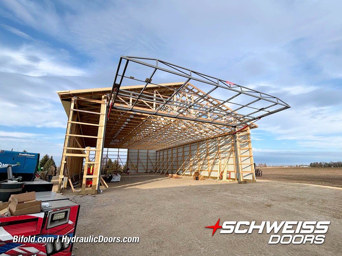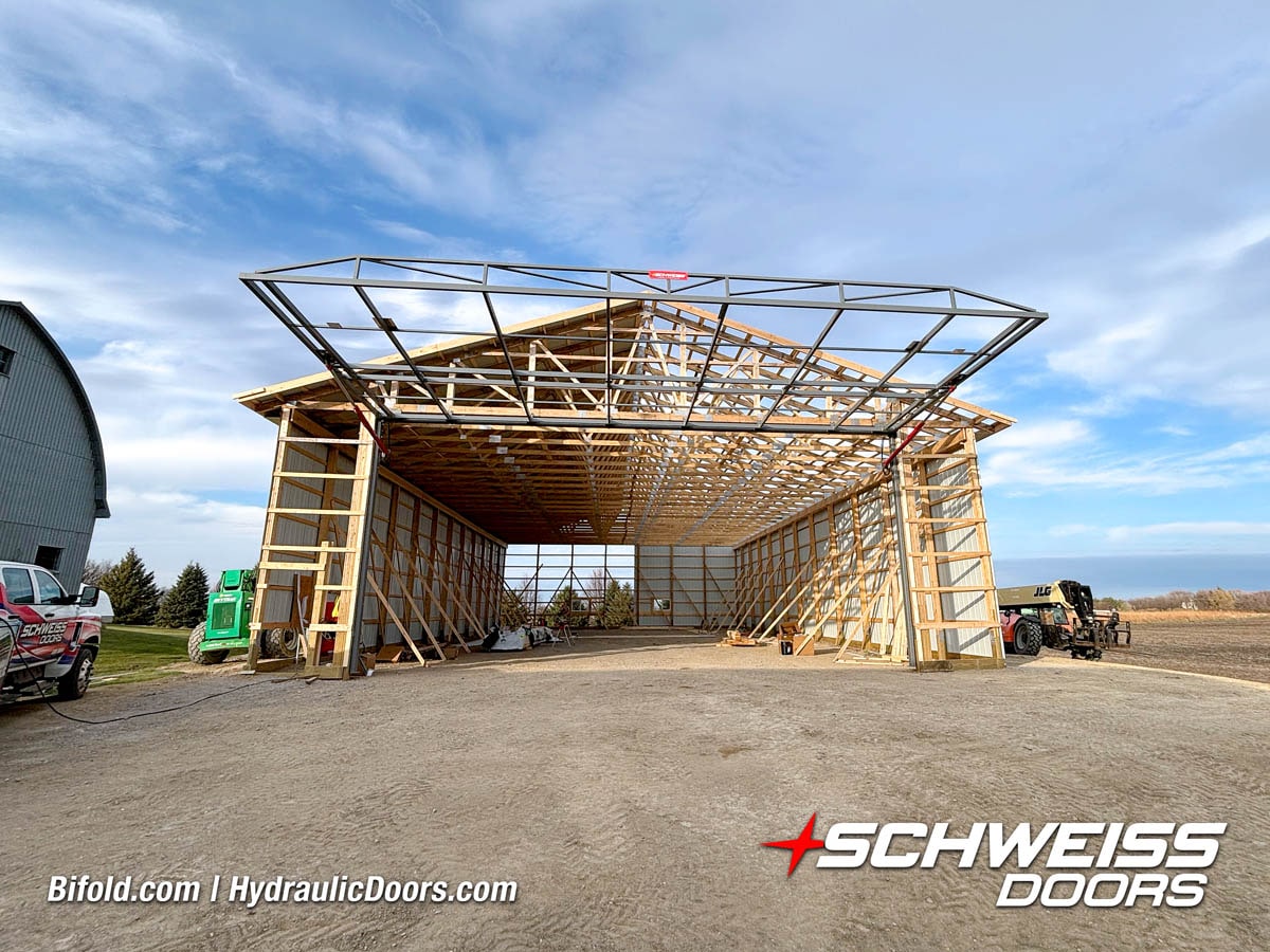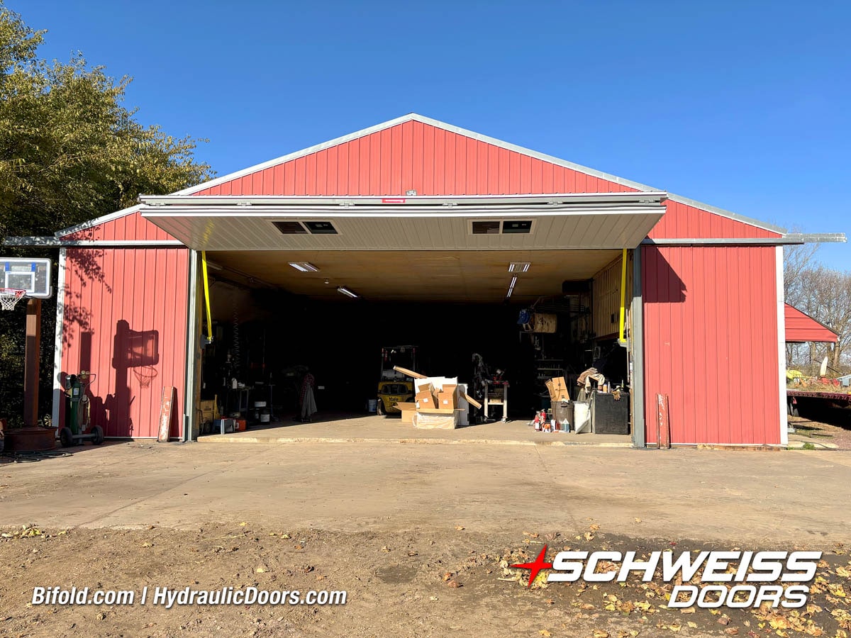 Schweiss bifold agricultural door installed on building at Devitt Farms shown closed