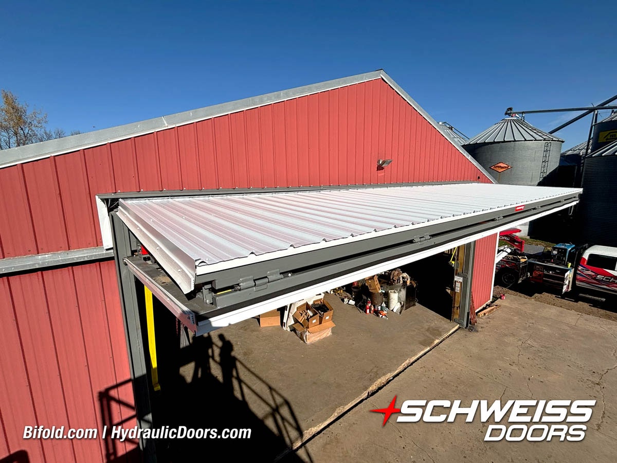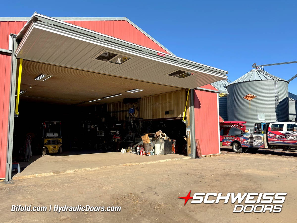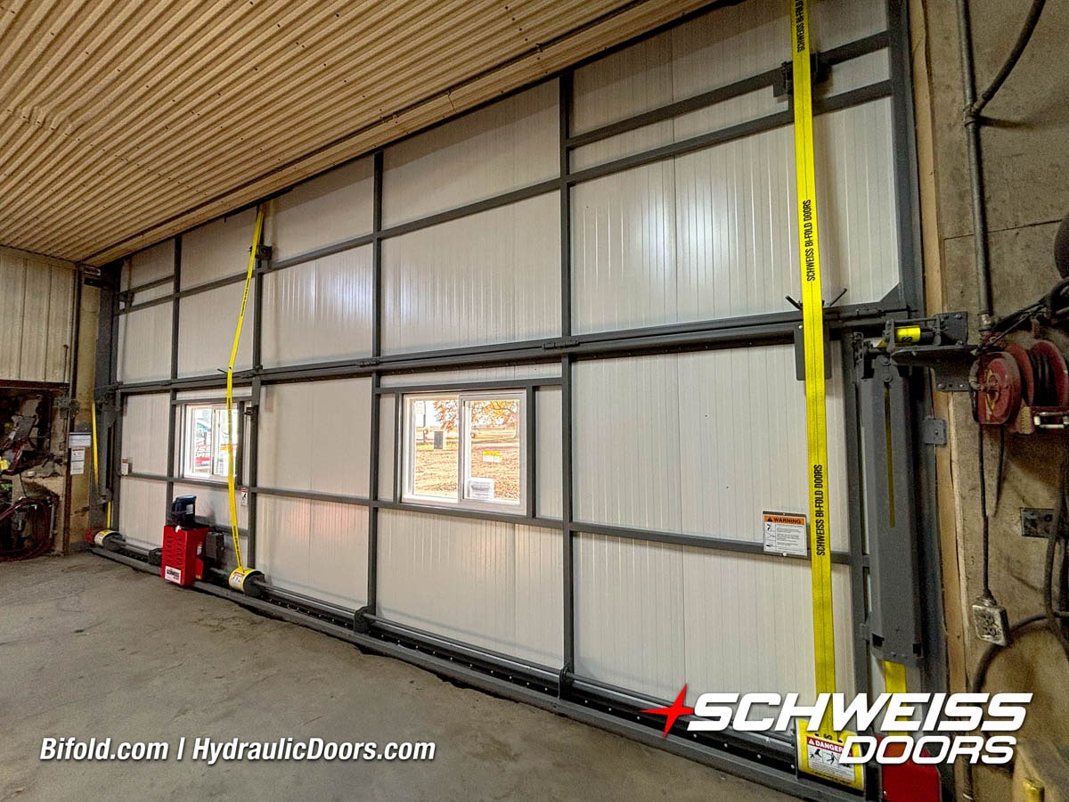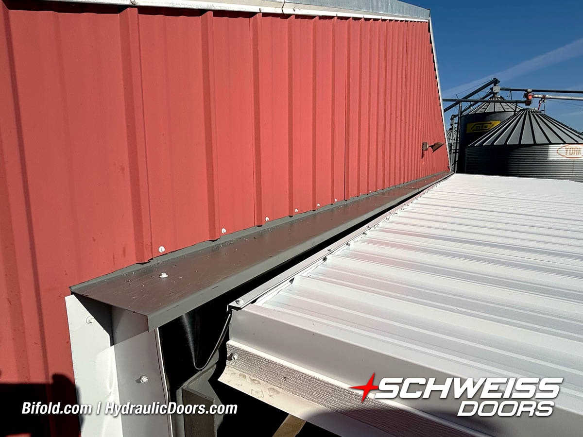 Schweiss bifold agricultural door installed on building at Devitt Farms shown closed