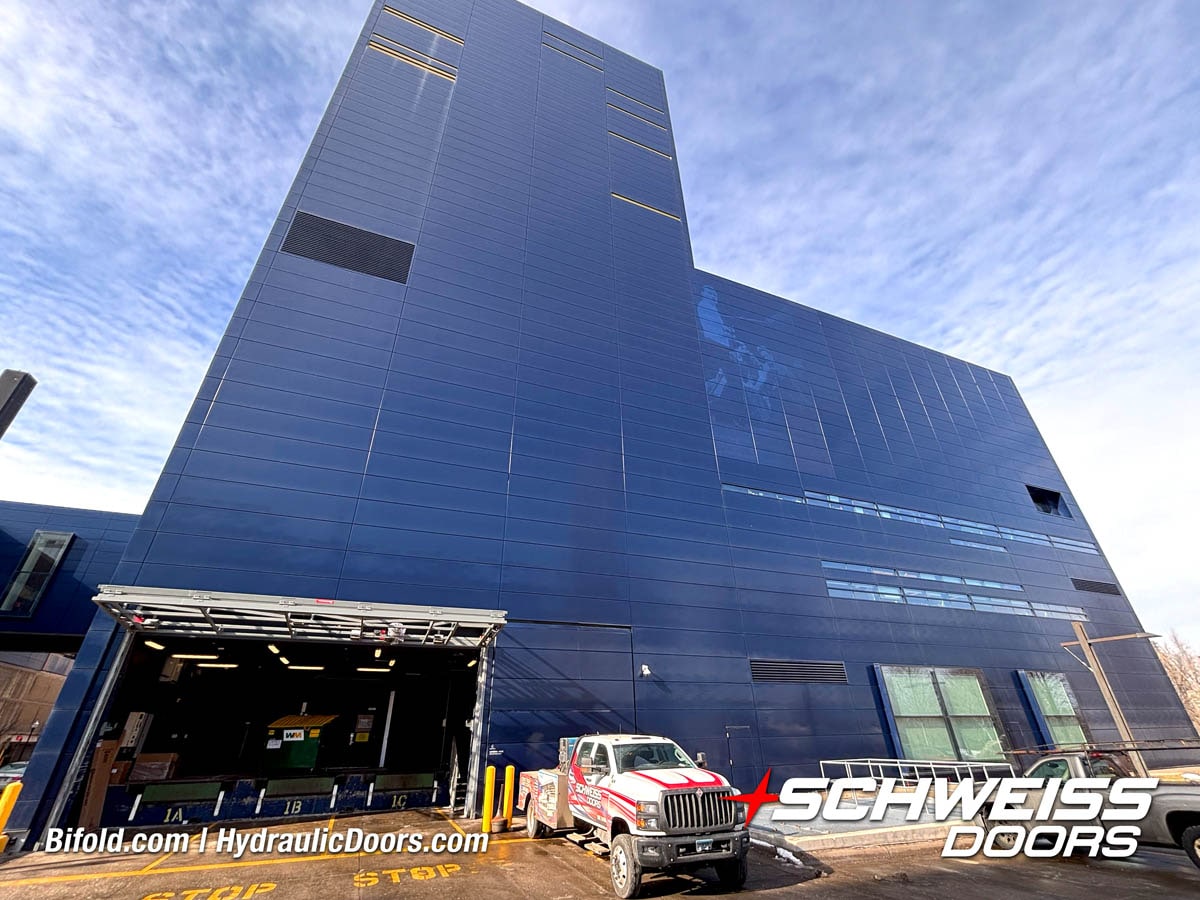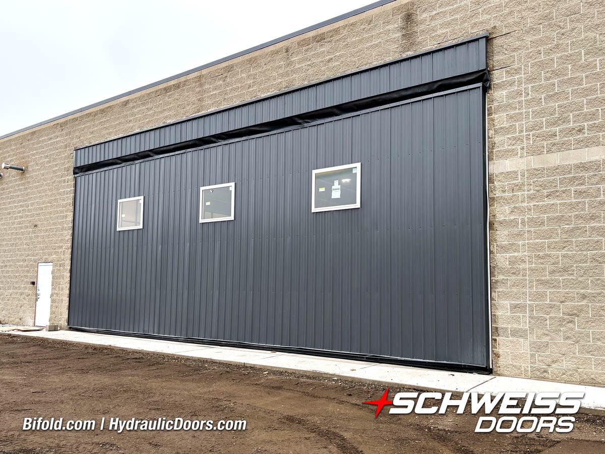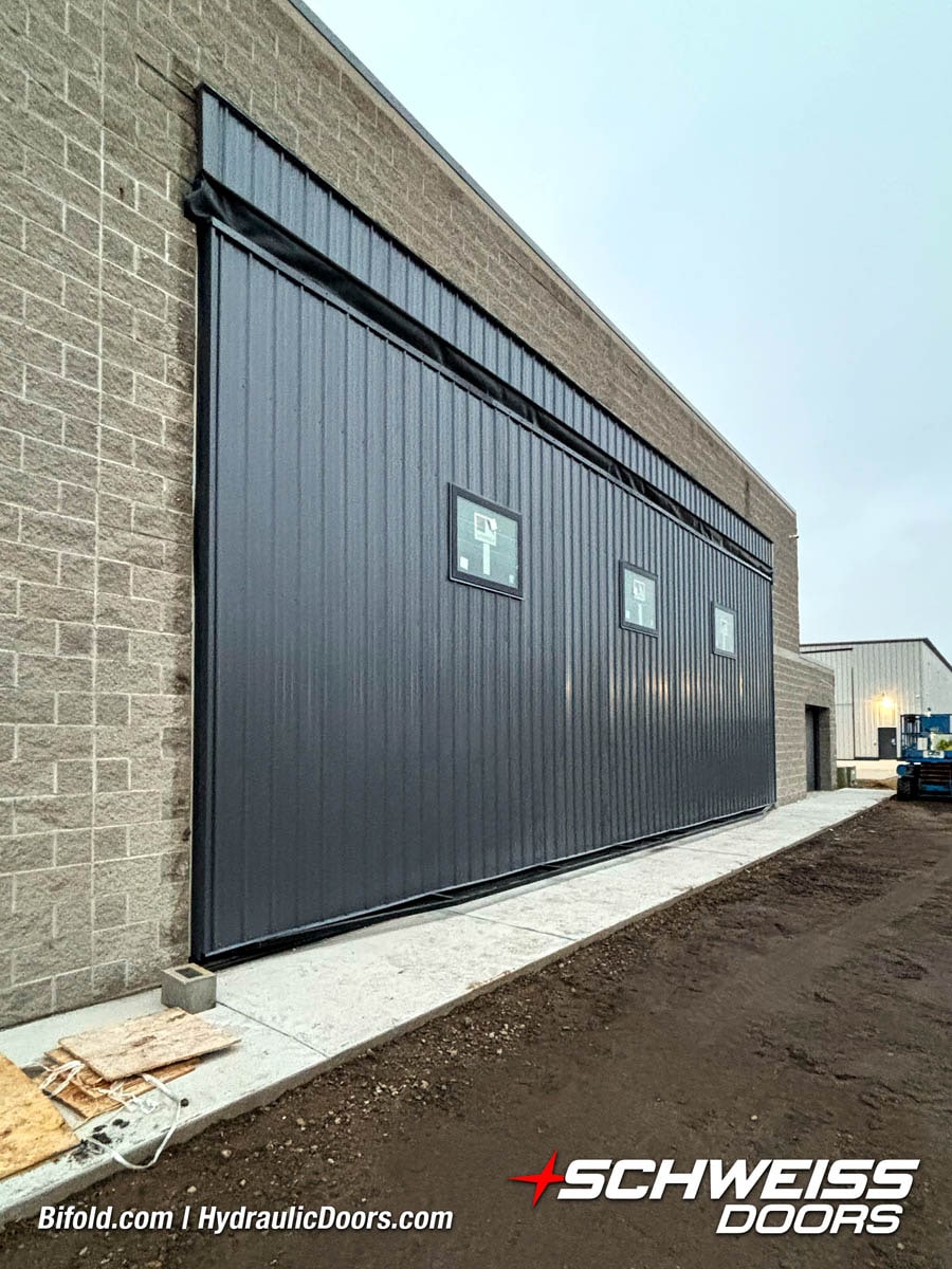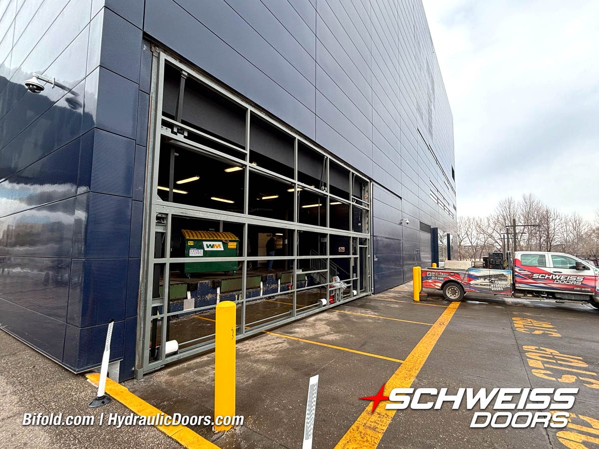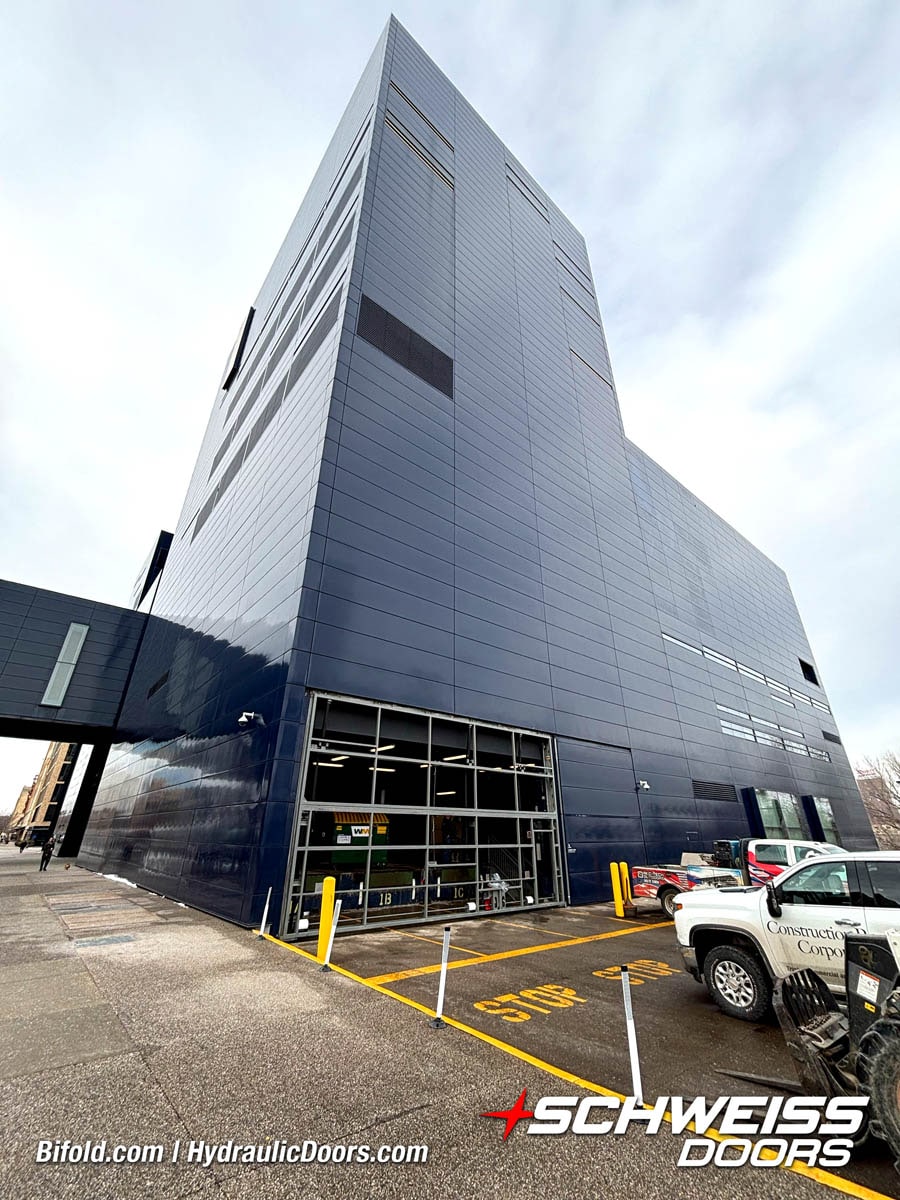 Schweiss industrial fold up door installed on Fermilab building shown open