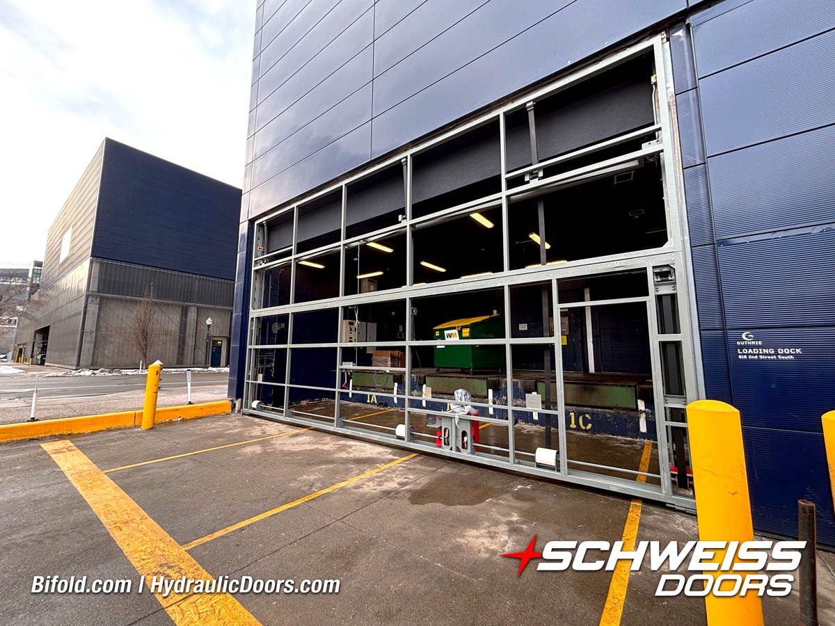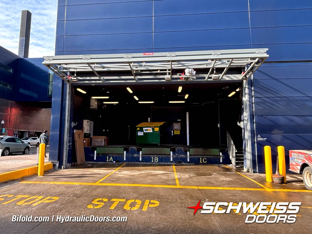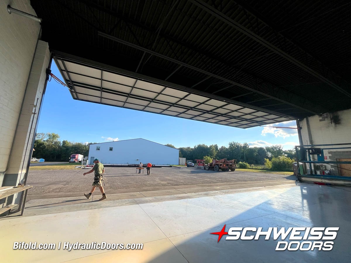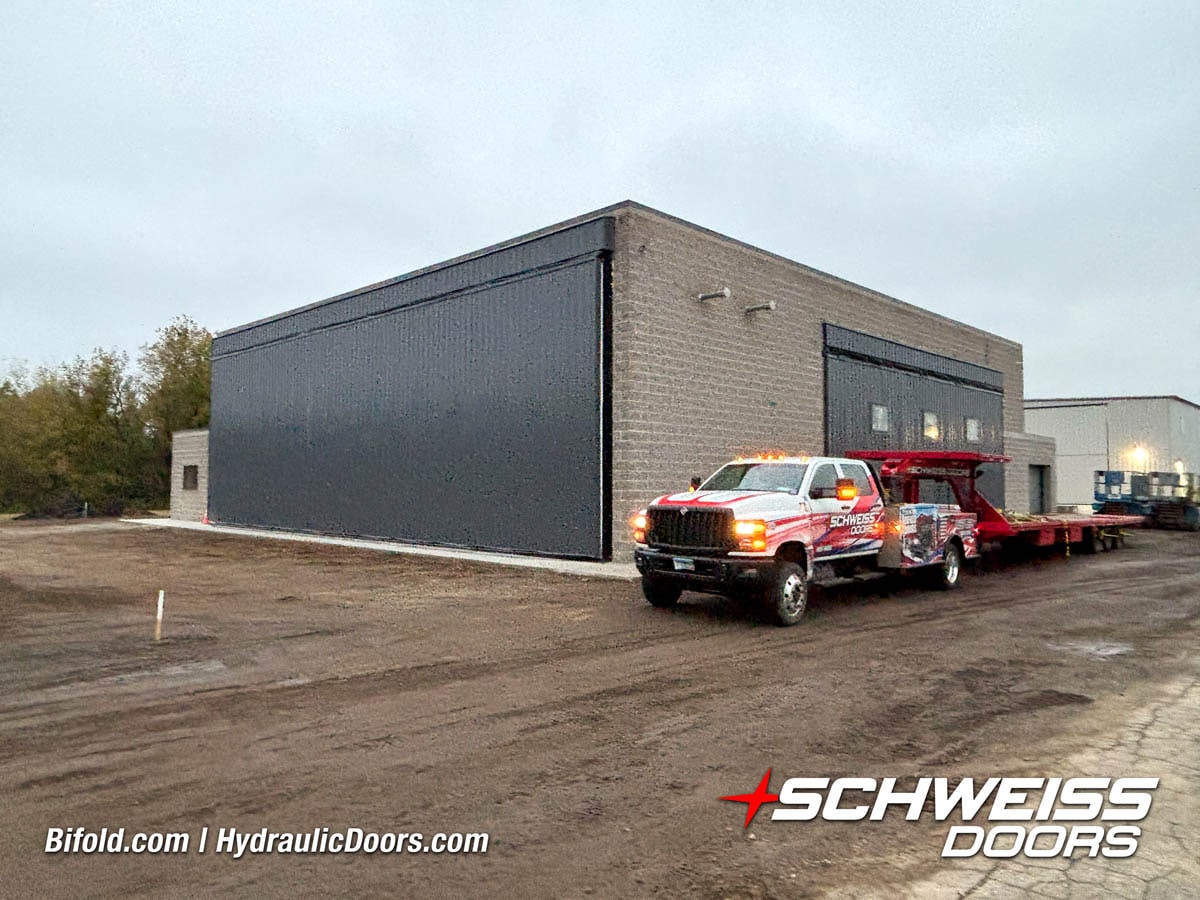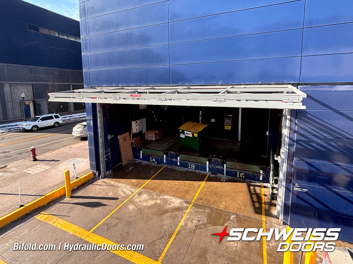 Schweiss industrial fold up door installed on Fermilab building shown open