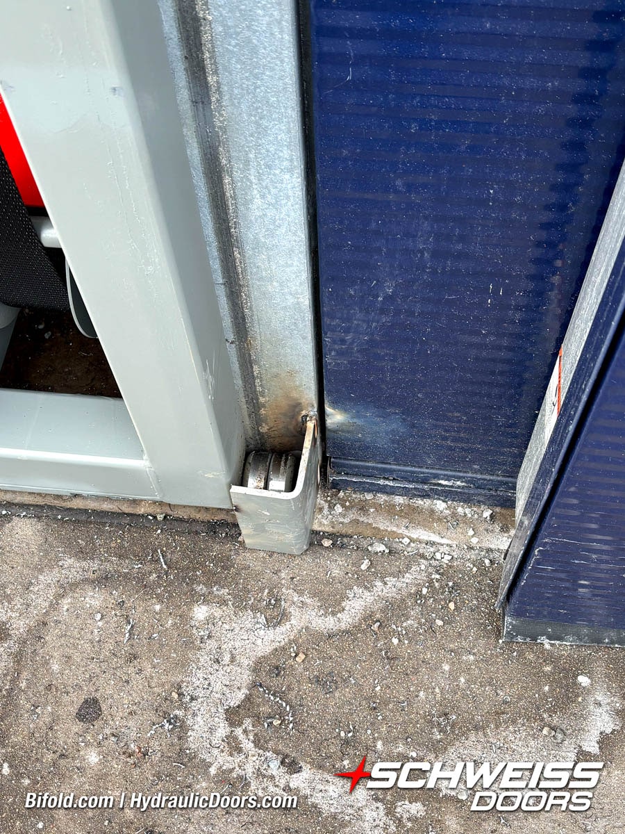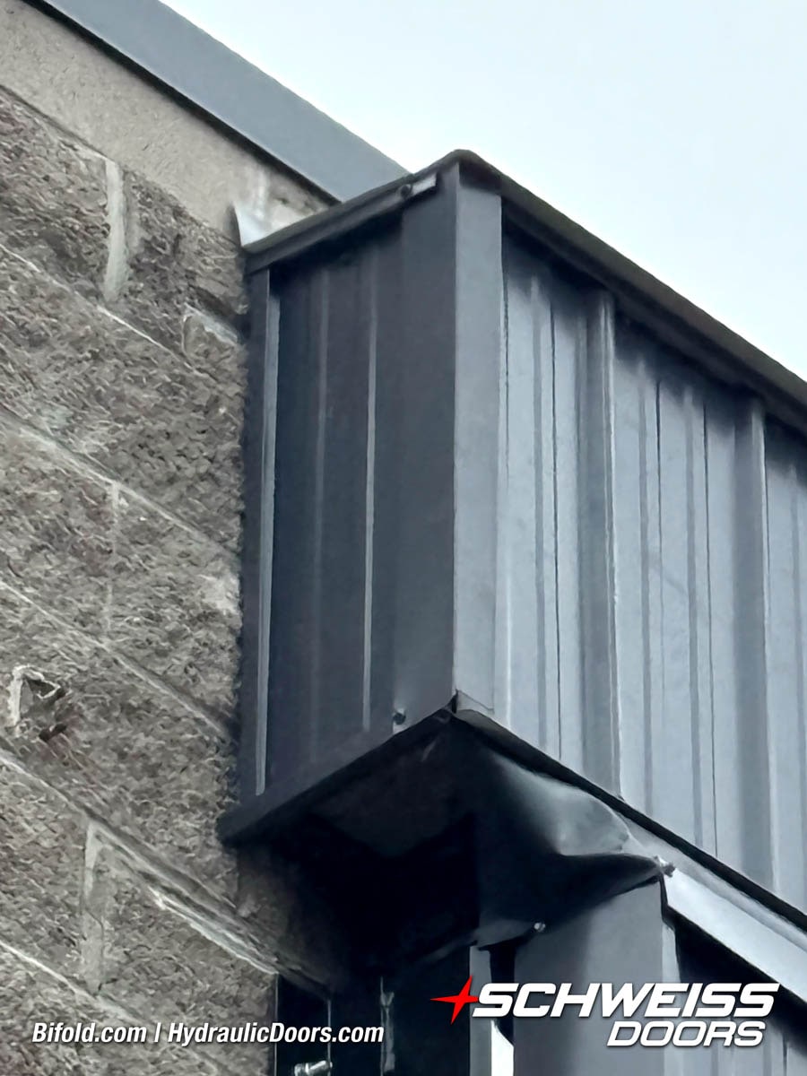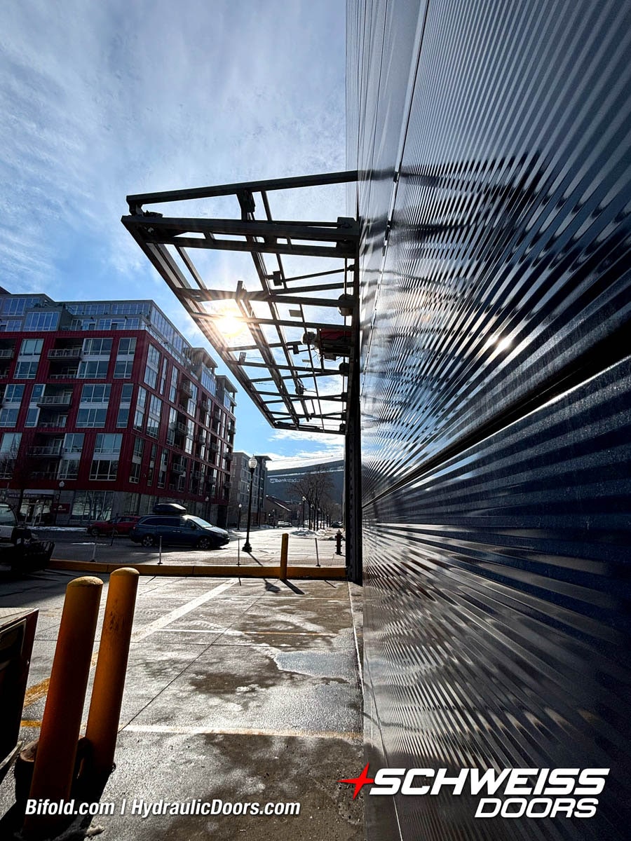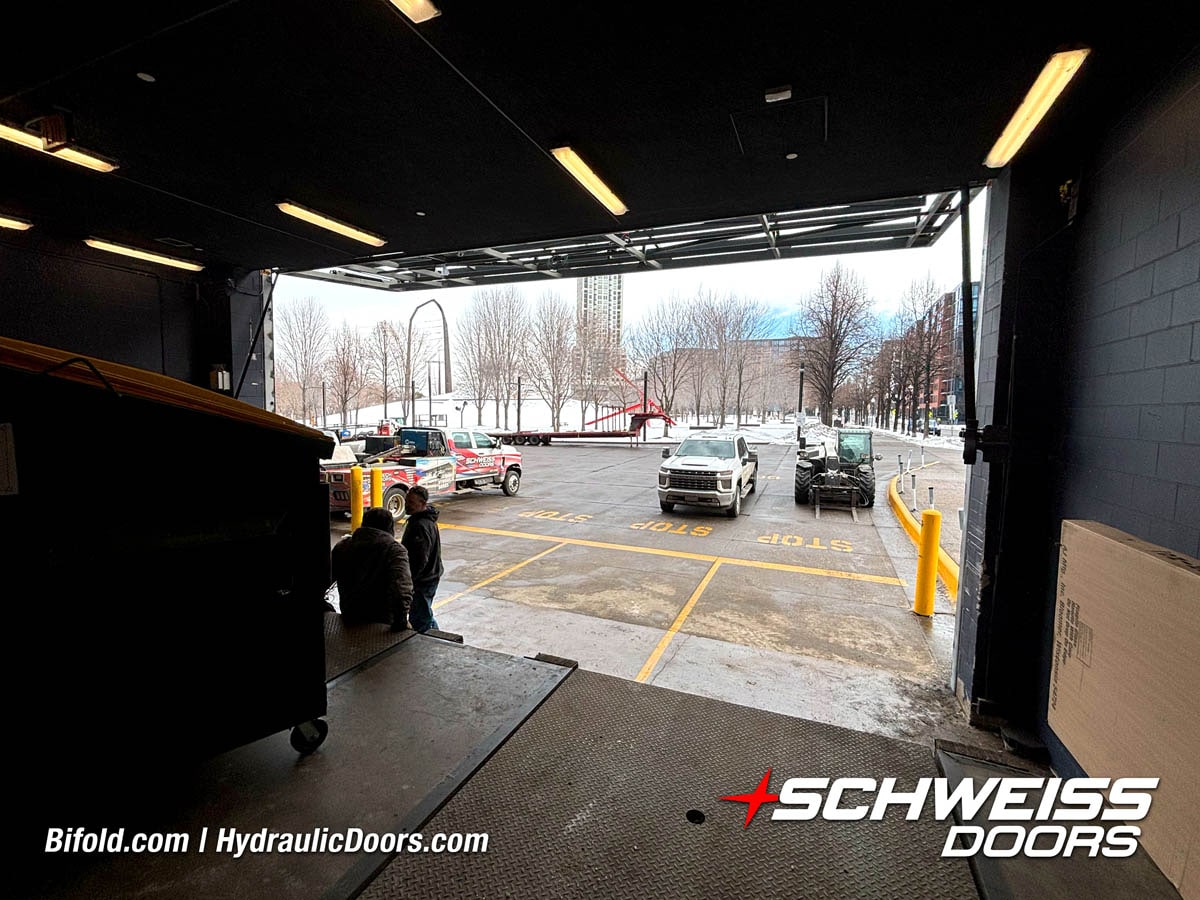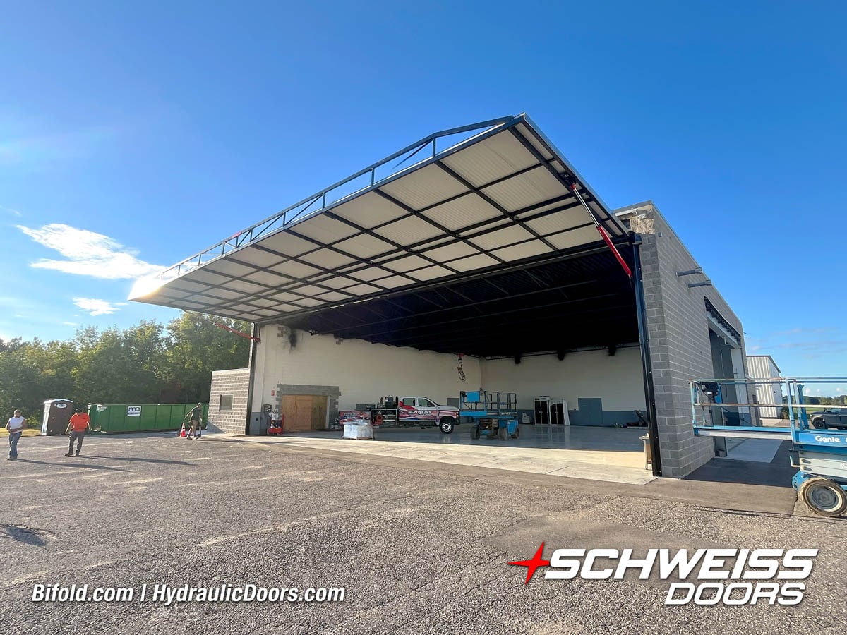 Schweiss industrial fold up door installed on Fermilab building shown open