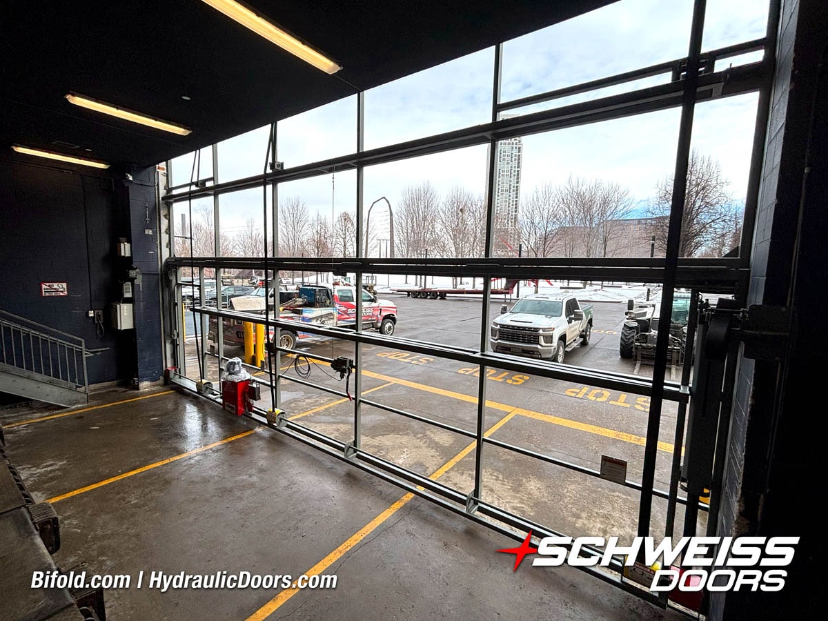 Schweiss hydraulic glass door installed on luxurious attached garage in Boston