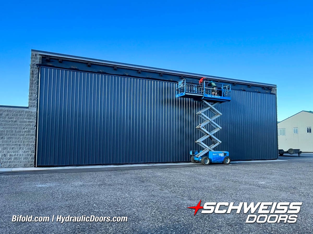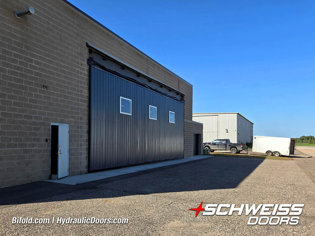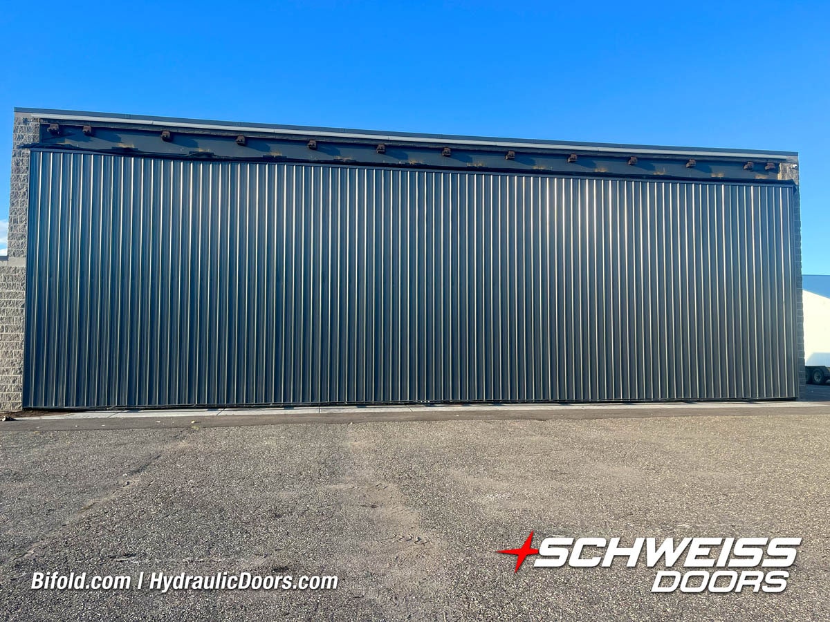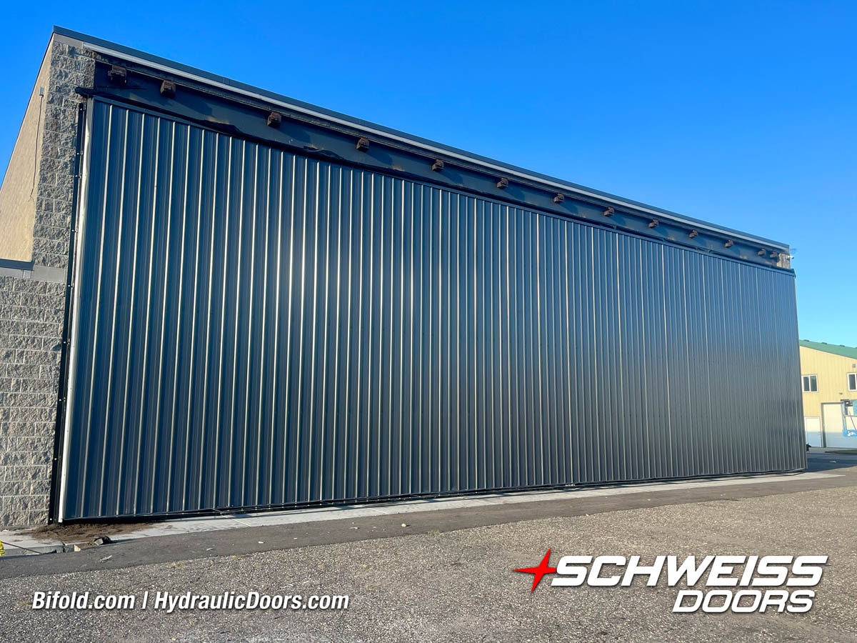 Schweiss liftstrap bifold hangar home door installed on hangar home in Colorado viewed from outside