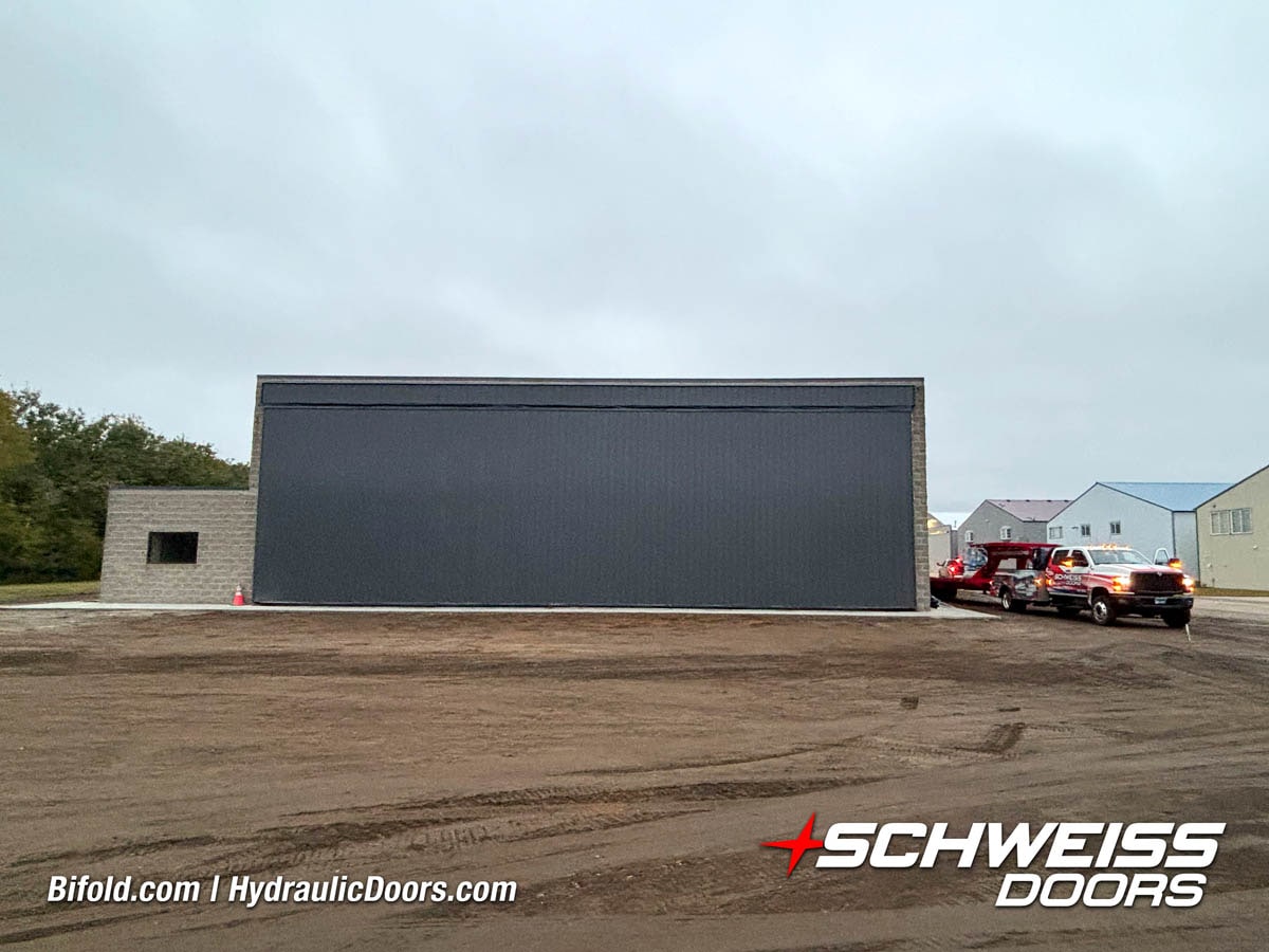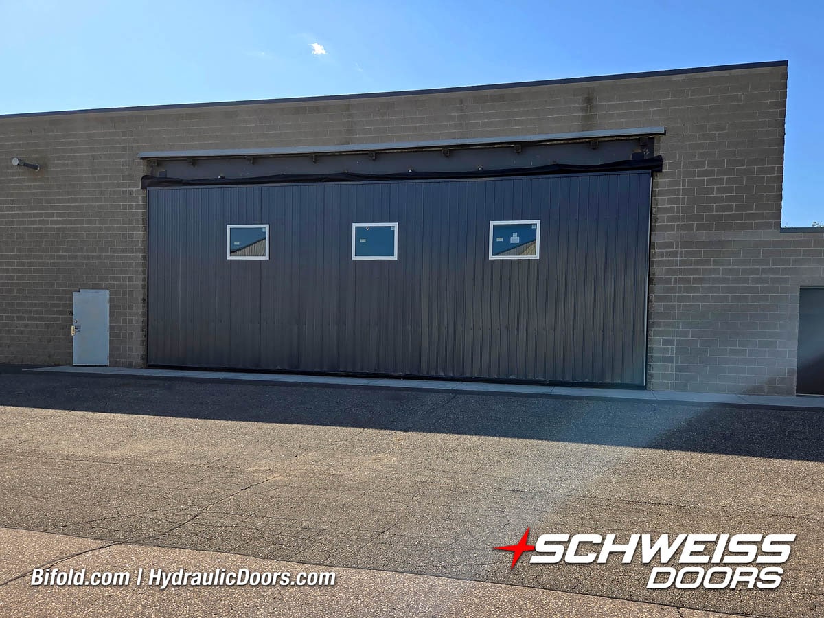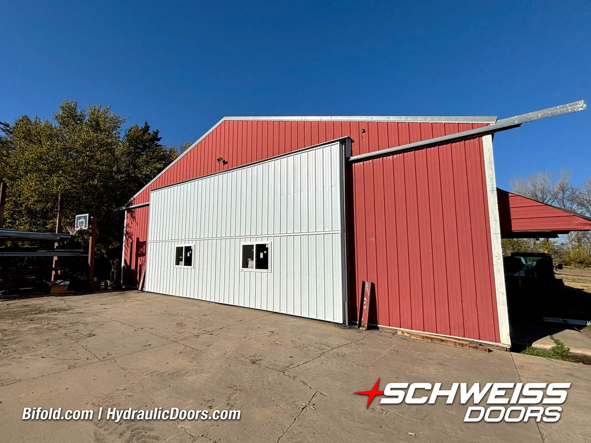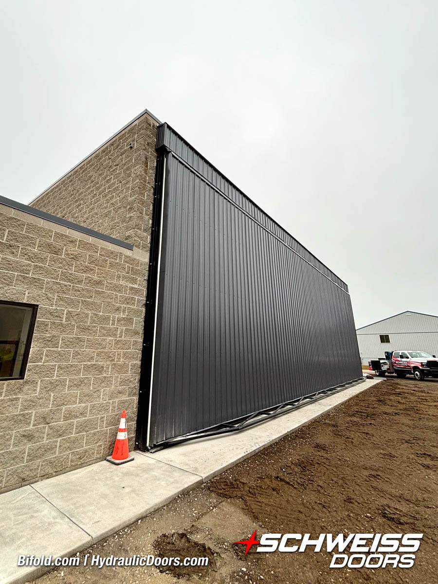 Schweiss liftstrap bifold hangar home door installed on hangar home in Colorado viewed from outside