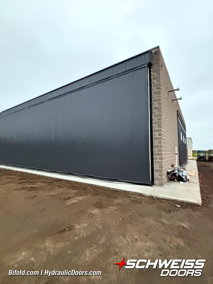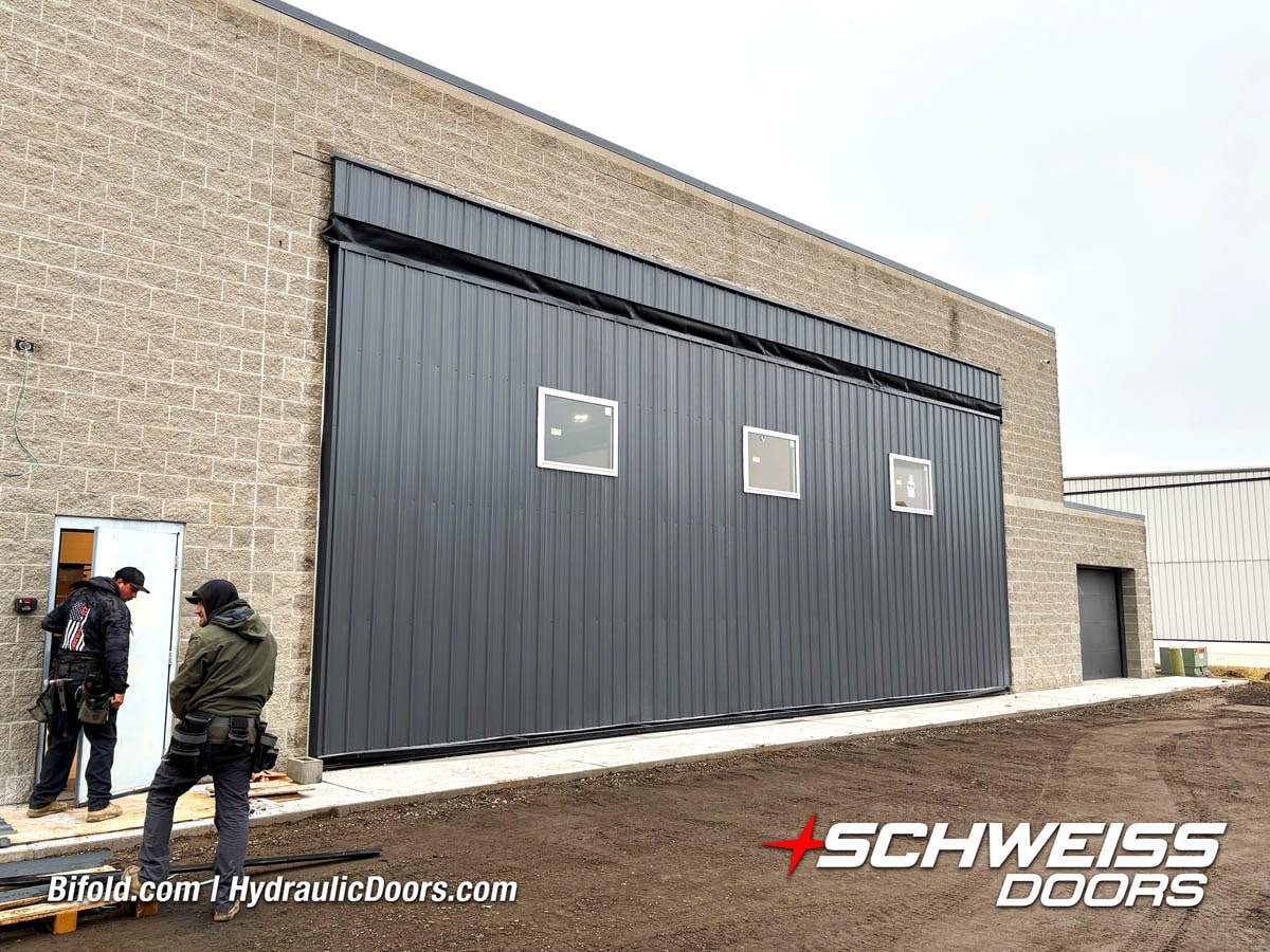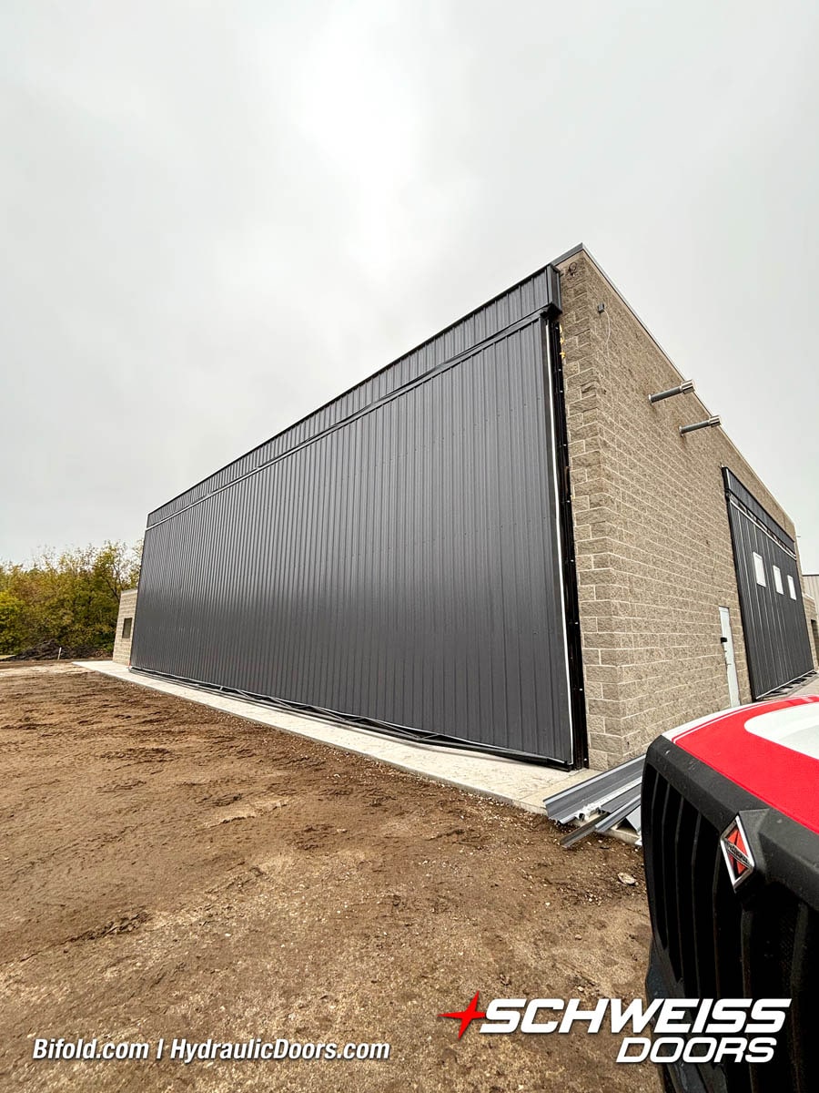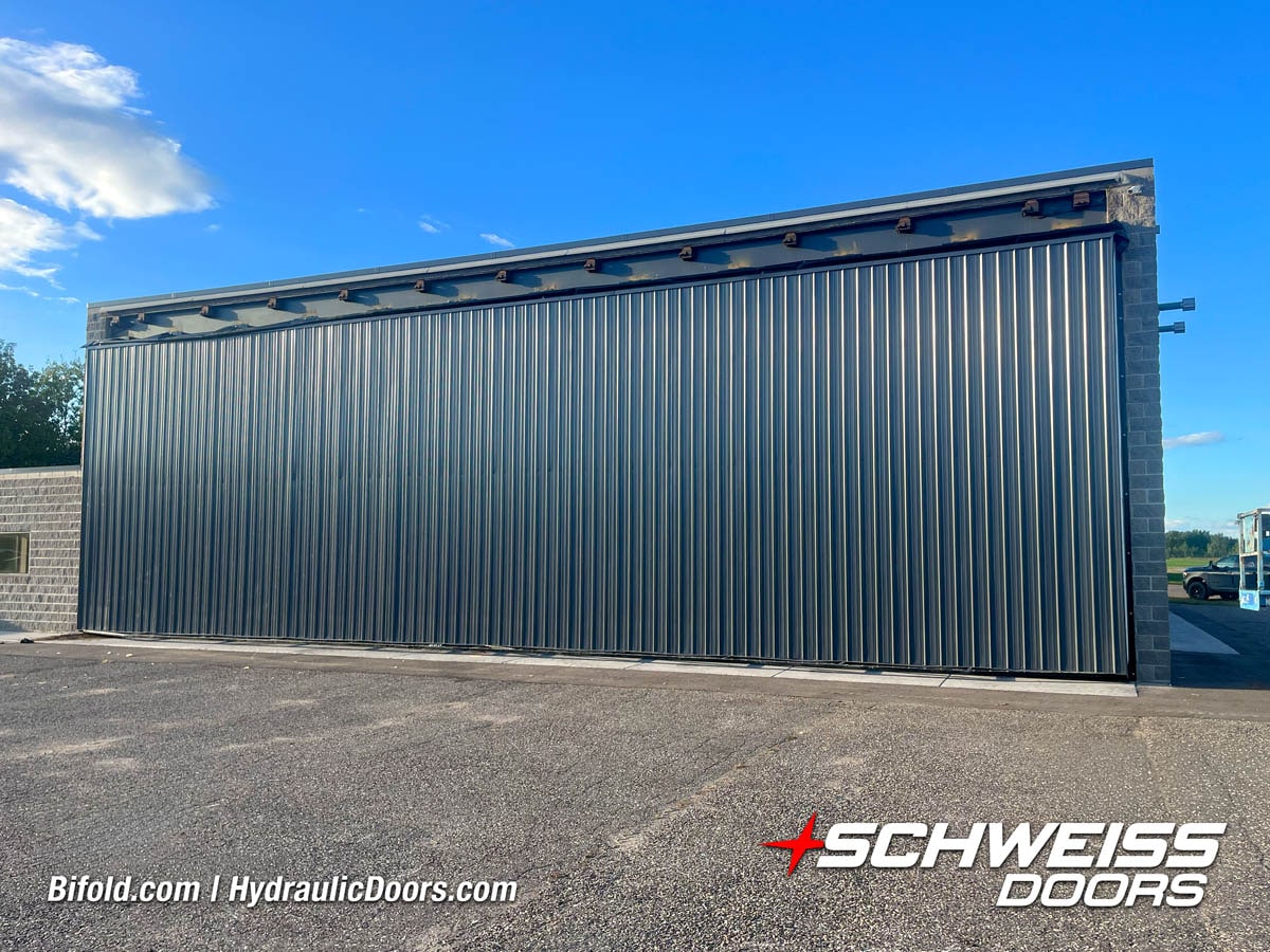 Schweiss liftstrap bifold hangar home door installed on hangar home in Colorado viewed from outside