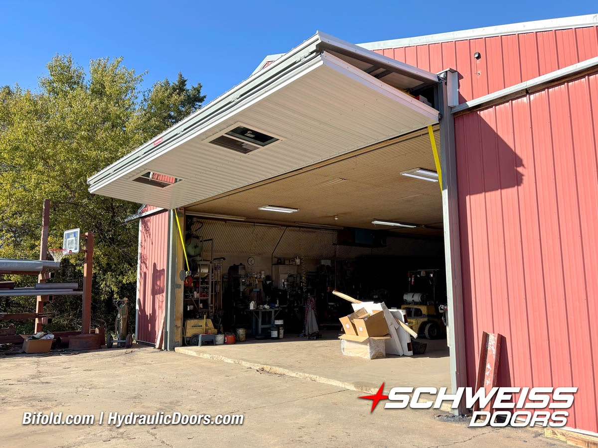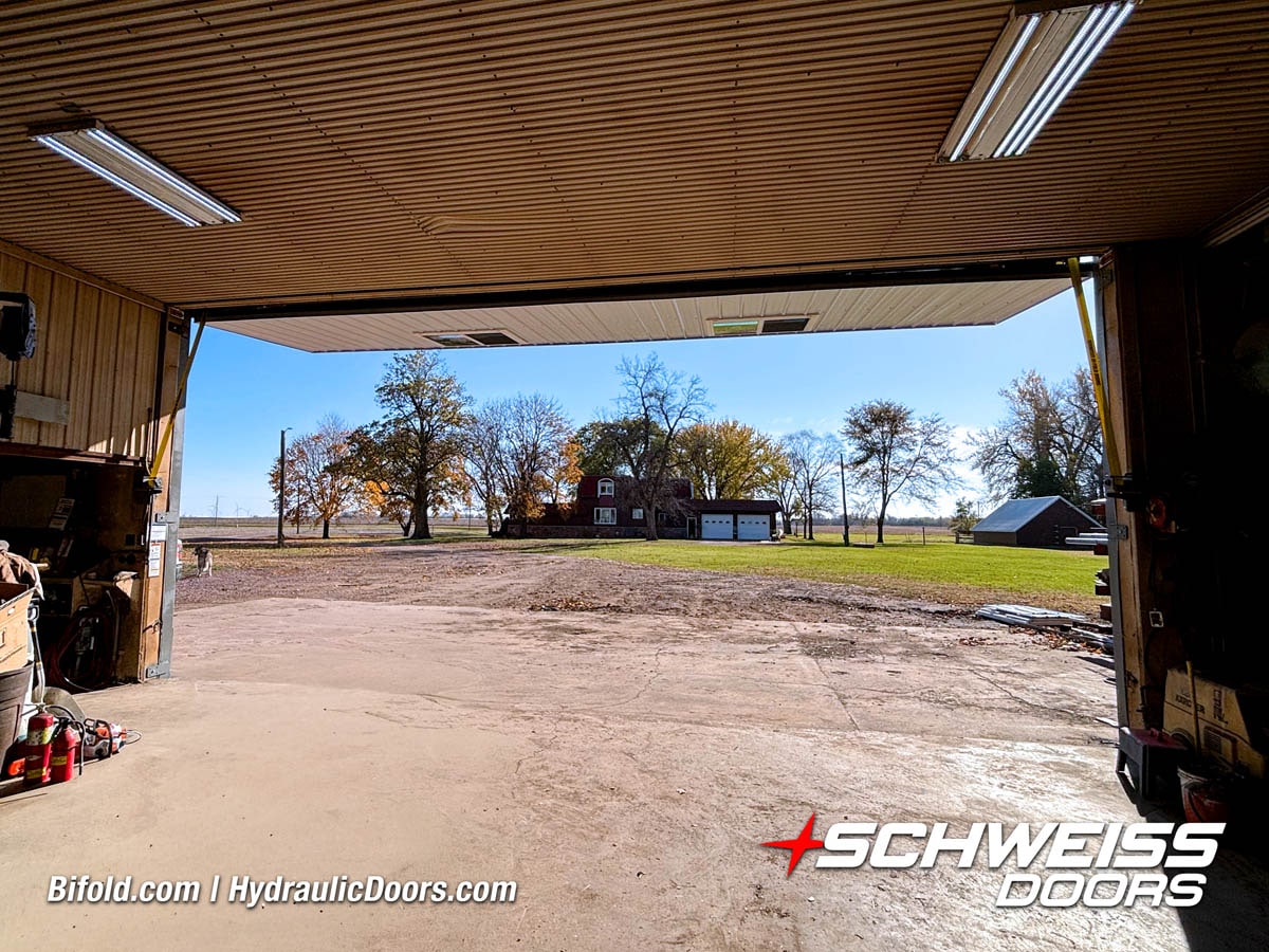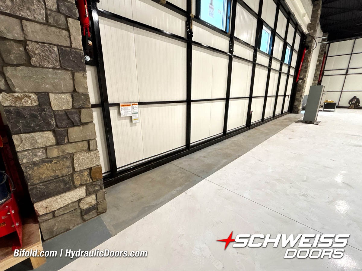 Schweiss residential hydraulic door installed on luxury car garage shown open