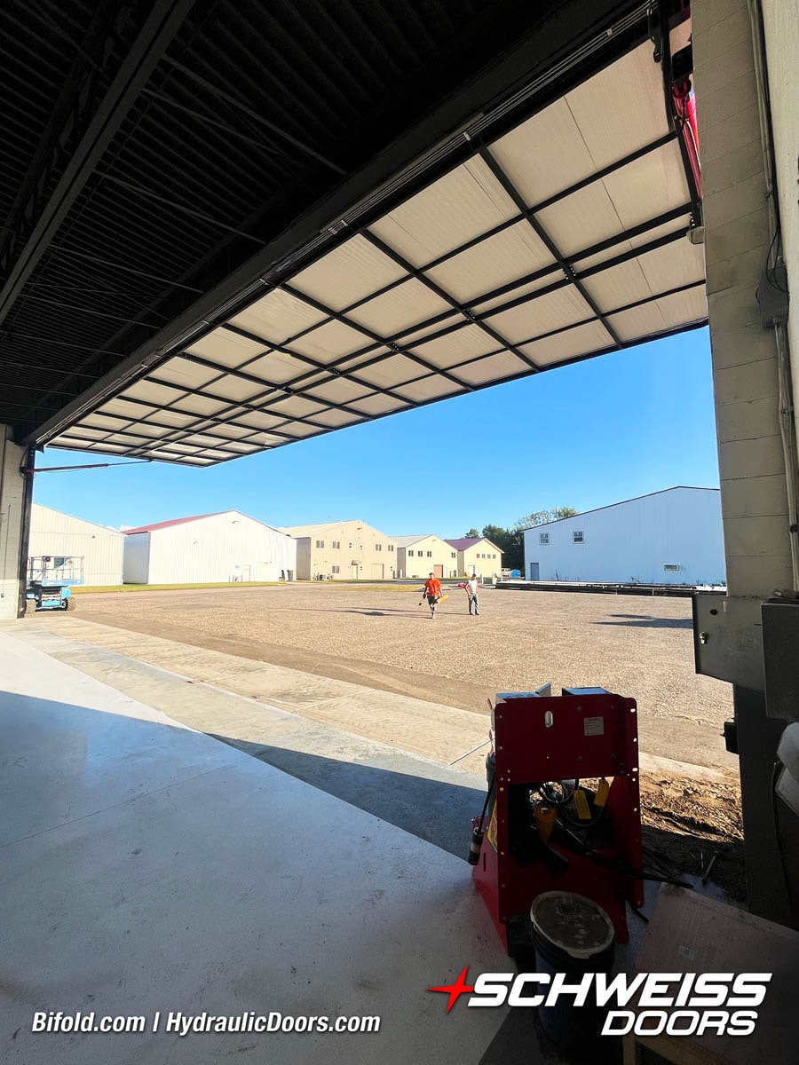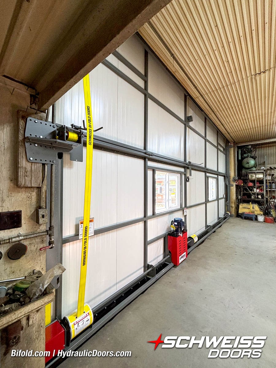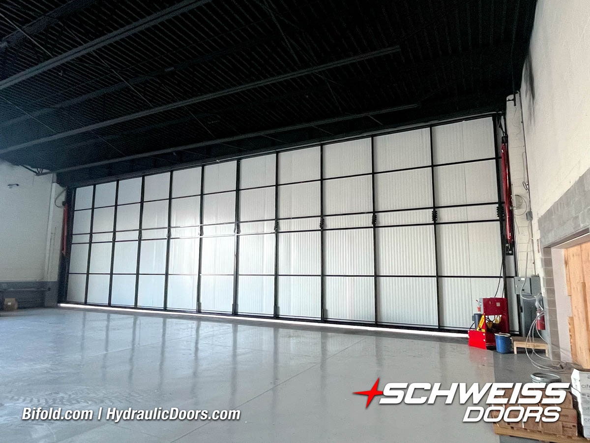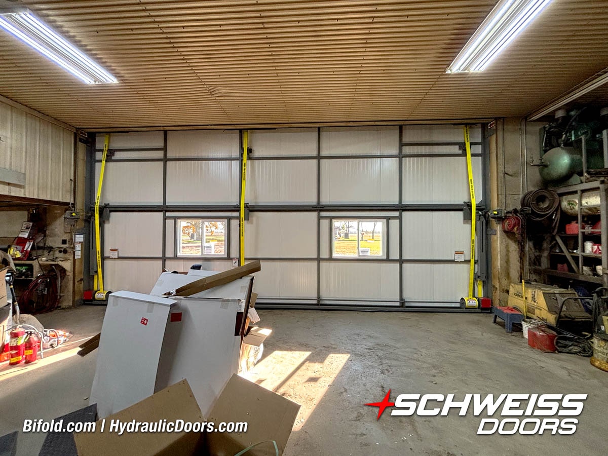 Interior view of Schweiss bifold door installed on a hangar home in Houston shown closed