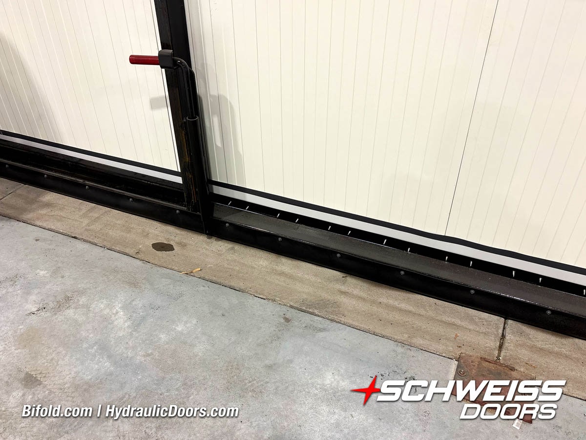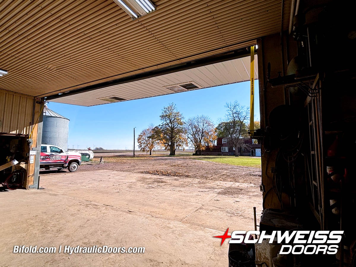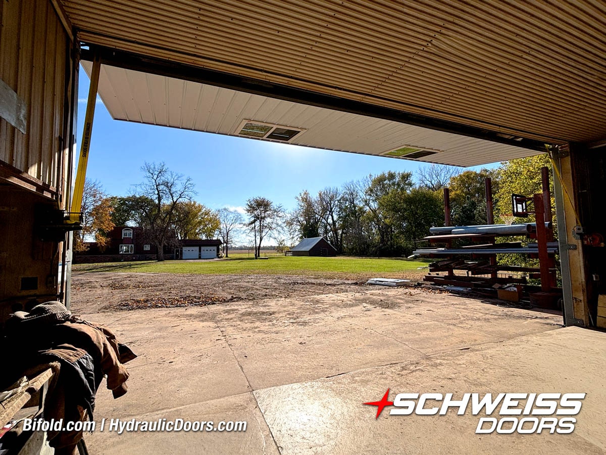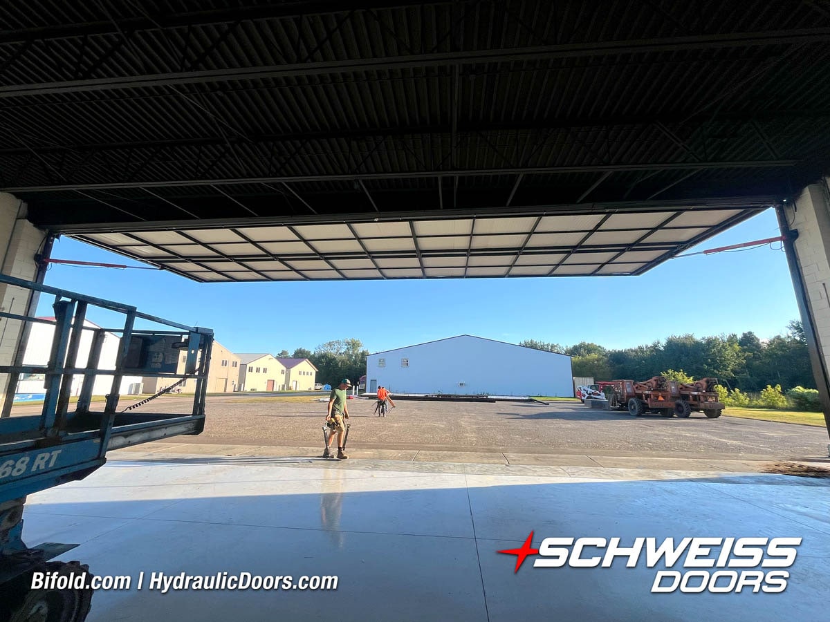 Interior view of Schweiss bifold door installed on a hangar home in Houston shown closed