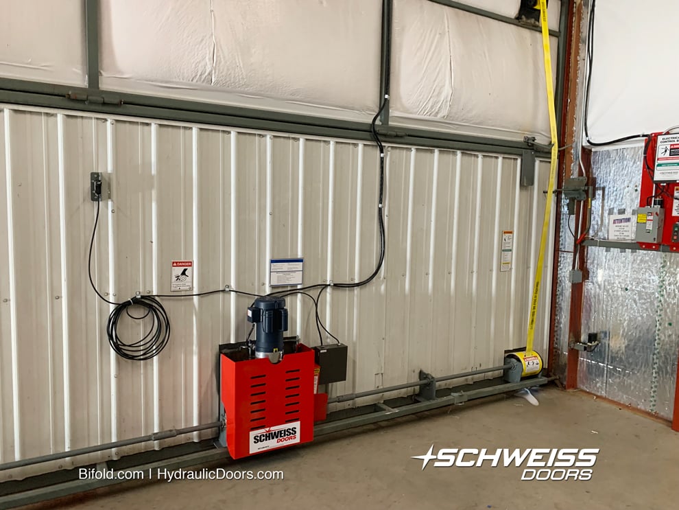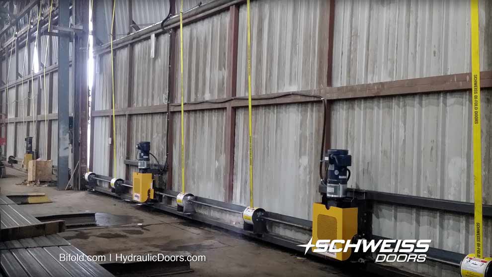 Four strong liftstraps powered by two Schweiss motors now lifts and lowers the bifold door smoother, faster and quietly. The company was having troubles with frayed cables that had to be replaced on several occasions.